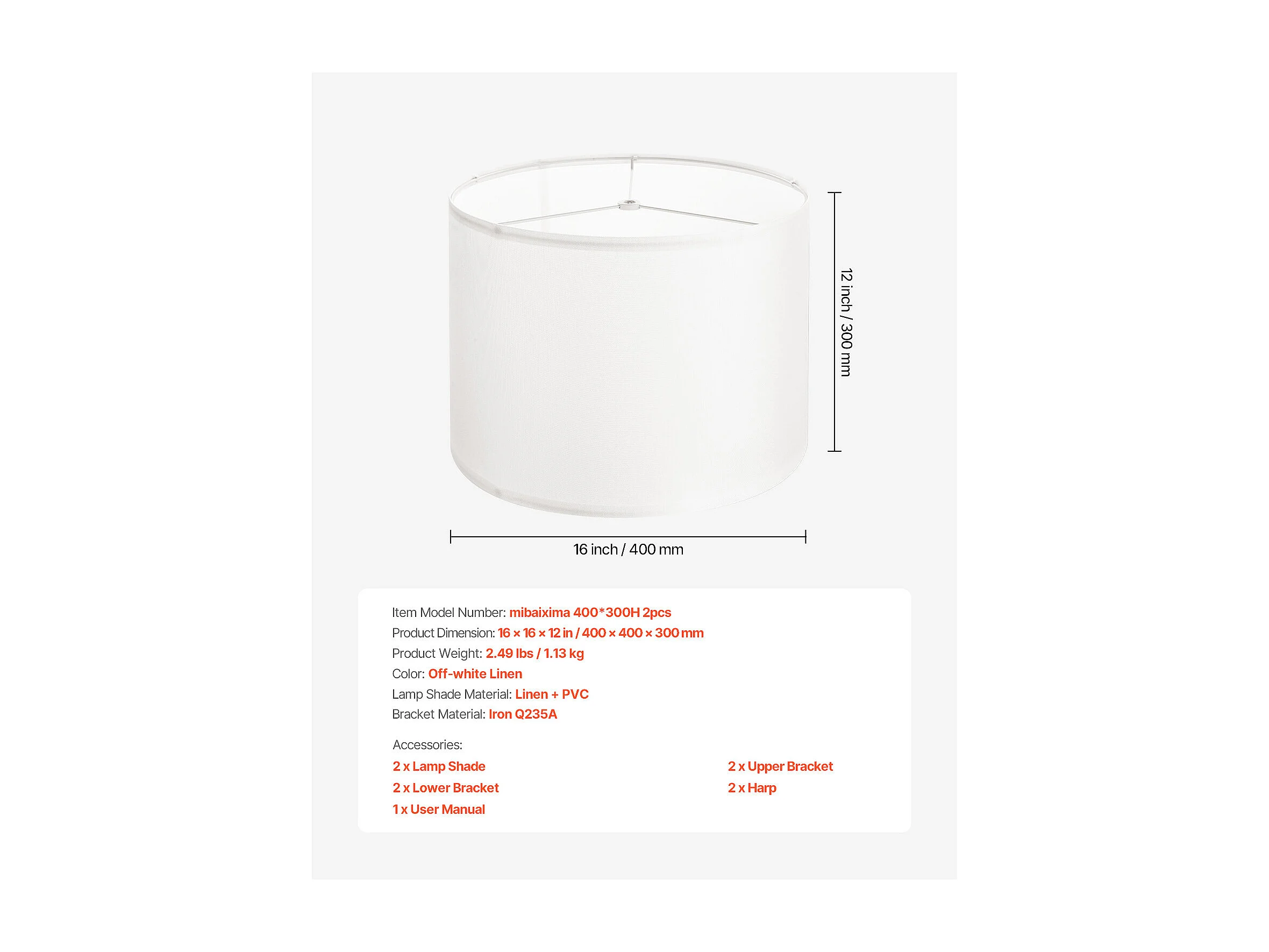 Abat-Jour Tambour SucceBuy, 2 Pcs, 40x40x30 cm, Grand Abat-Jour de Remplacement avec Harpe, pour Lampes de Table, Lampadaires et Suspensions, Lin Blanc Cassé