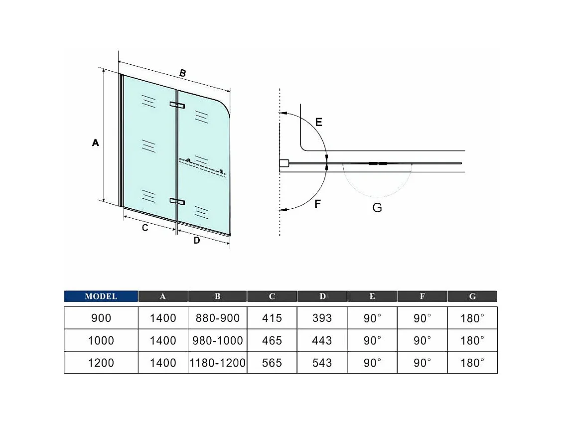 Pare-baignoire pivotant et pliant 100x140cm avec paroi fixe 80x140cm, paroi de baignoire en 6mm verre de sécurité