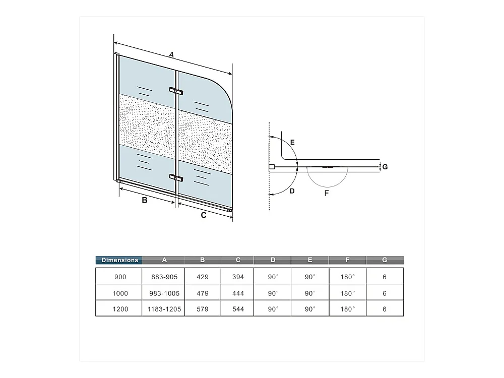 Pare-baignoire 120x140cm pivotant et pliant, paroi de baignoire installé à gauche en verre anticalcaire et sablé au centre