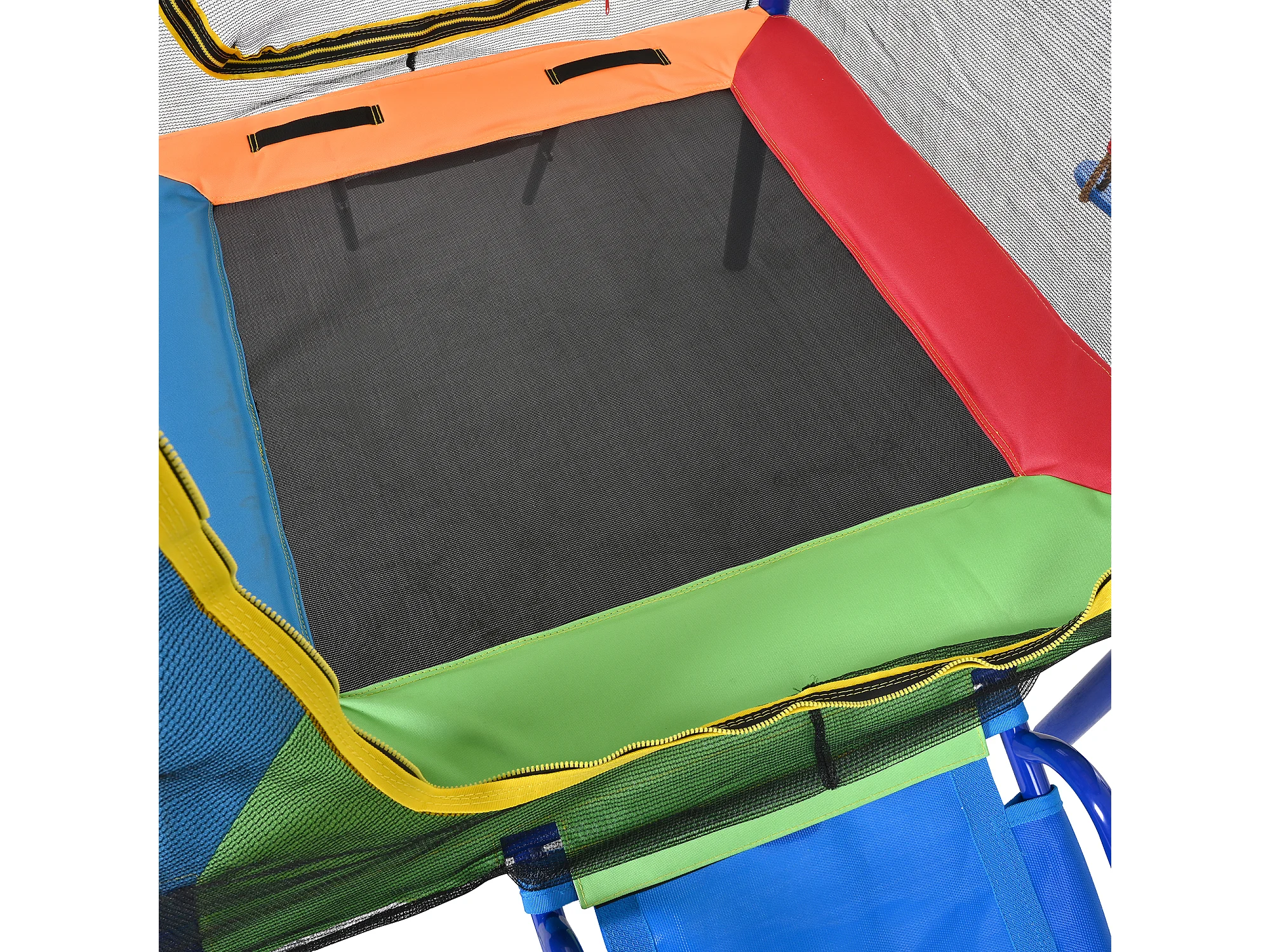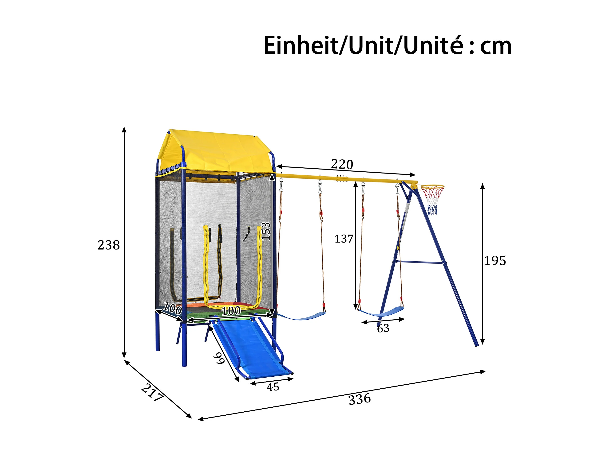 Aire de Jeux de Jardin 4-en-1 : Portique avec Trampoline Sécurisé, Toboggan, Double Balançoire et Panier de Basket - Structure Acier Renforcé - Bleu