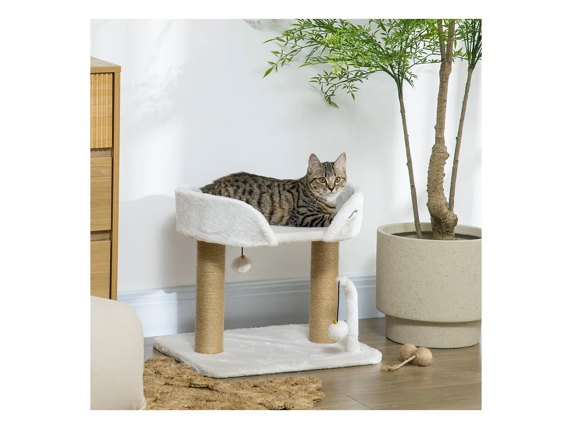 Arbre à chat 2 griffoirs jute naturelle panier jeu 2 boules suspendues avec clochettes peluche blanche