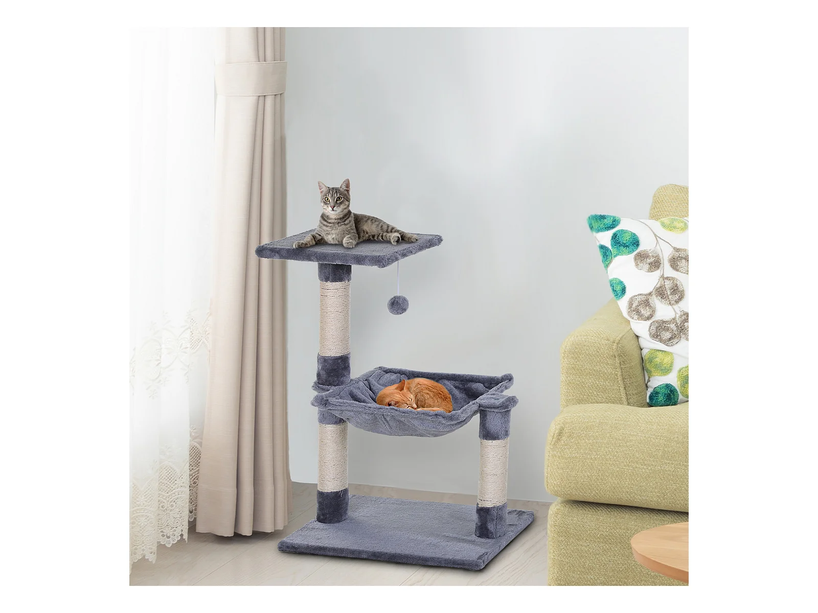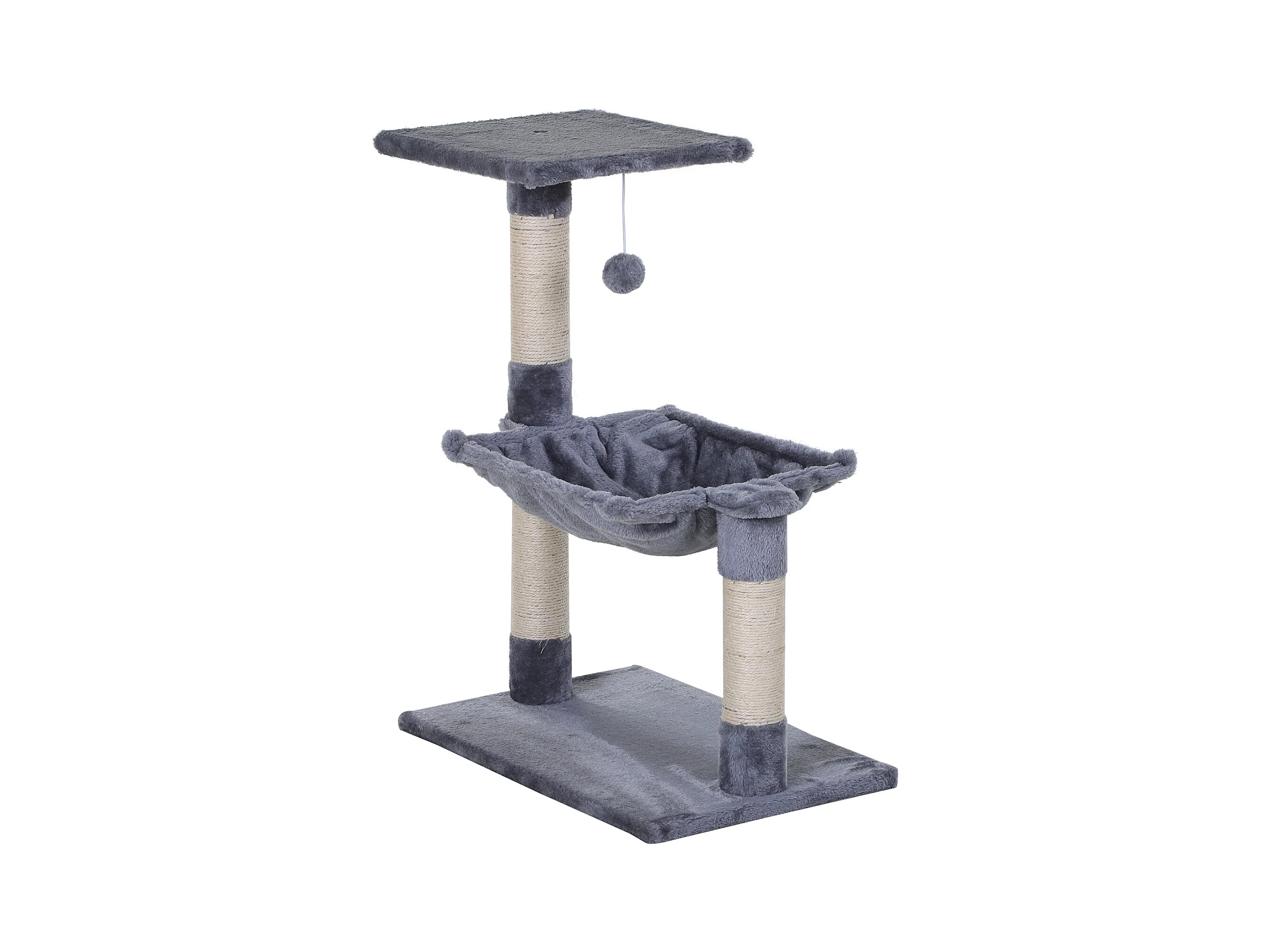 Arbre à chat 3 griffoirs grattoirs sisal naturel plateforme hamac et boule suspendue dim. 50L x 36l x 70H cm peluche haute densité 220 g/m² gris
