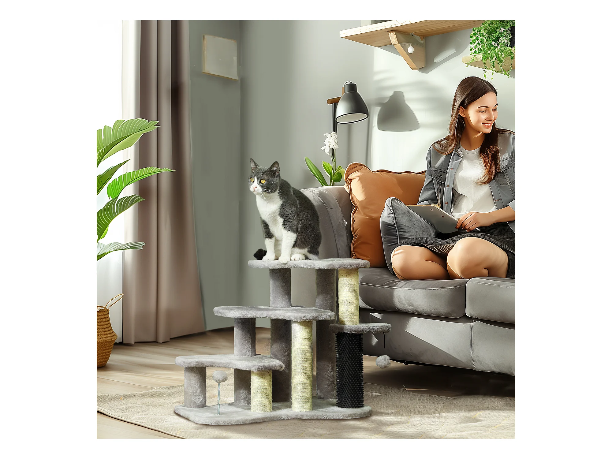 Arbre à chat 3 marches 3 griffoirs bande massante 2 jeux boules peluche gris clair