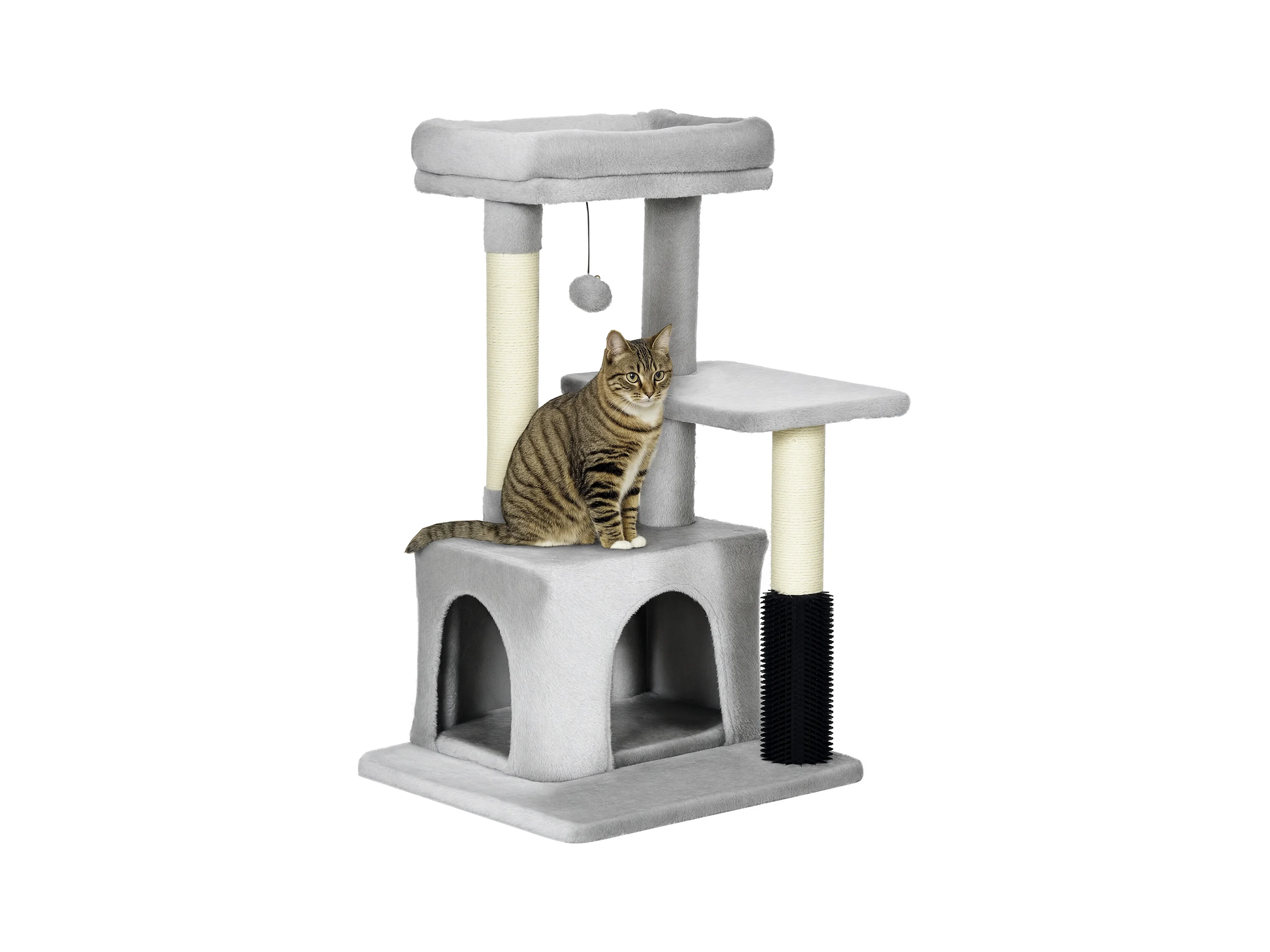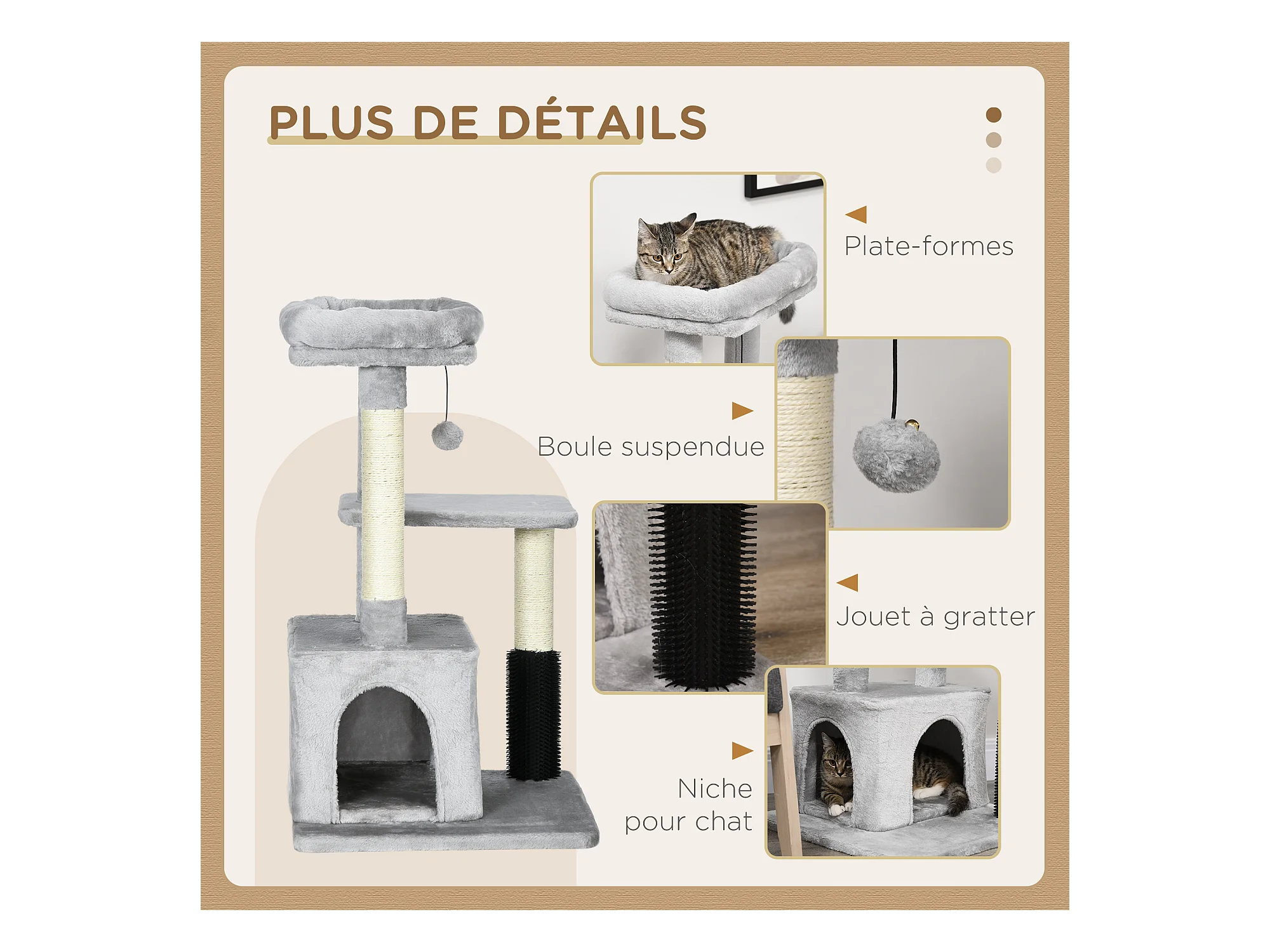 Arbre à chat H.104 cm - griffoir, grattoir, bande massante, jeux boules, niche, plateforme observation - gris