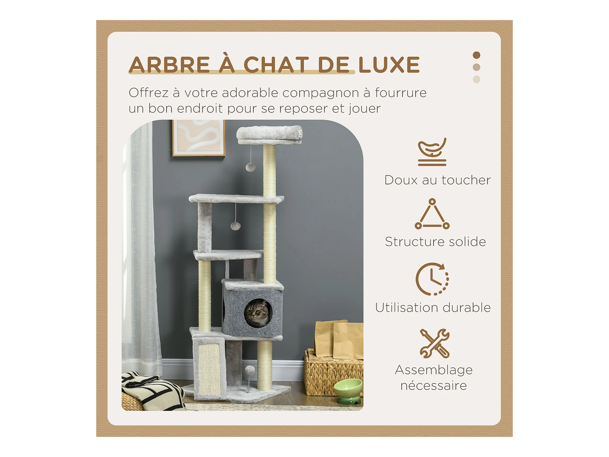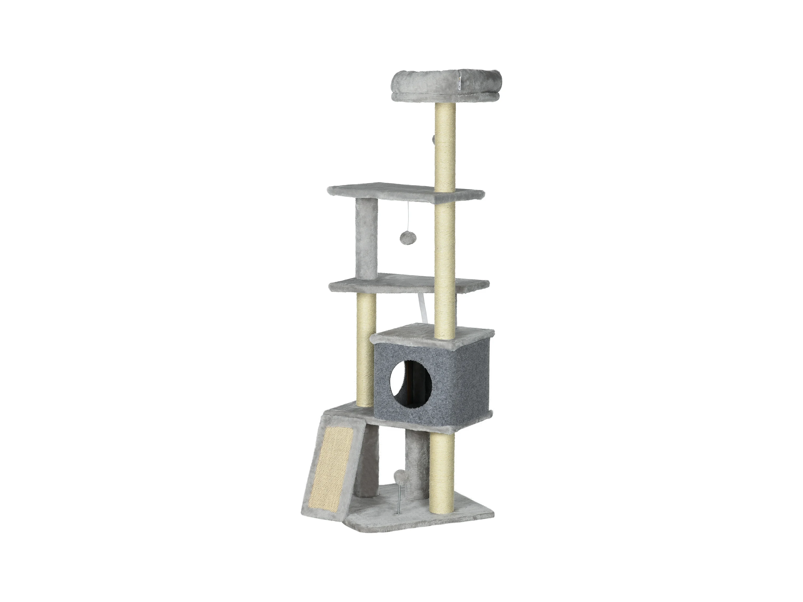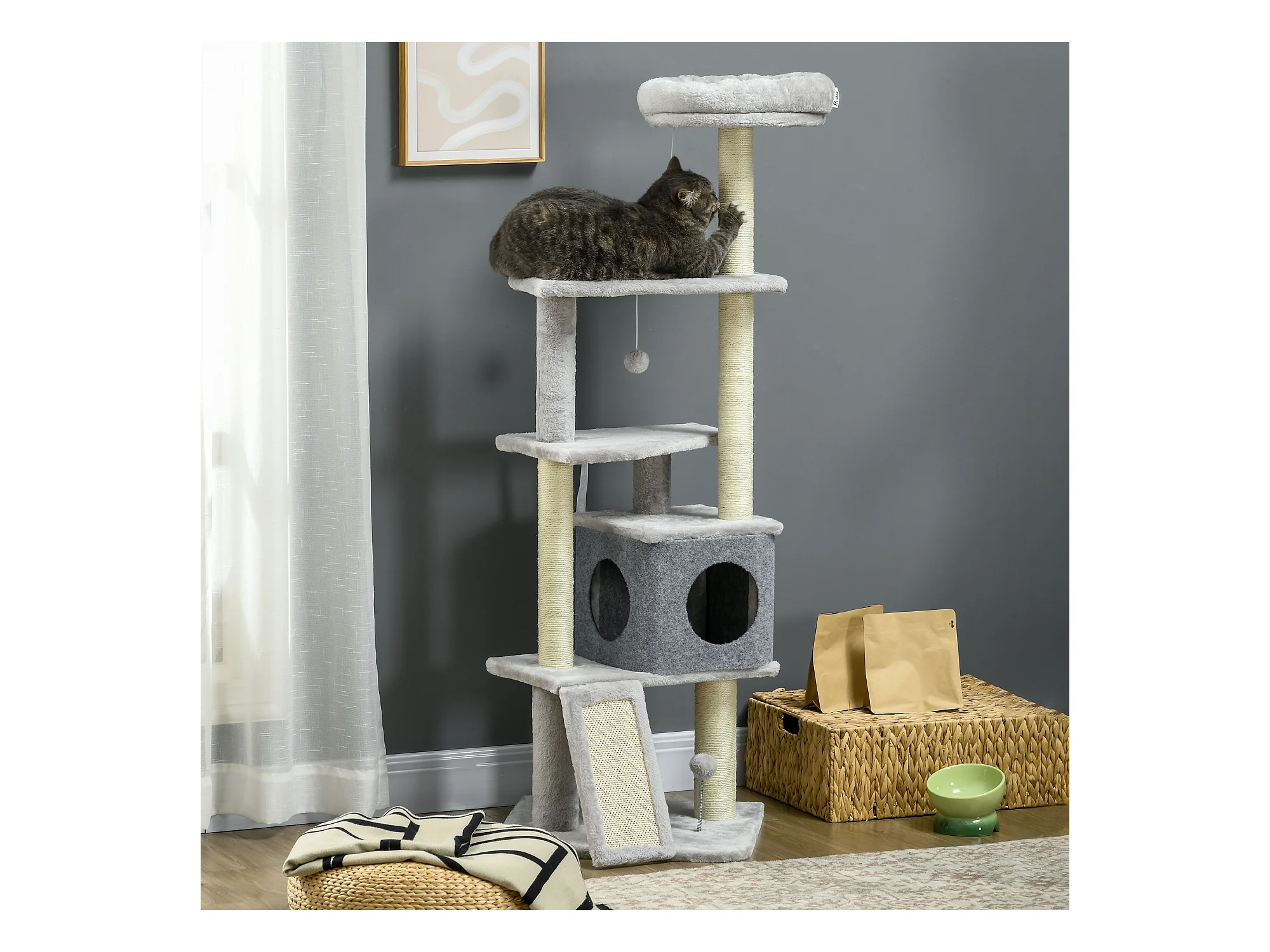 PawHut Arbre à Chats avec Griffoir Niche Poteaux Peluche Haute Densité 45L x 40L x 148H cm Gris