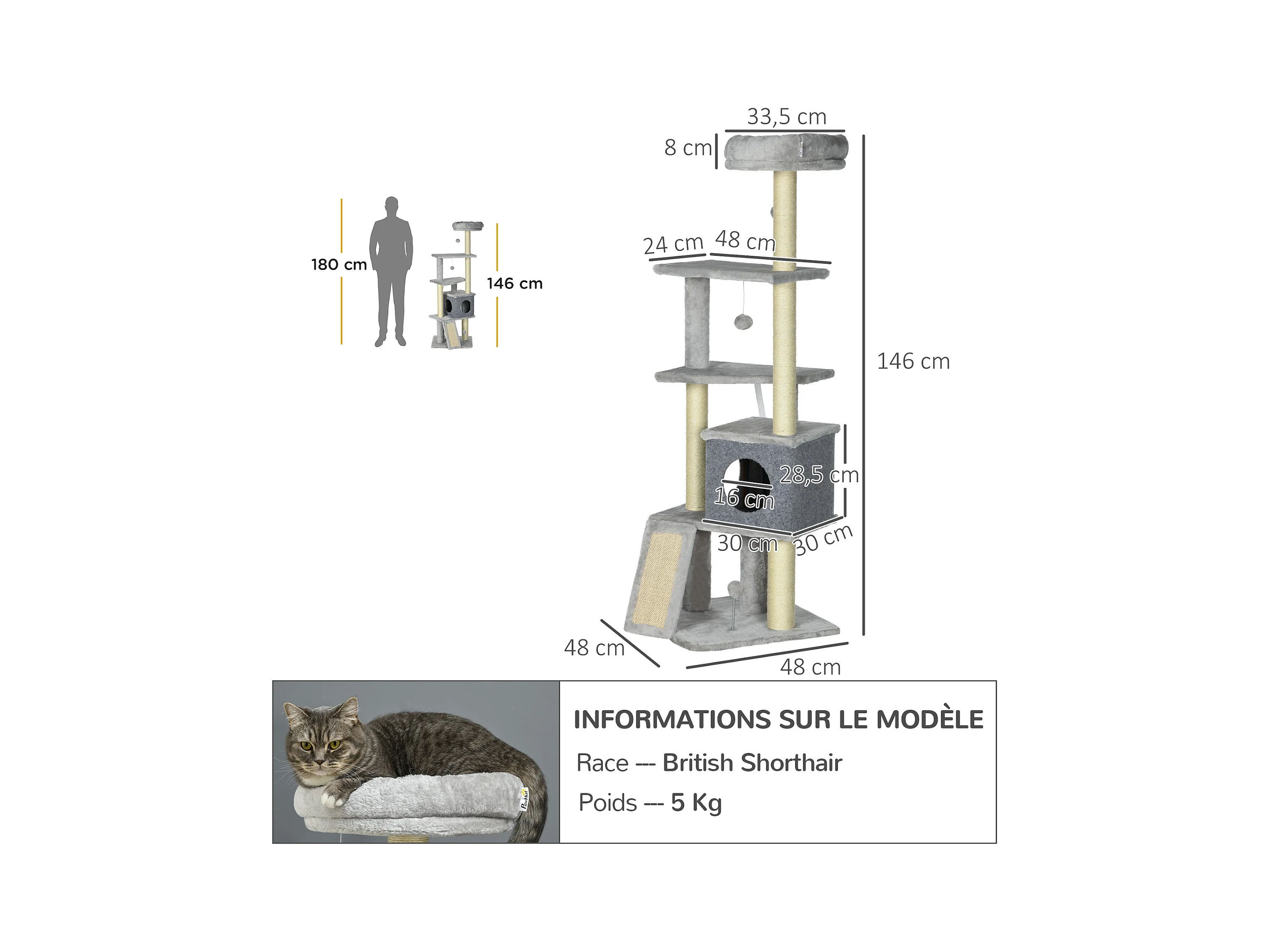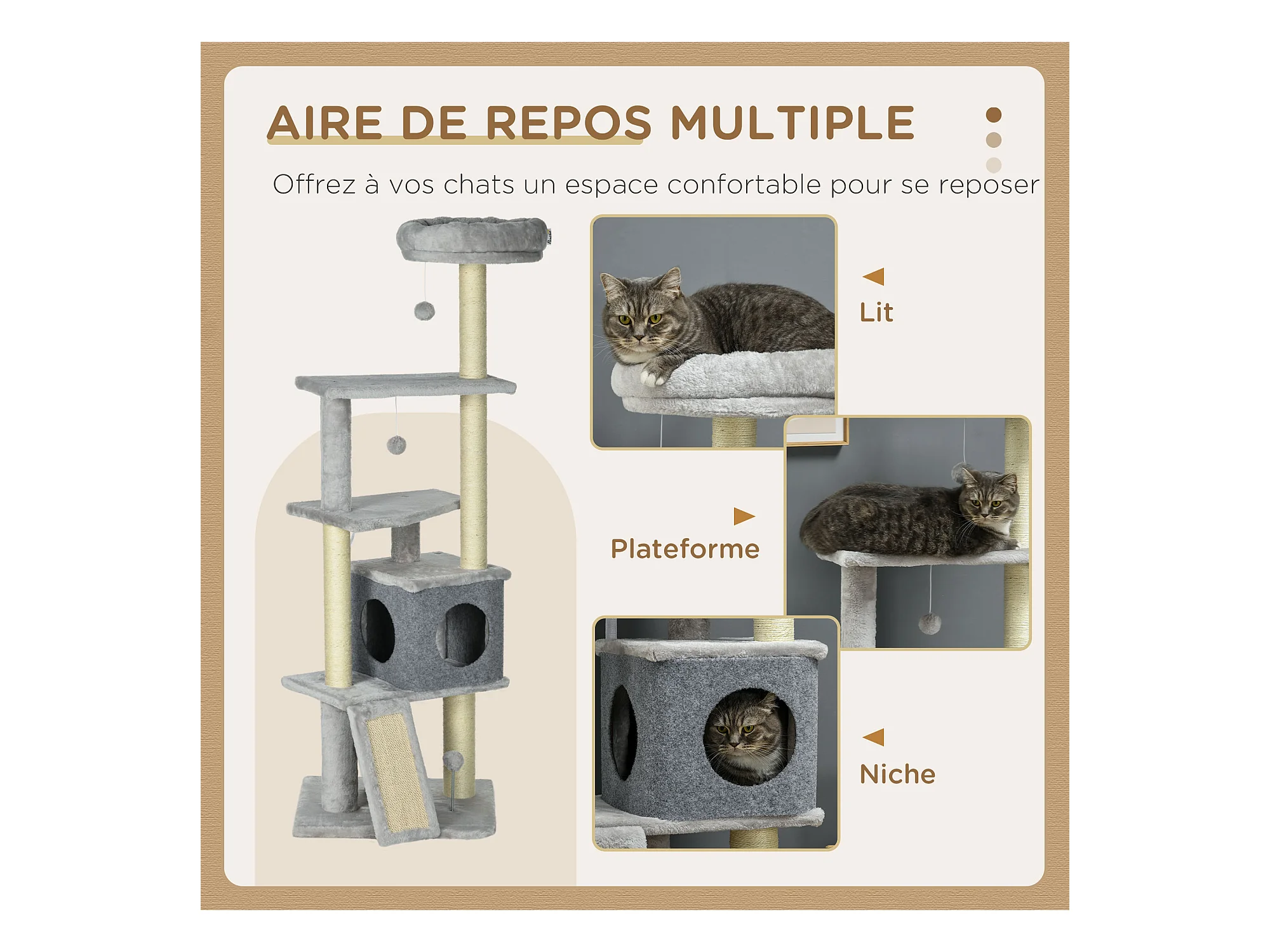 Arbre à chat griffoirs sisal naturel et massant grande niche plateforme panier jeu boule suspendue peluche gris