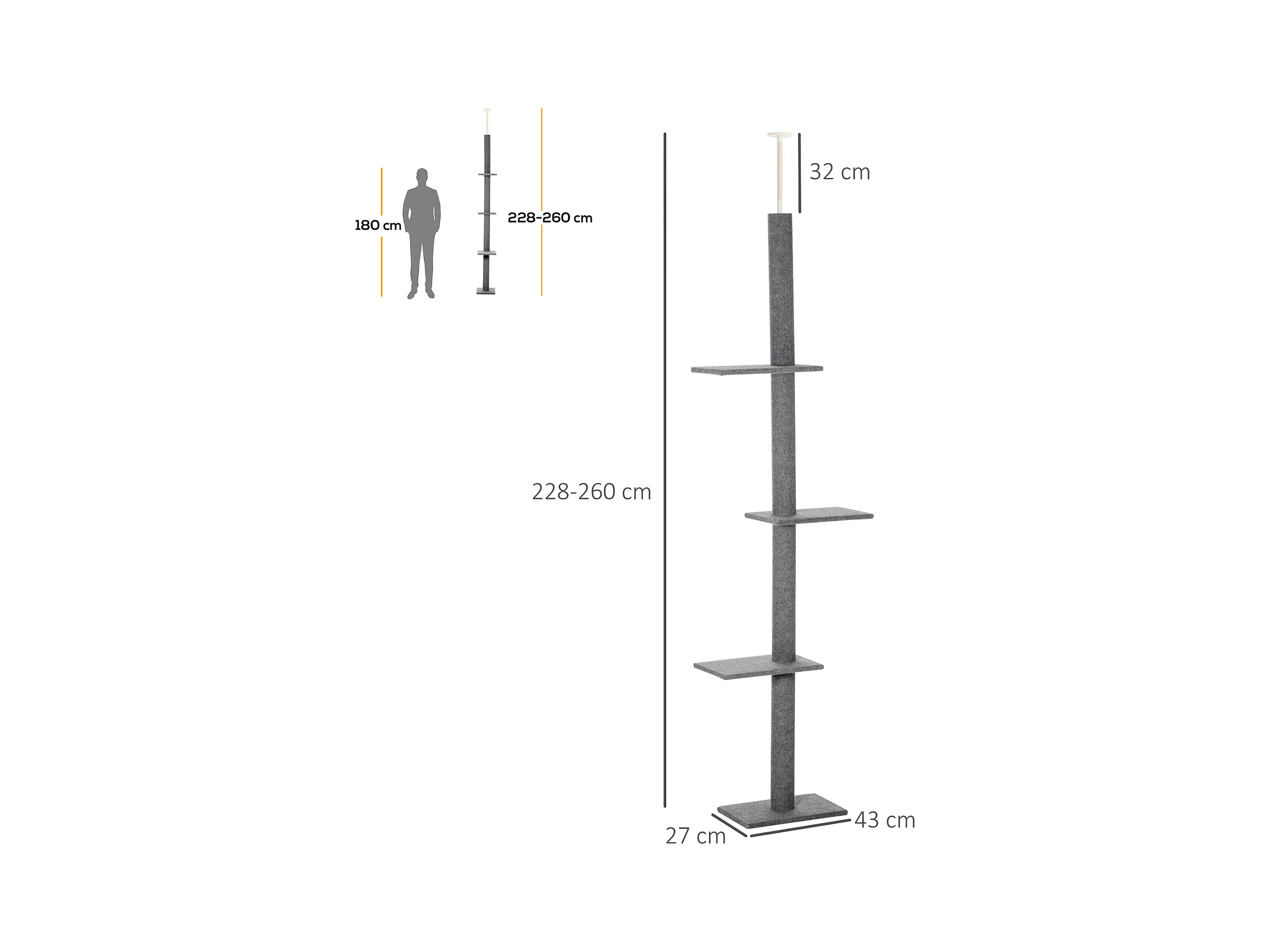 Arbre à chat poteau à griffer hauteur réglable dim. 43L x 27I x 228-260H cm 4 niveaux d'activités gris clair