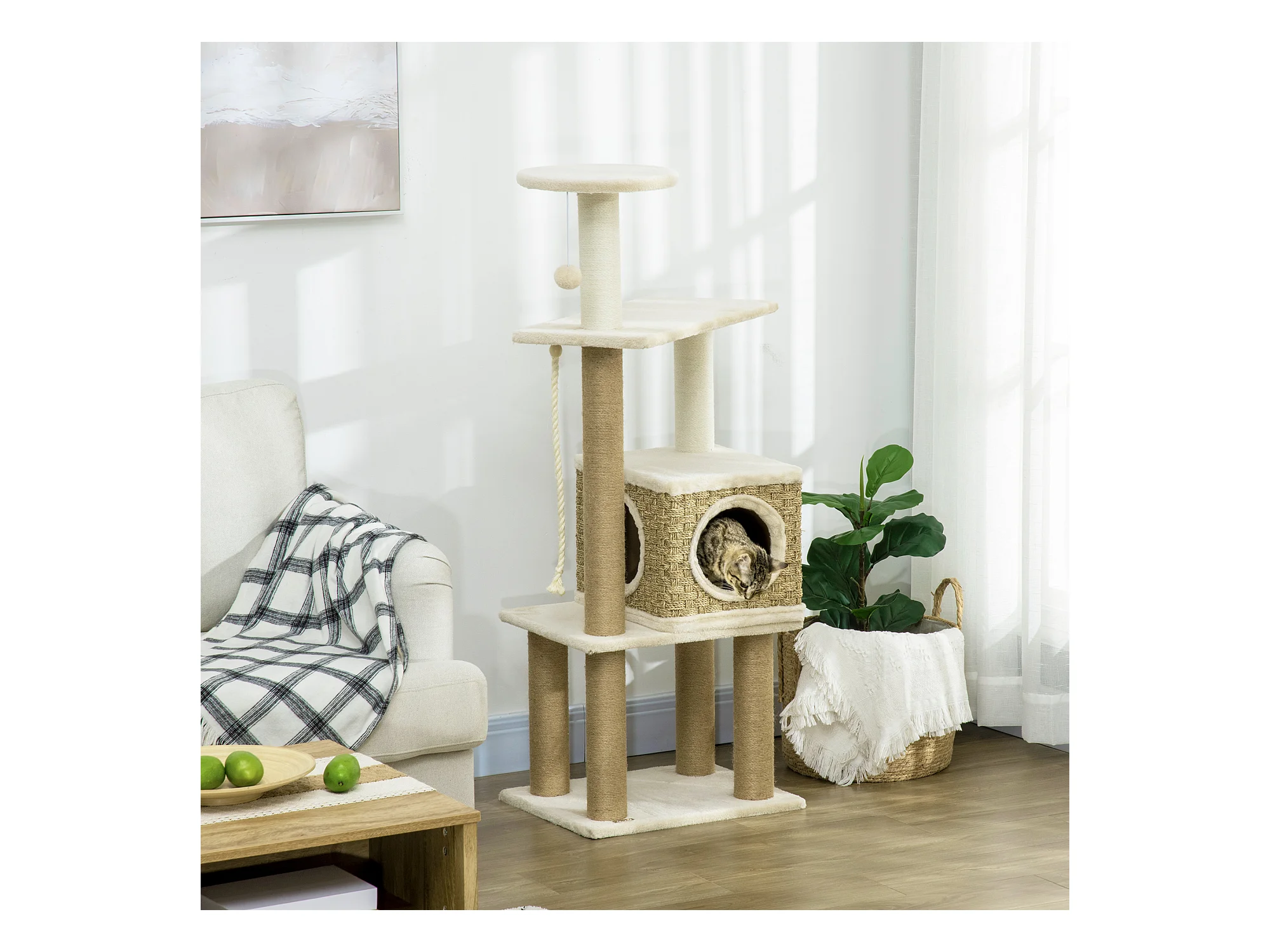 Arbre à chat style cosy chic griffoirs sisal naturel niche plateformes corde jeu boule peluche courte cordes d'algues tressées
