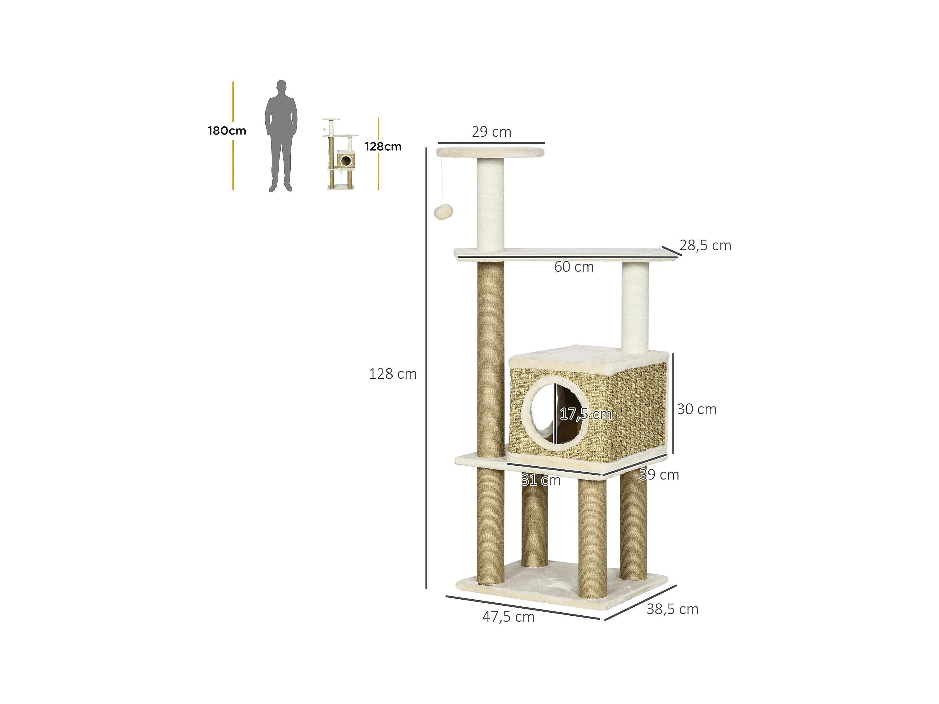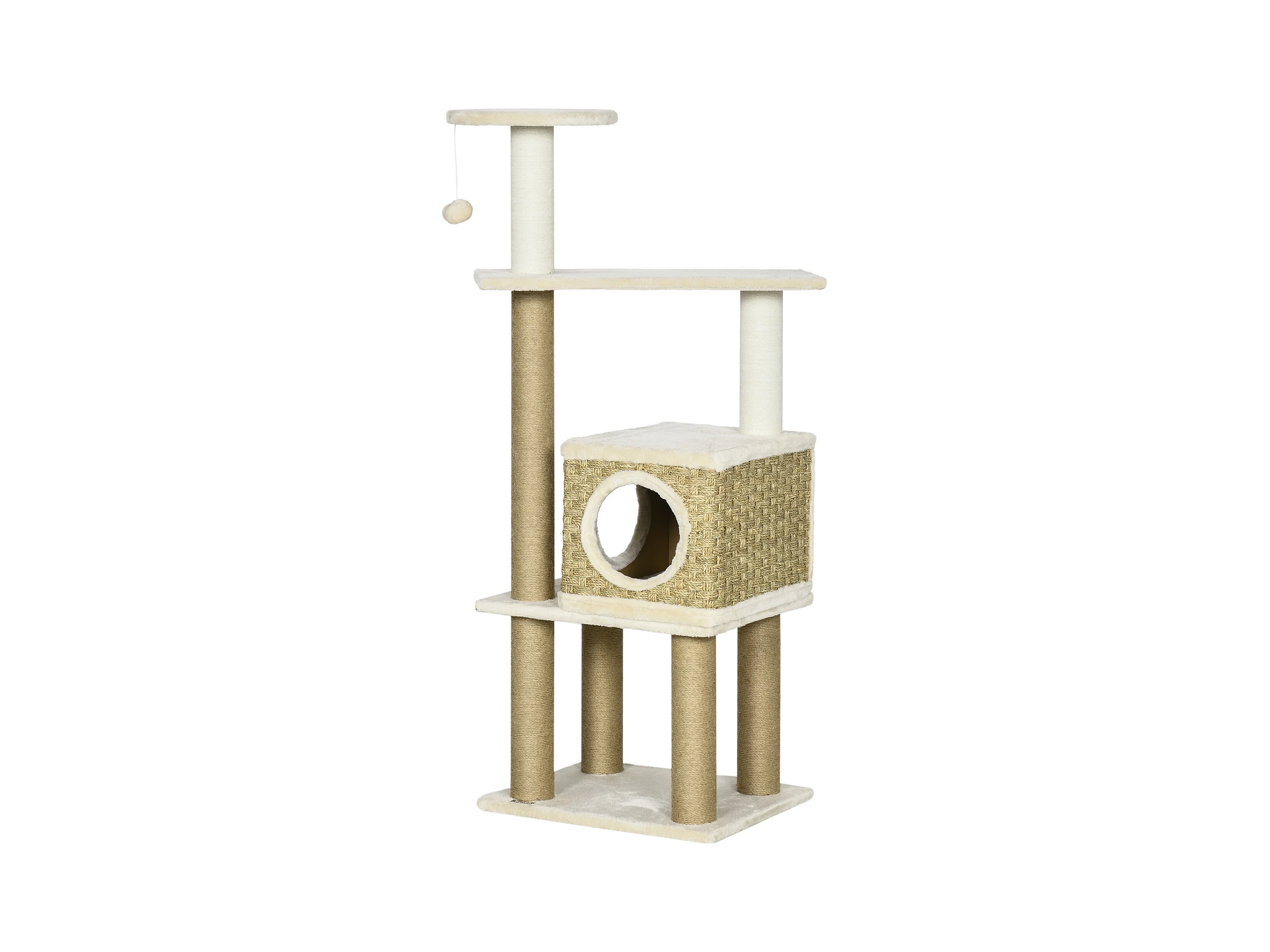 Arbre à chat griffoir grattoir design jeu boule suspendue + plateforme peluche sisal naturel beige