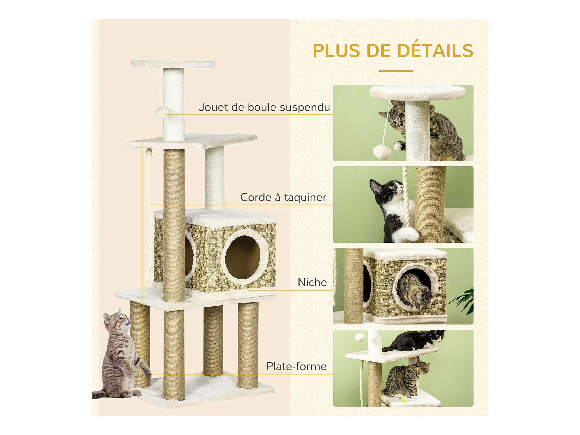 Arbre à chats multi-équipements griffoirs grattoirs plateformes niche corde jouets 40L x 40l x 114H cm beige