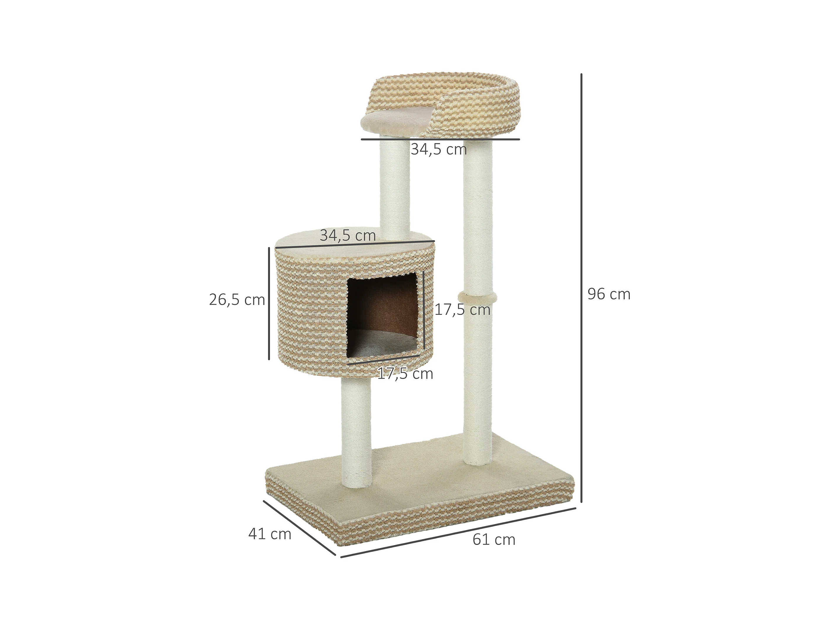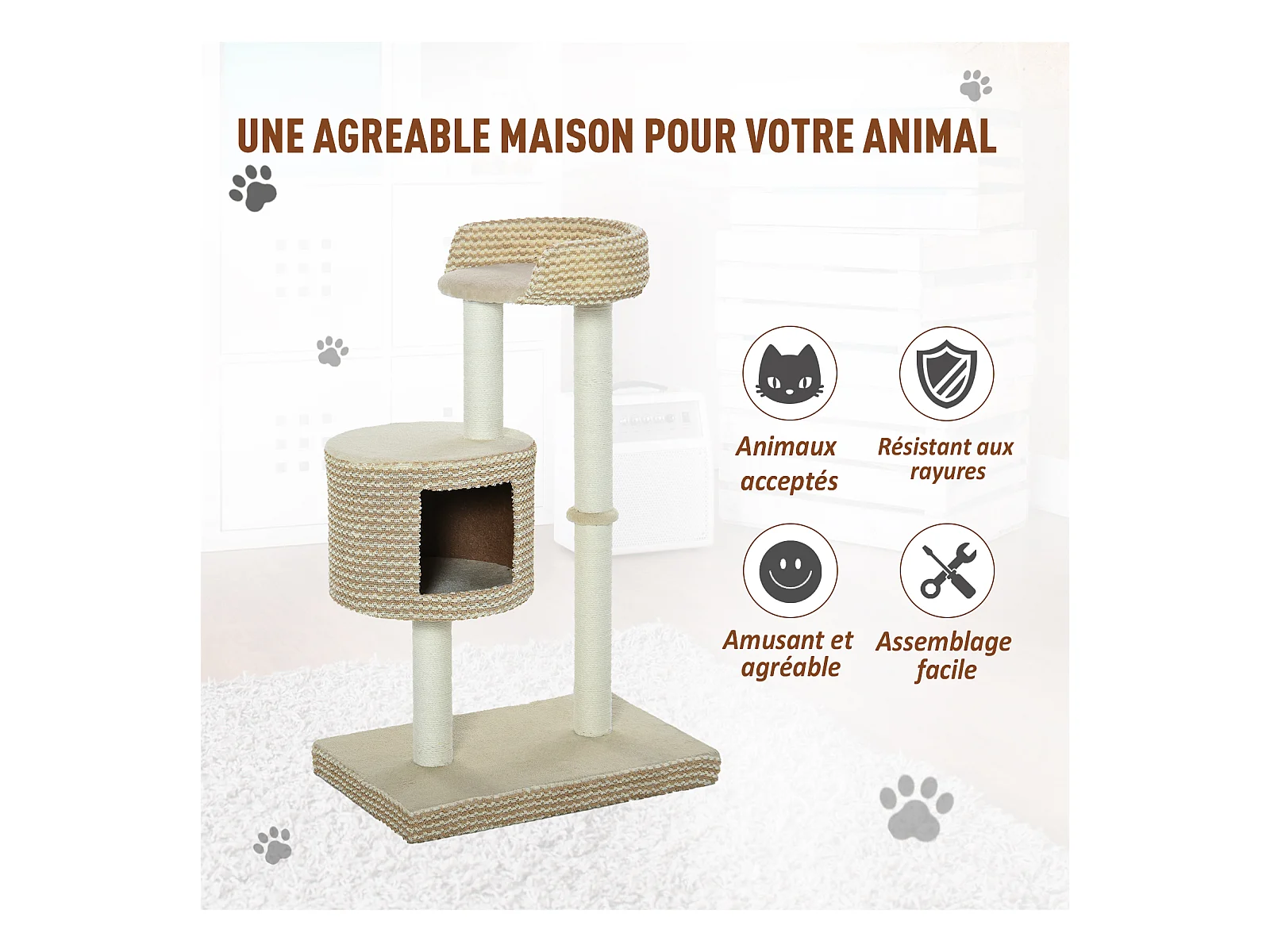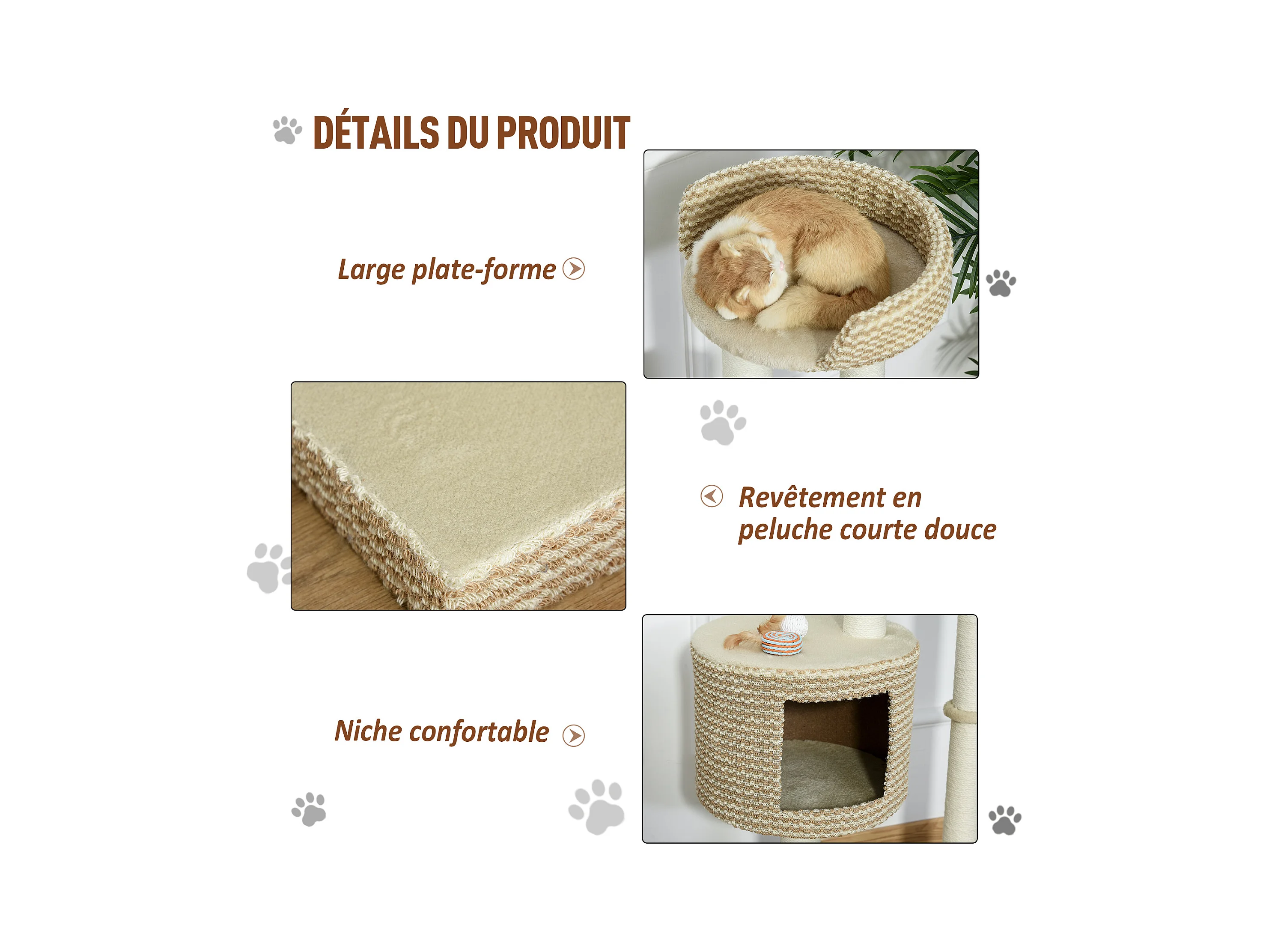 Arbre à chat multi-équipement griffoirs grattoirs niche hamac panier coussins amovibles H126 cm peluche courte sisal naturel beige