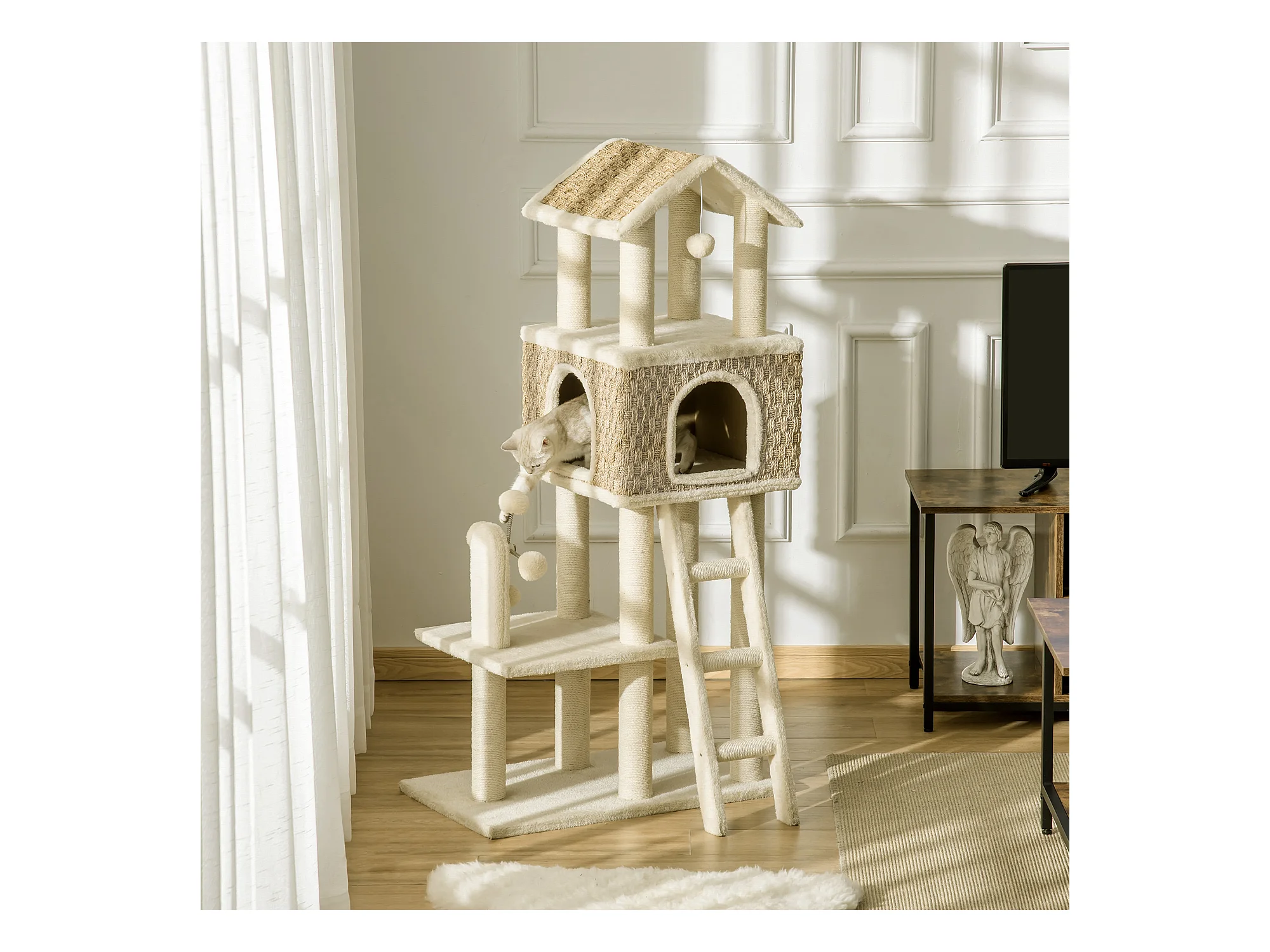 PawHut Arbre à Chats avec Griffoir Niche Poteaux Peluche Haute Densité 45L x 40L x 148H cm Beige