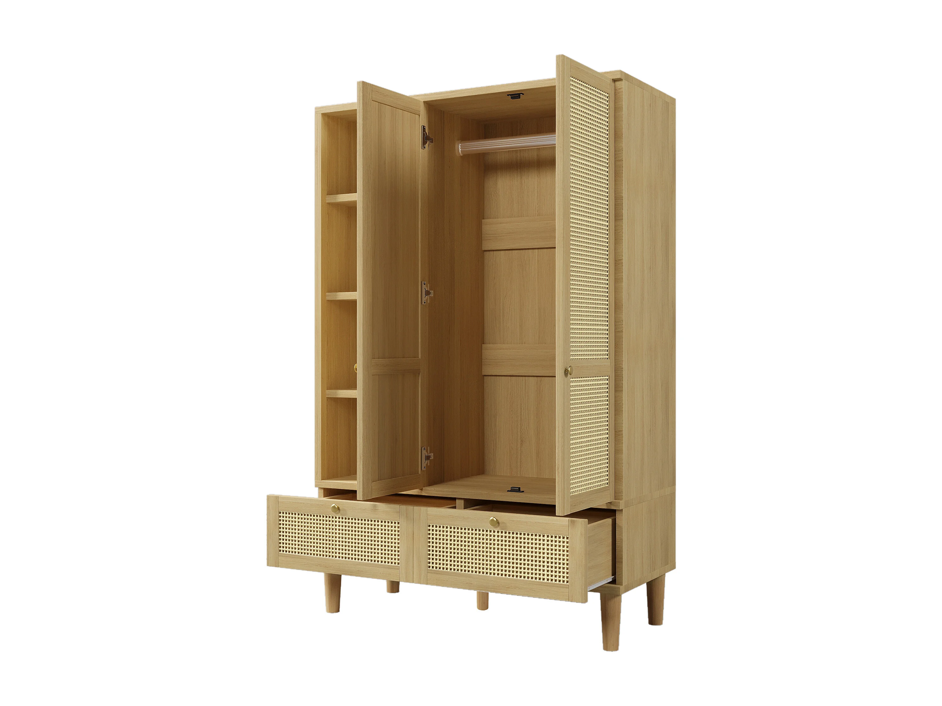 Armoire 120x50x180cm avec etagères ouvertes portants tringle à vêtements 2 tiroirs tressage de rotin Couleur naturelle
