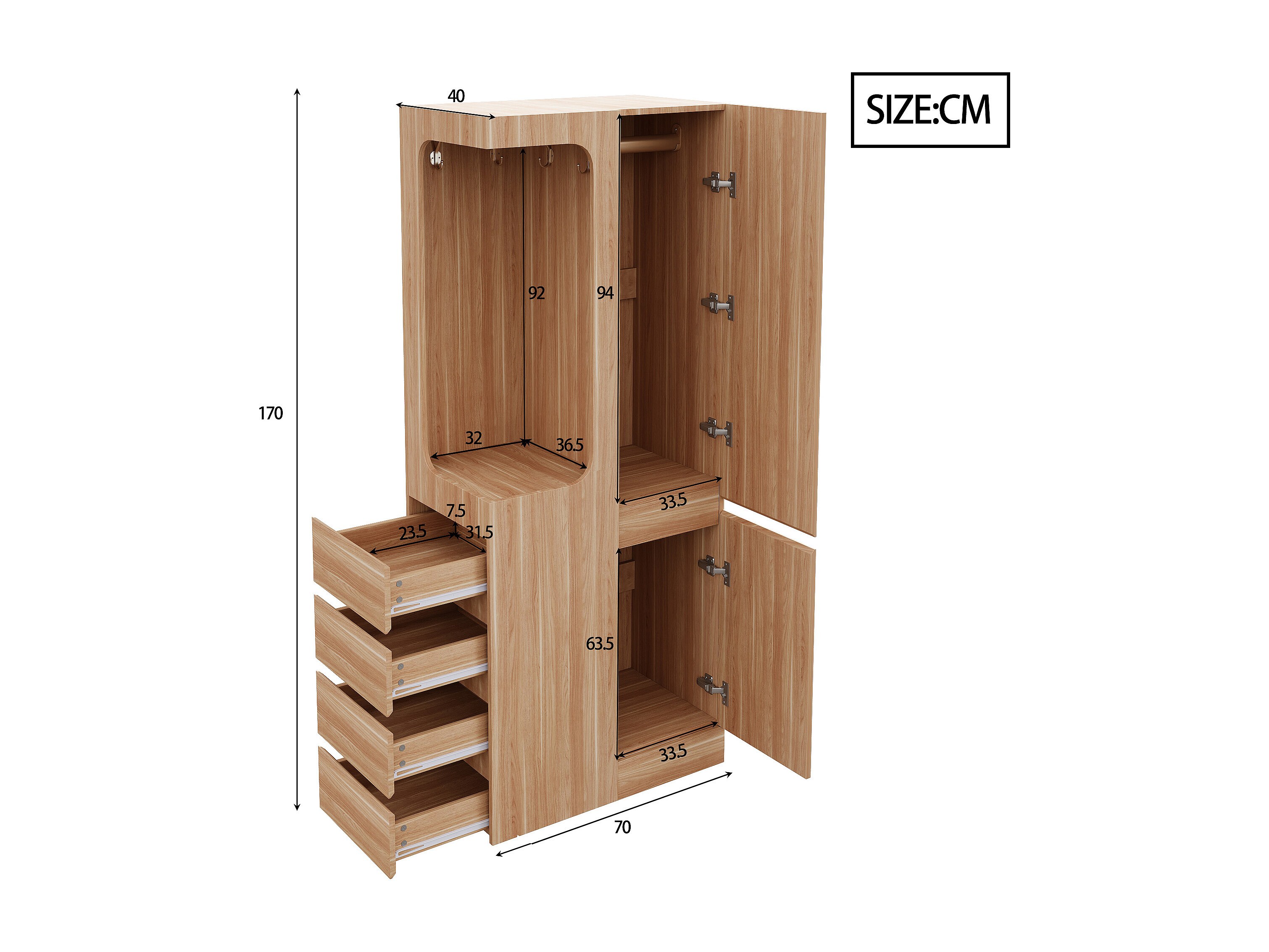Armoire 70x40x170 cm - avec 4 tiroirs - avec 2 portes - avec compartiments de rangement - naturel