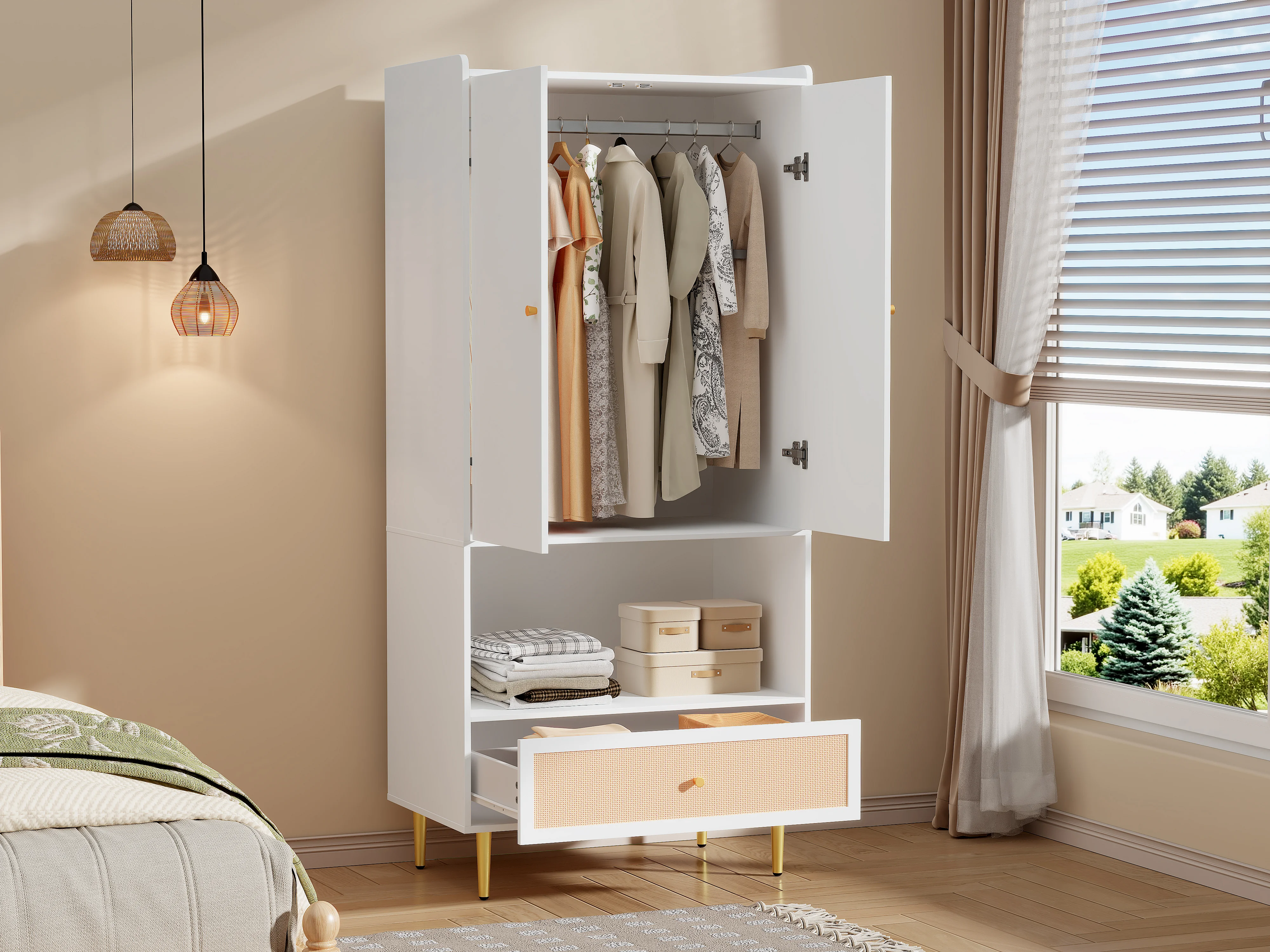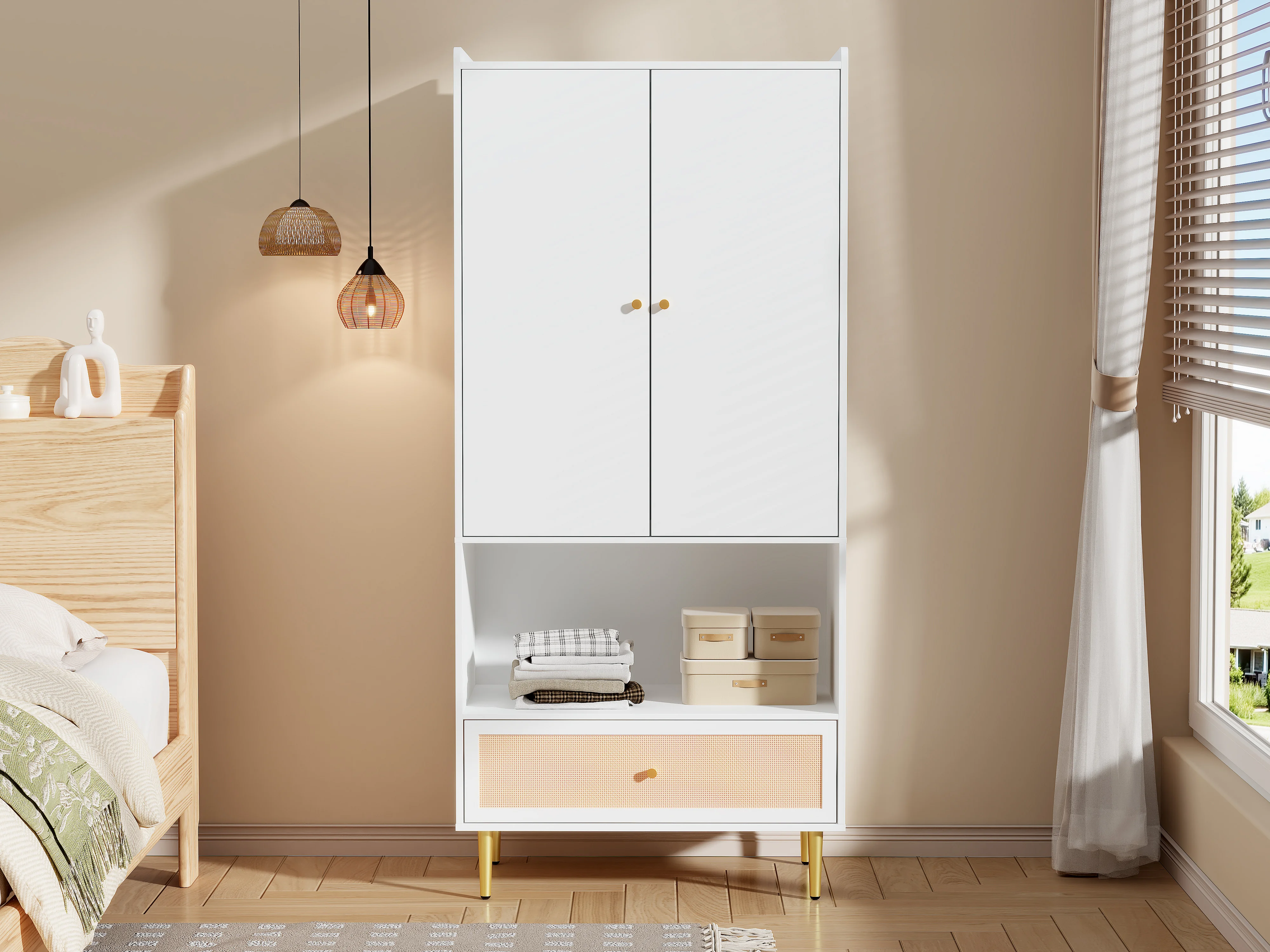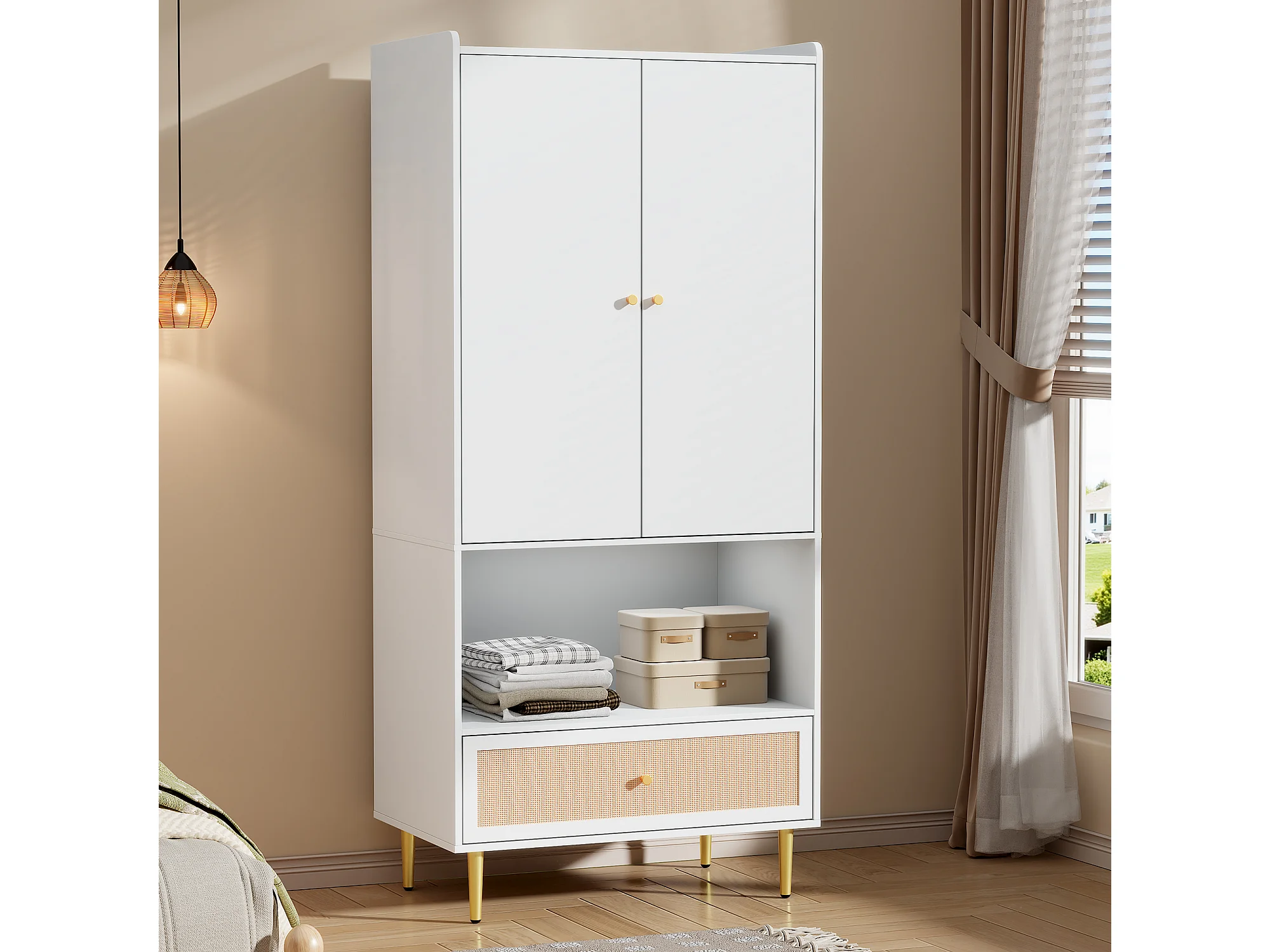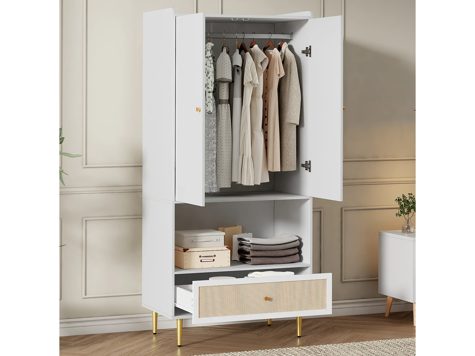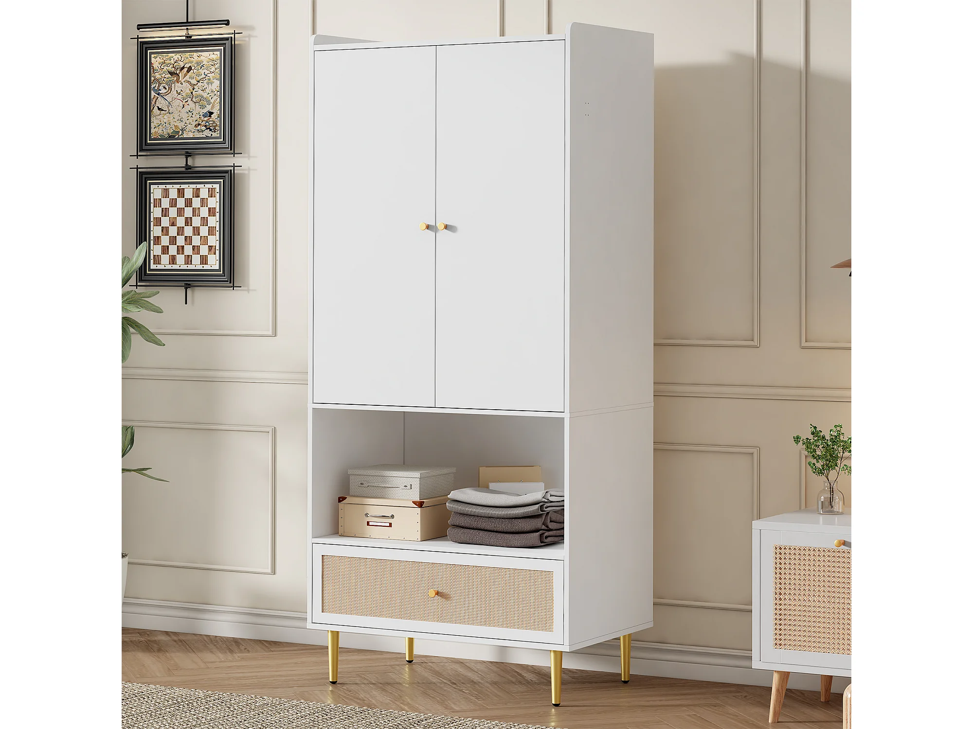 Armoire à 2 portes - 80 x 48 x 175 cm - avec tiroir en rotin + tringle à vêtements - aggloméré - blanc + naturel
