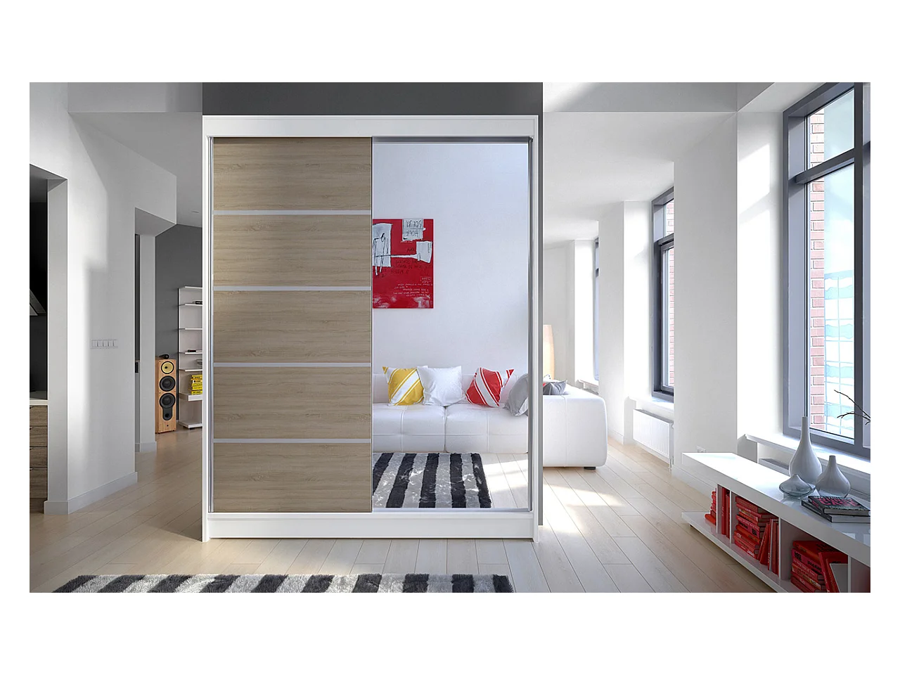 Armoire de chambre blanche 2 portes coulissantes 1 naturel et 1 miroir Limka 150cm