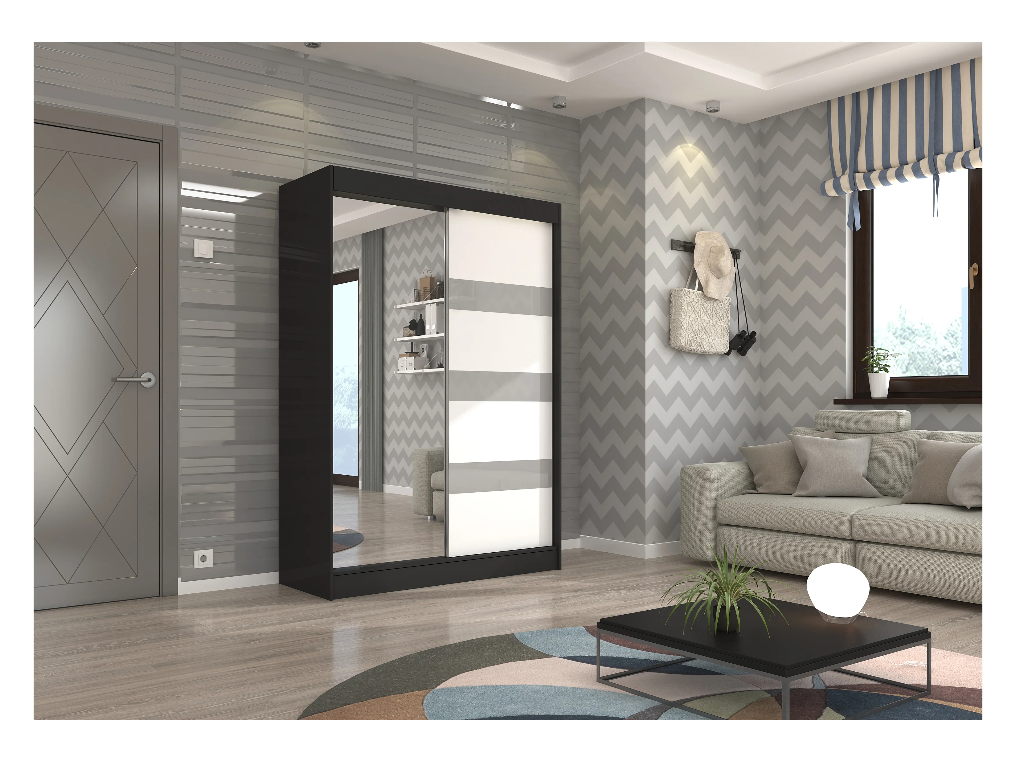 Armoire de chambre noire 1 porte blanche et noire laquée 1 porte miroir Voka - 3 tailles-Largeur 200 cm