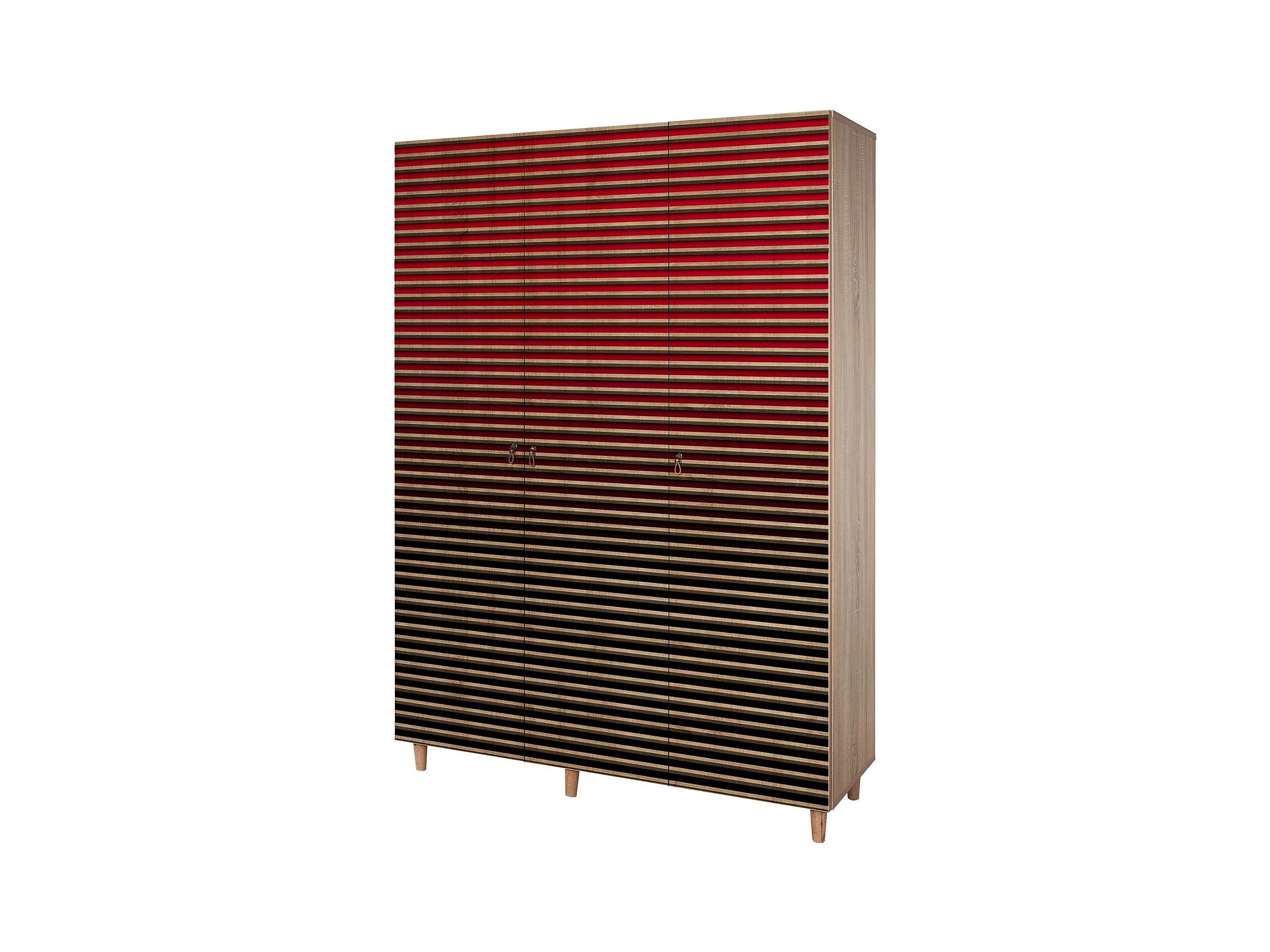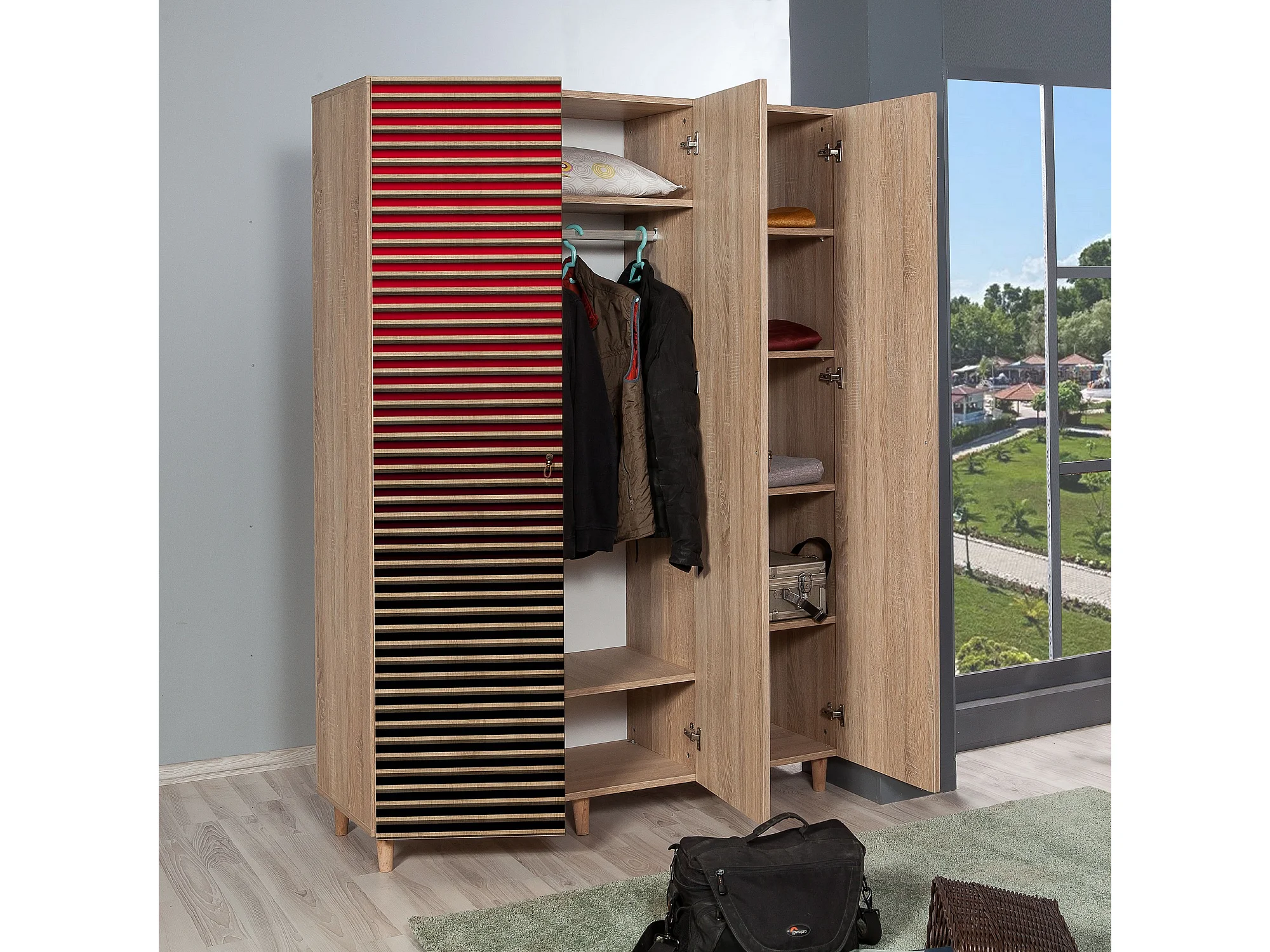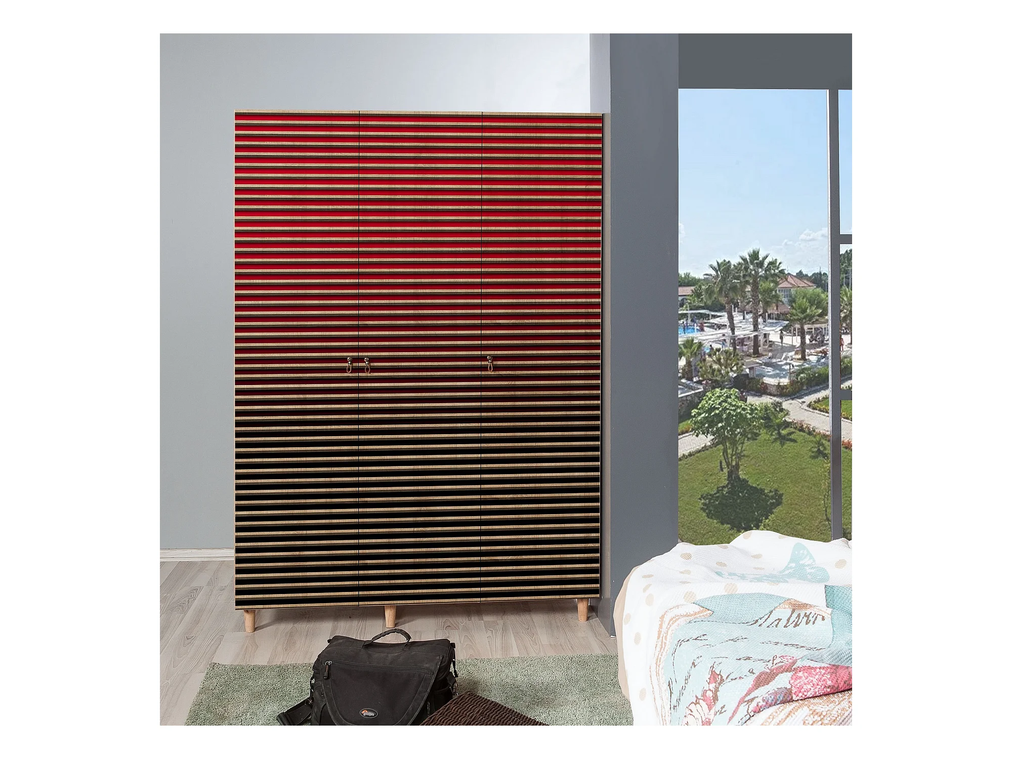 Armoire penderie 3 portes Infigo 135cm Bois Naturel Motif Rayures dégradé Noir et Rouge