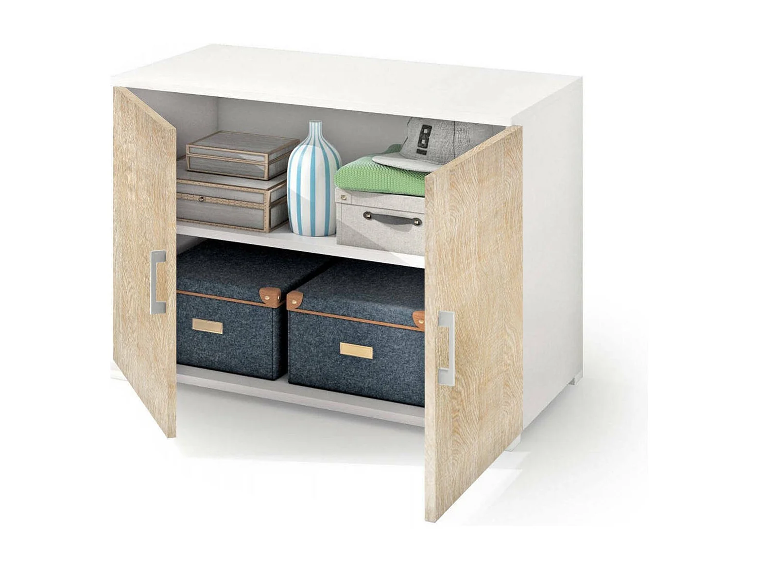 Darc multifunctionele kledingkast, Lineaire kast met 2 draaideuren met plank, Entreekast, Modern schoenenrek, 100% Made in Italy, 90x45h66 cm, Eiken en wit