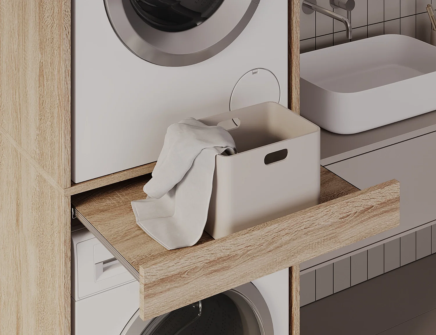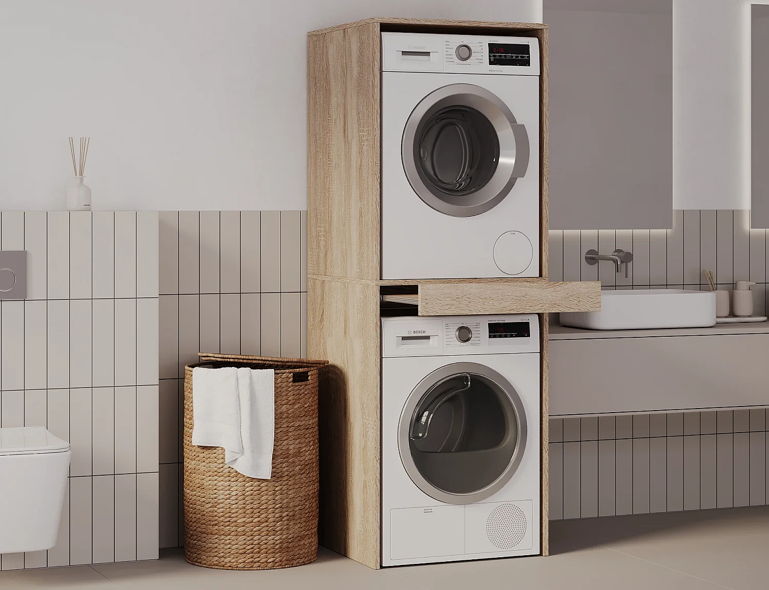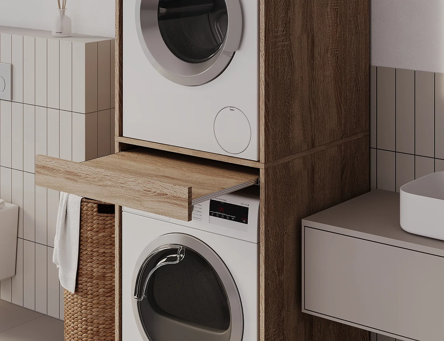 Armoire pour machine à laver et sèche-linge avec tablette coulissante • Meuble de rangement pour lave-linge et sèche-linge • Armoire de surplomb 187 x 65 x 66 cm