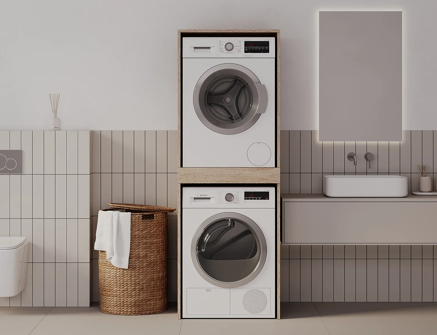 Meuble de buanderie avec rideau pour double machine à laver - Naturel clair - L111 x H184 cm - JAZANO