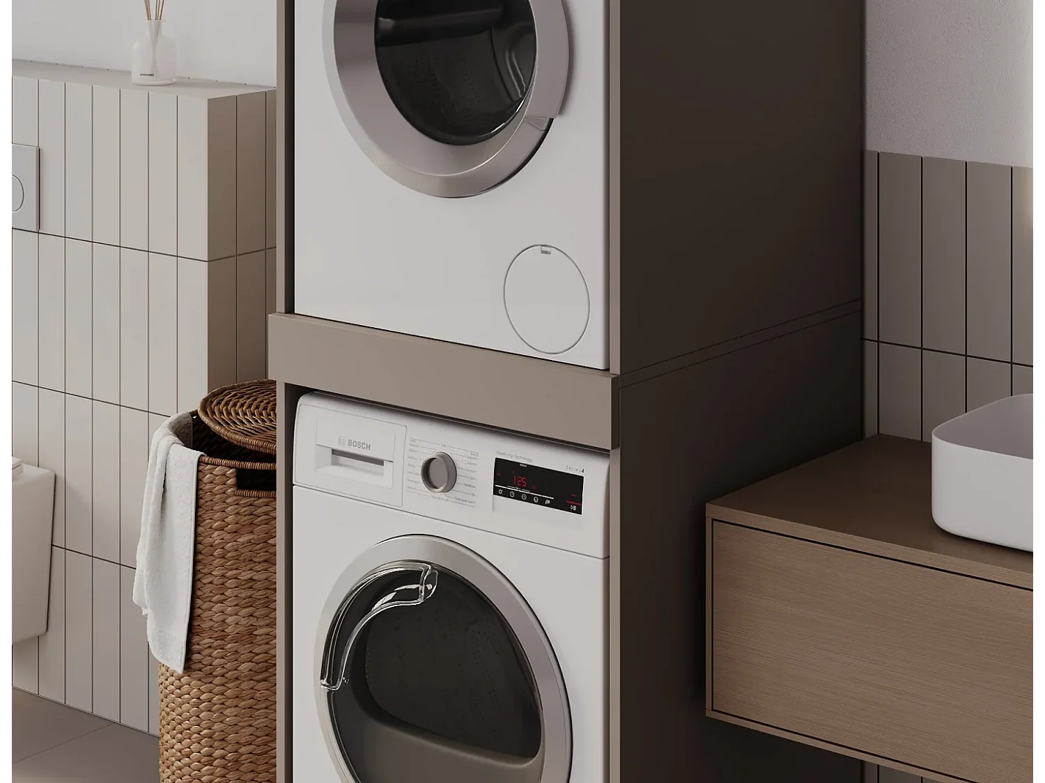 Armoire pour machine à laver et sèche-linge avec tablette coulissante • Meuble de rangement pour lave-linge et sèche-linge • Armoire de surplomb 187 x 65 x 66 cm