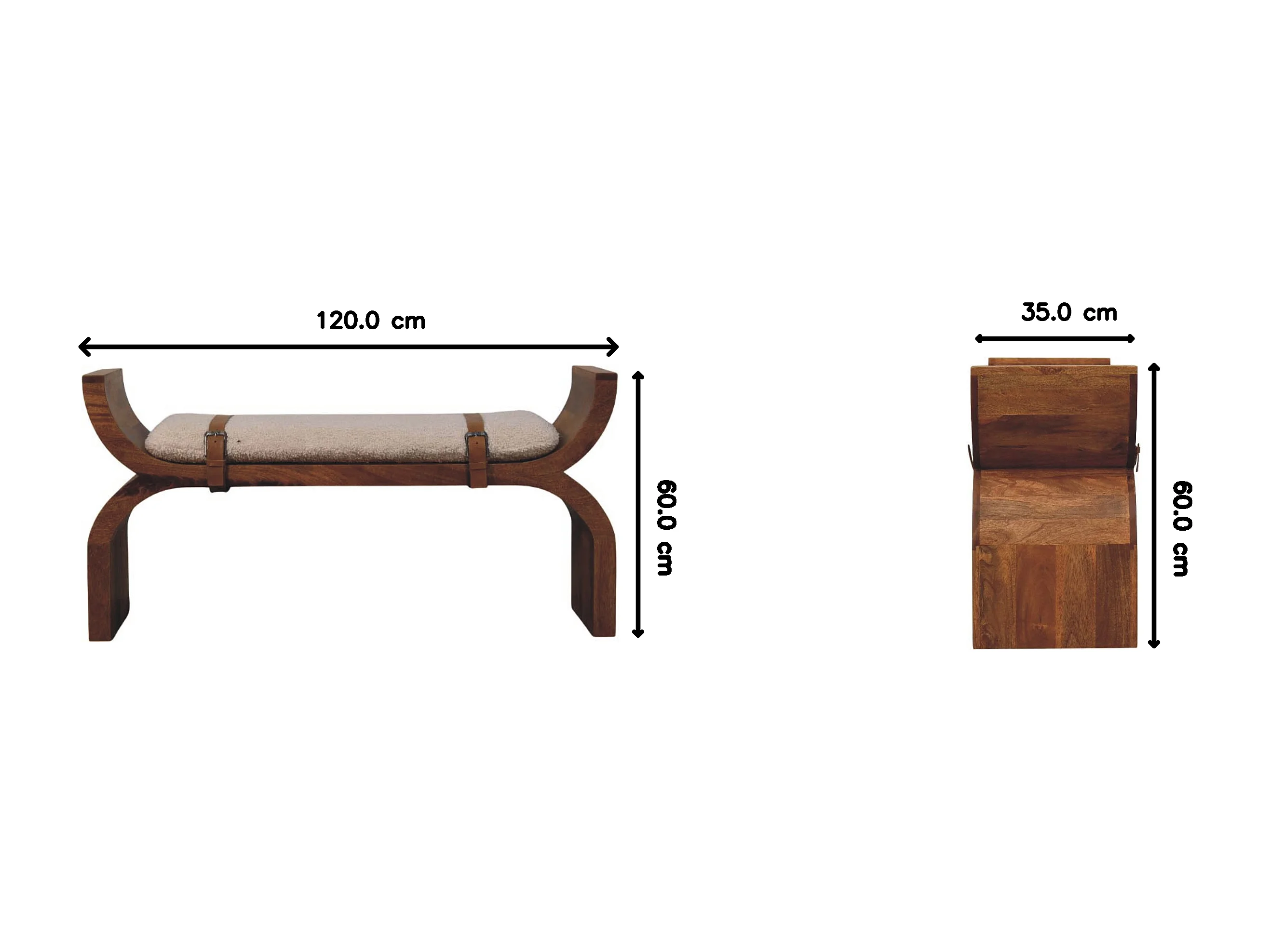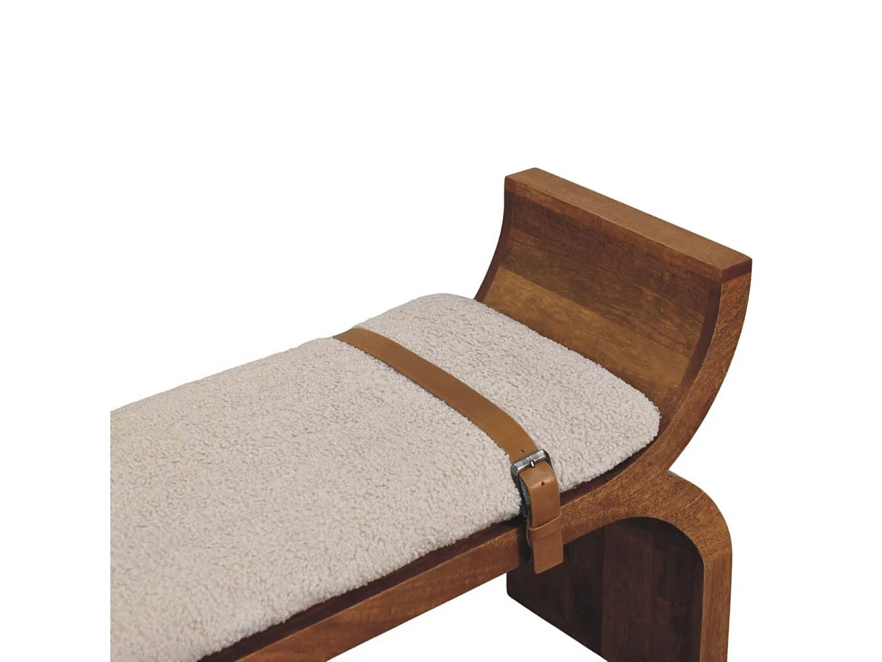 Artisan Furniture Banc Stirrup Curve, bois massif, brun chocolat, ceinture en cuir, assise bouclée moelleuse