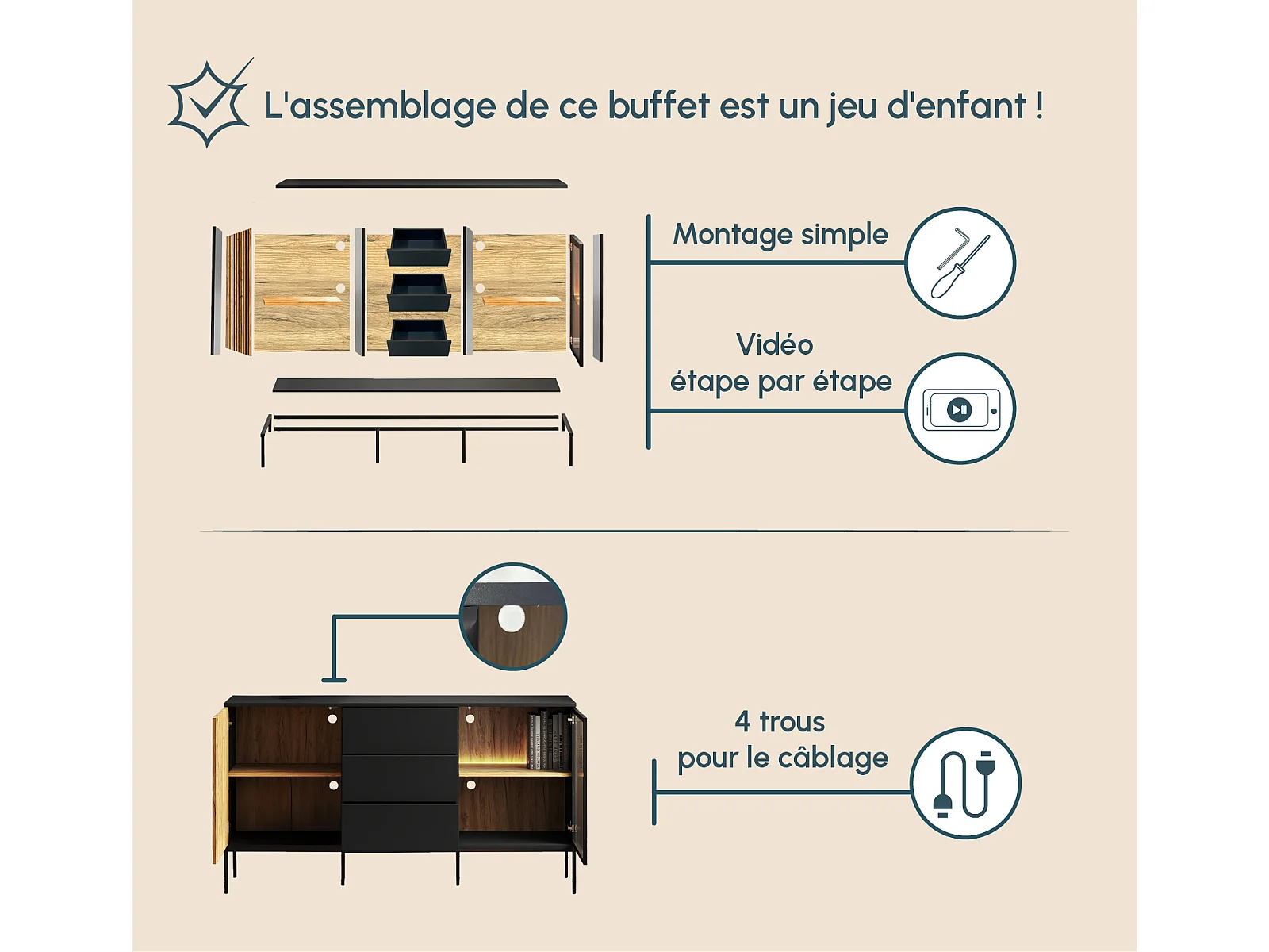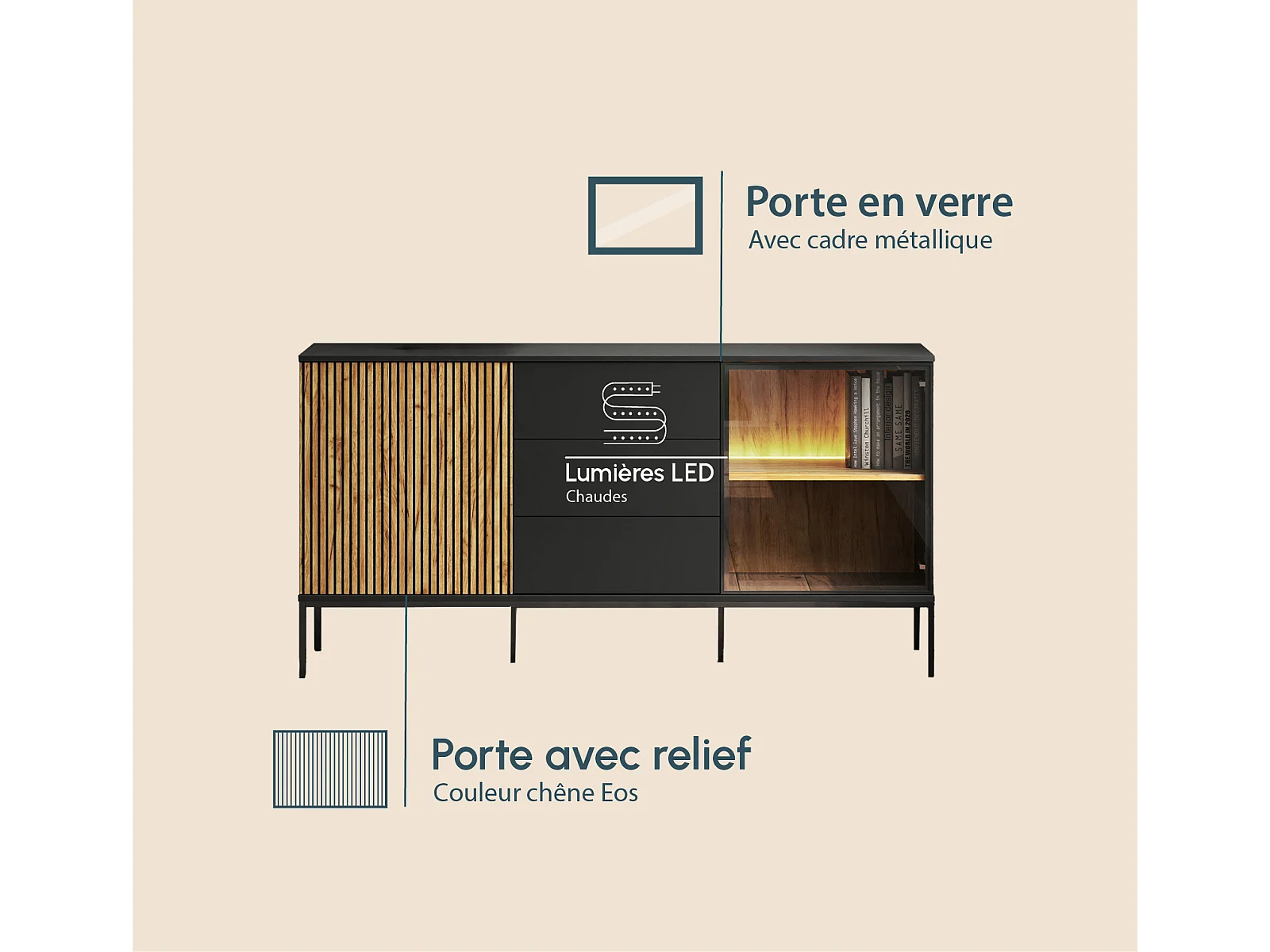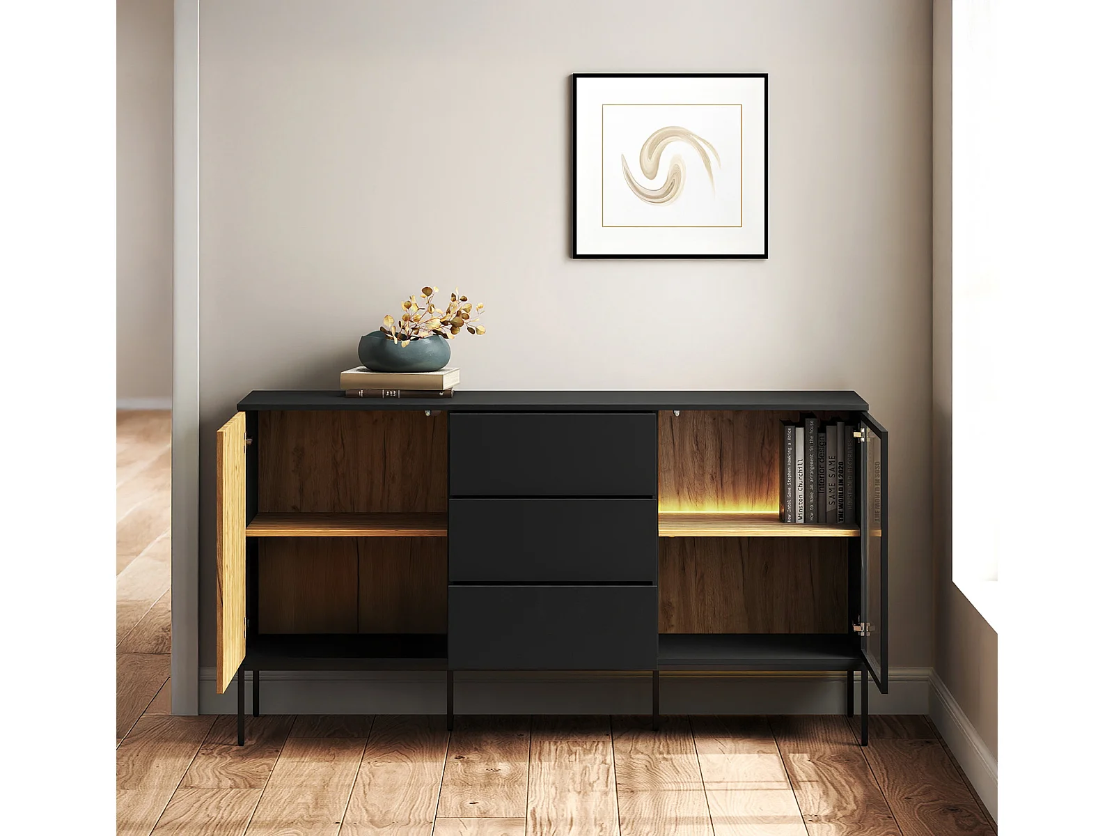 Bahut Buffet en Coleur Noir et Chêne Eos avec LED 153,4x39x83cm Lux