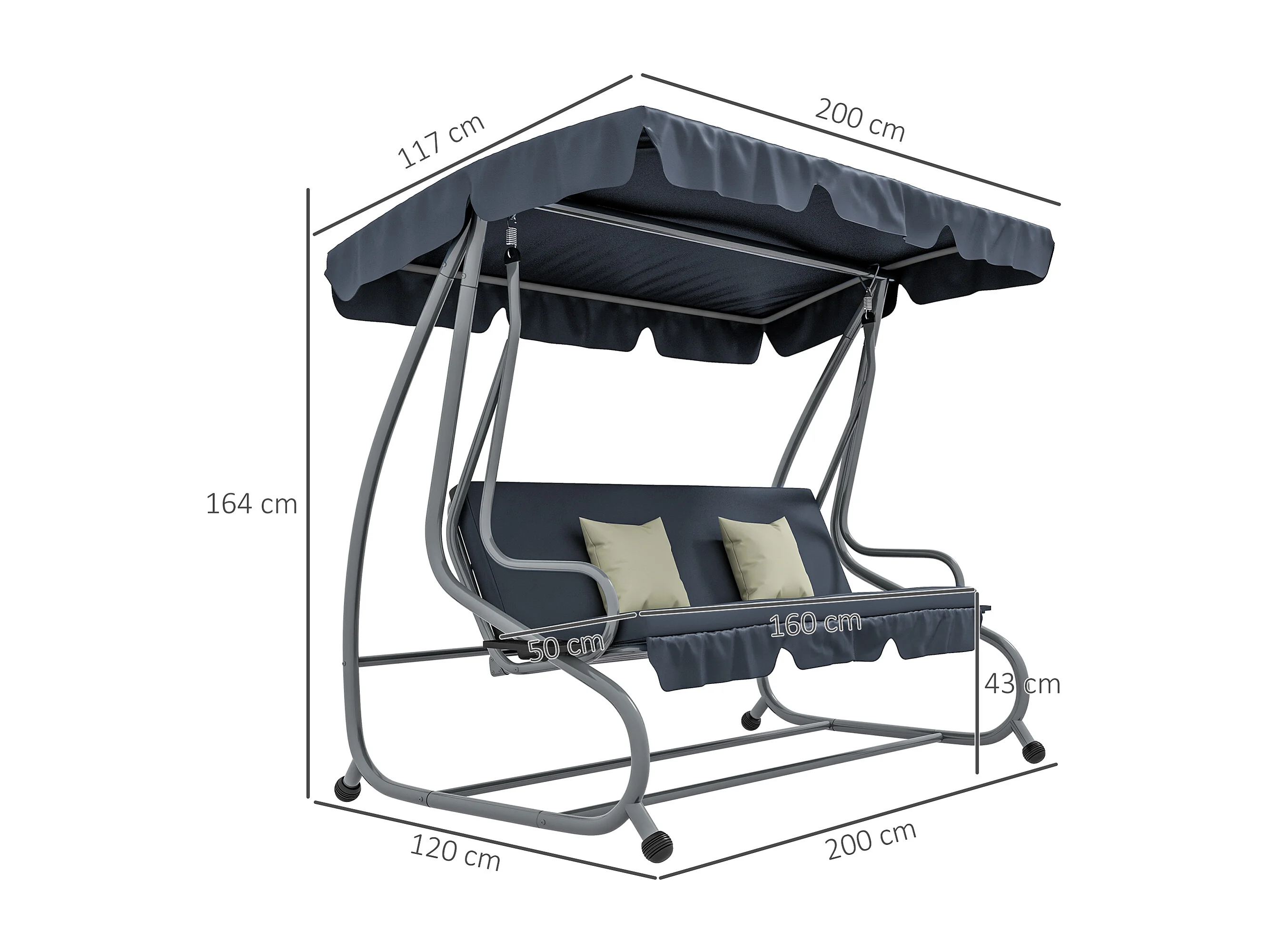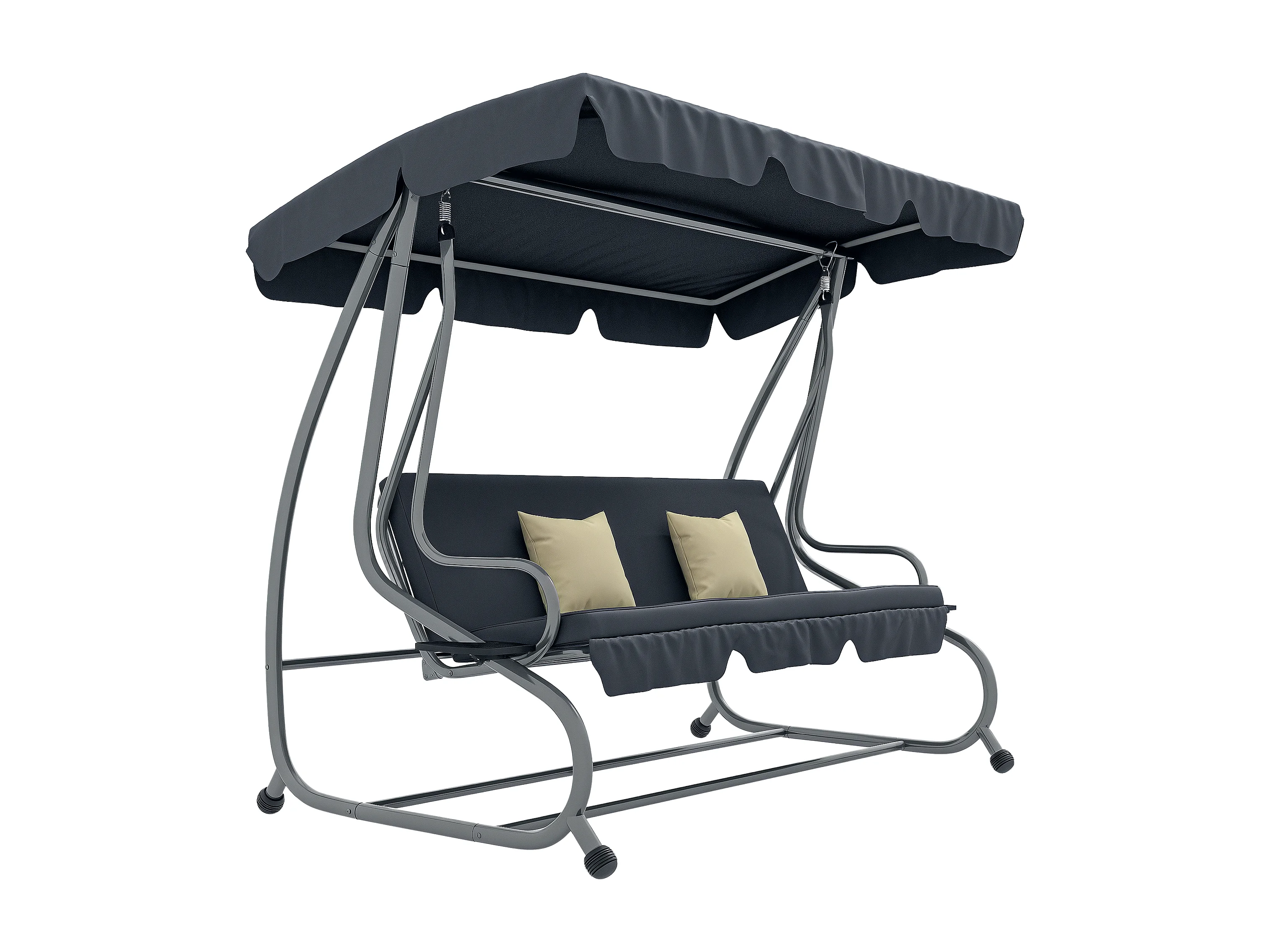 Balancelle de jardin 3 places convertible toit inclinaison réglable 2 tablettes support coussins acier polyester gris