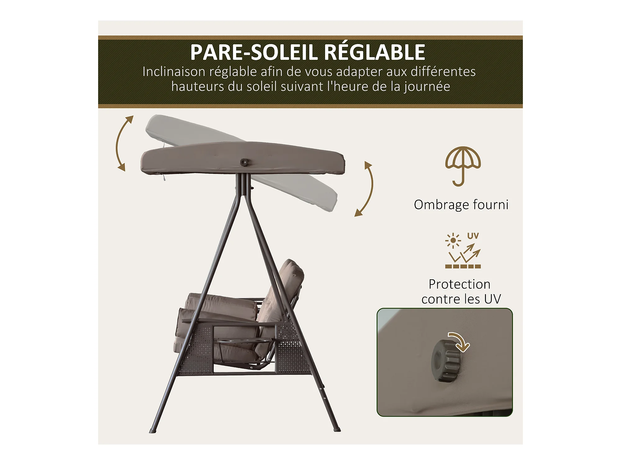 Balancelle de jardin 3 places grand confort toit inclinaison réglable coussins plateaux rétractables polyester filé marron