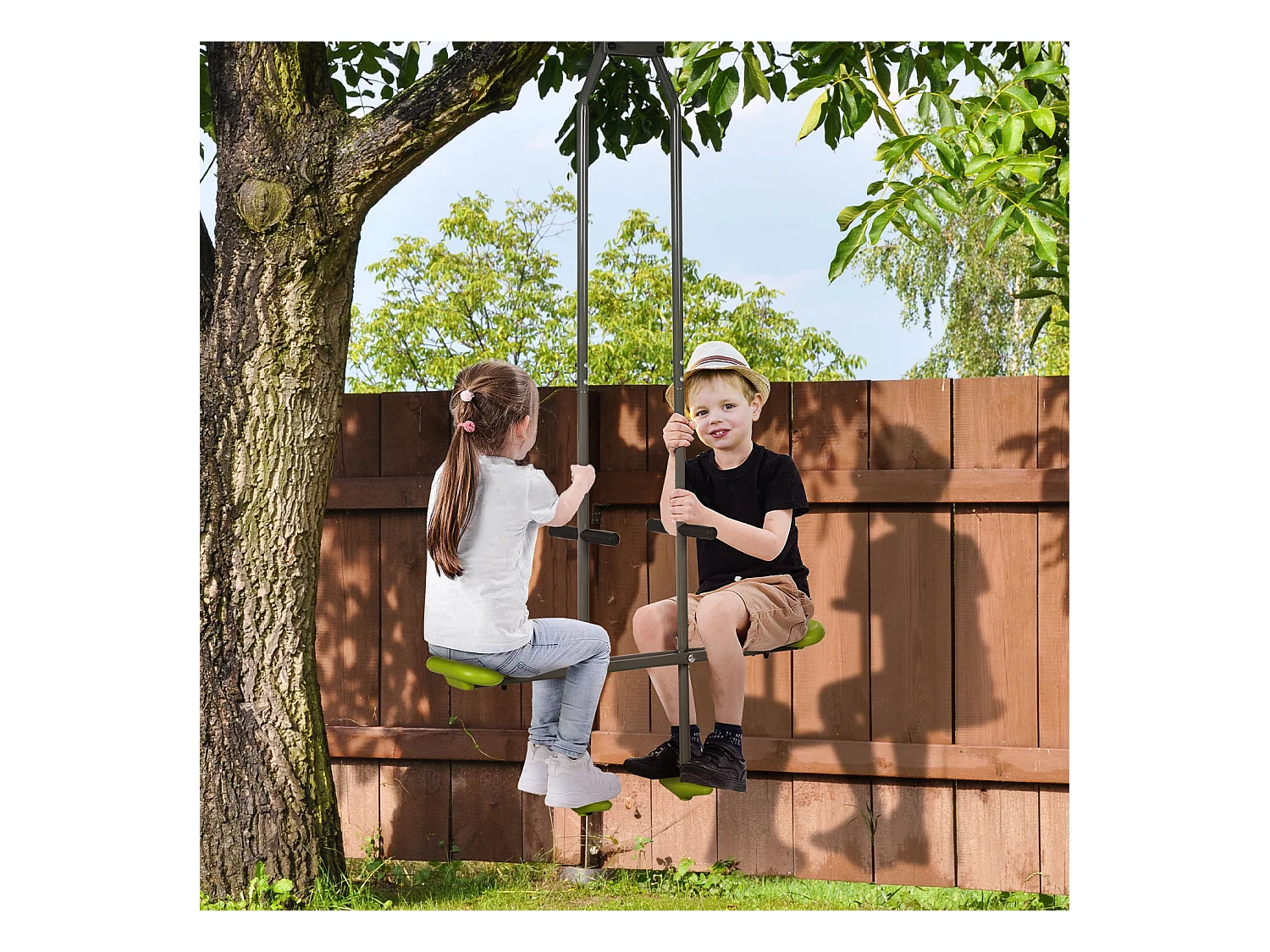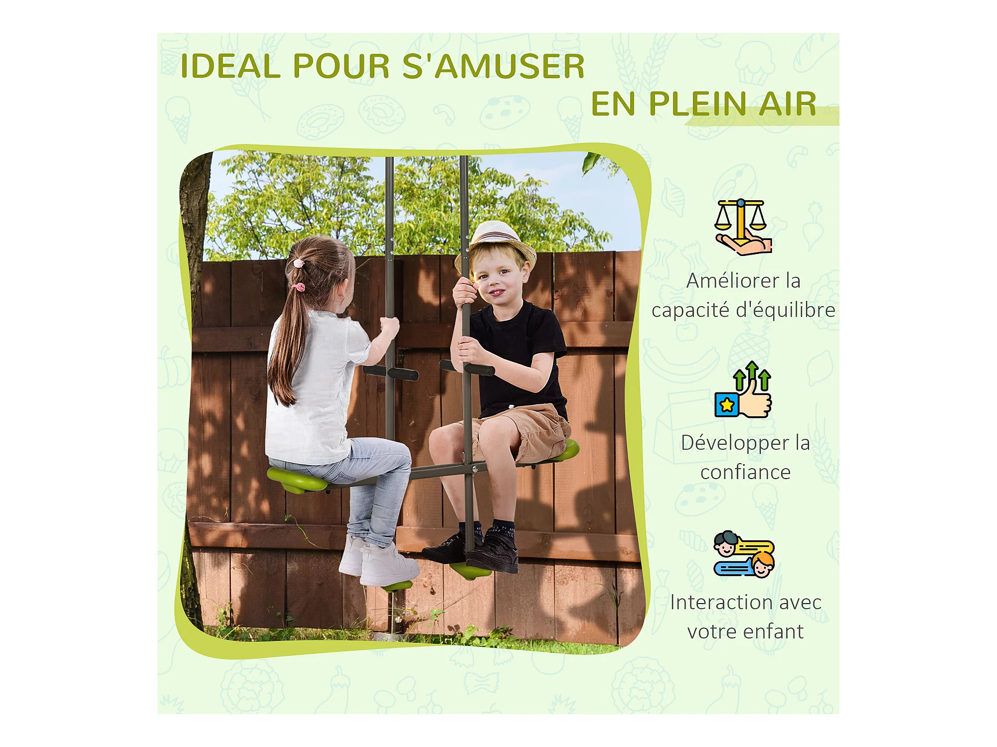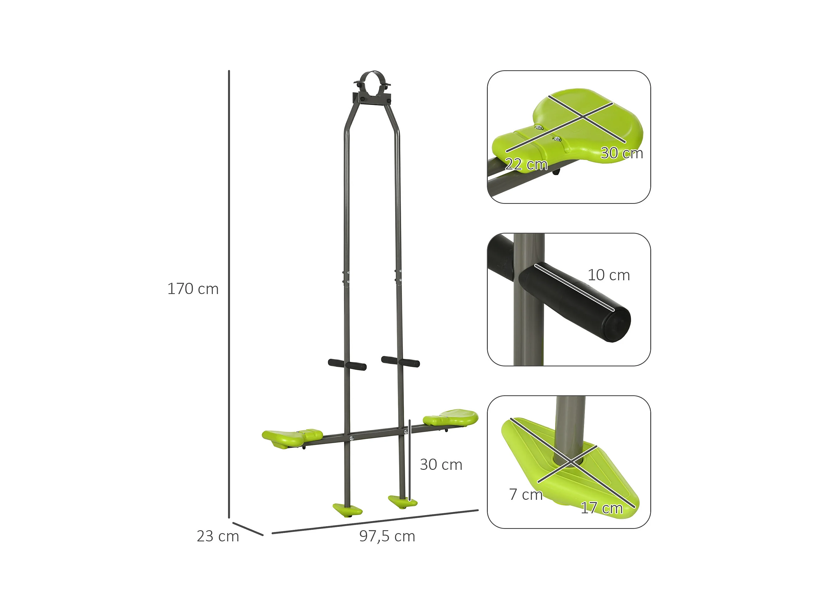 Balançoire agrès face à face enfant 3 à 6 ans - selles larges, guidon, repose-pied - gris vert