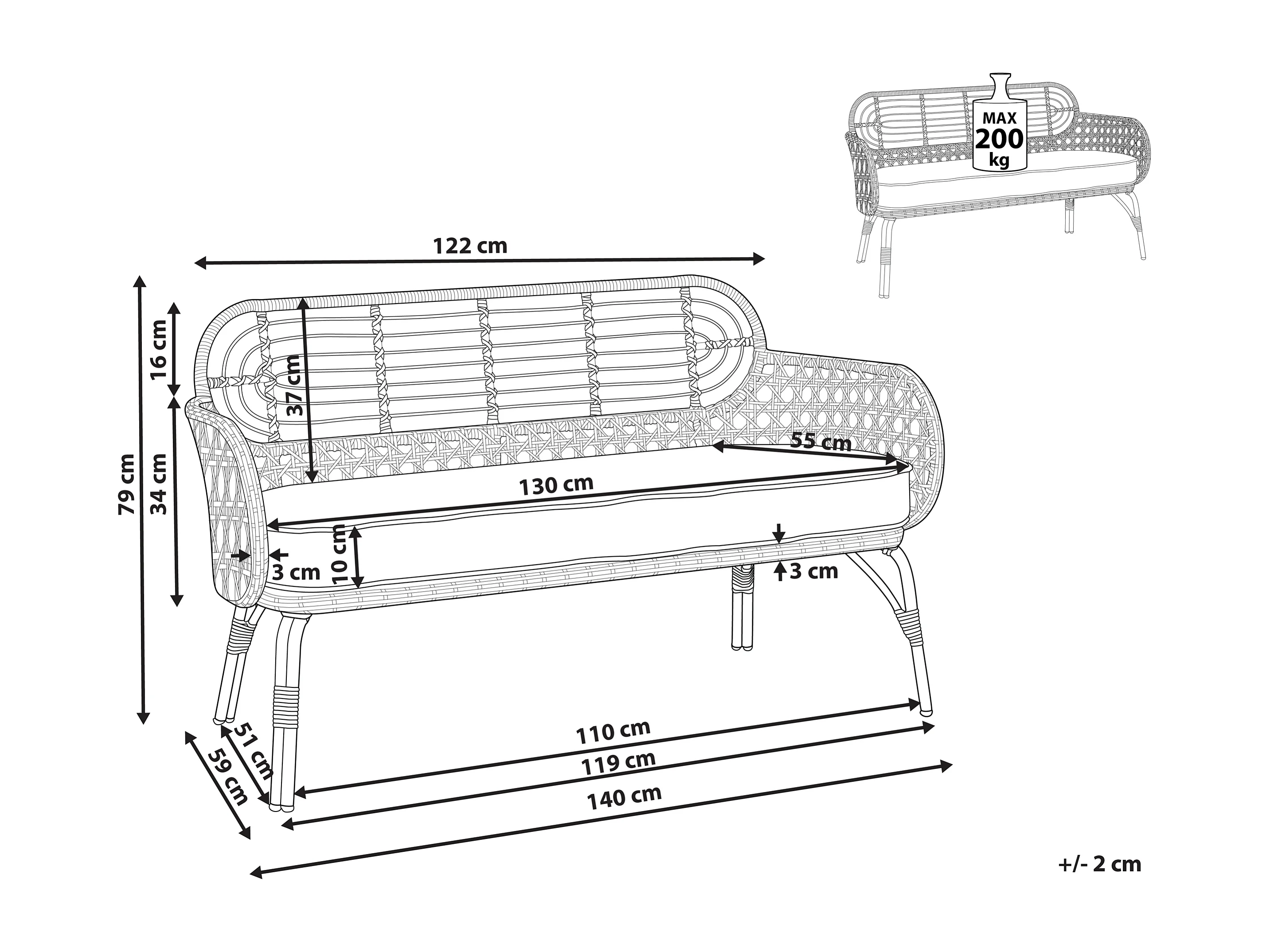 Banc avec coussin d\'assise PRATELLO 122 cm Naturel