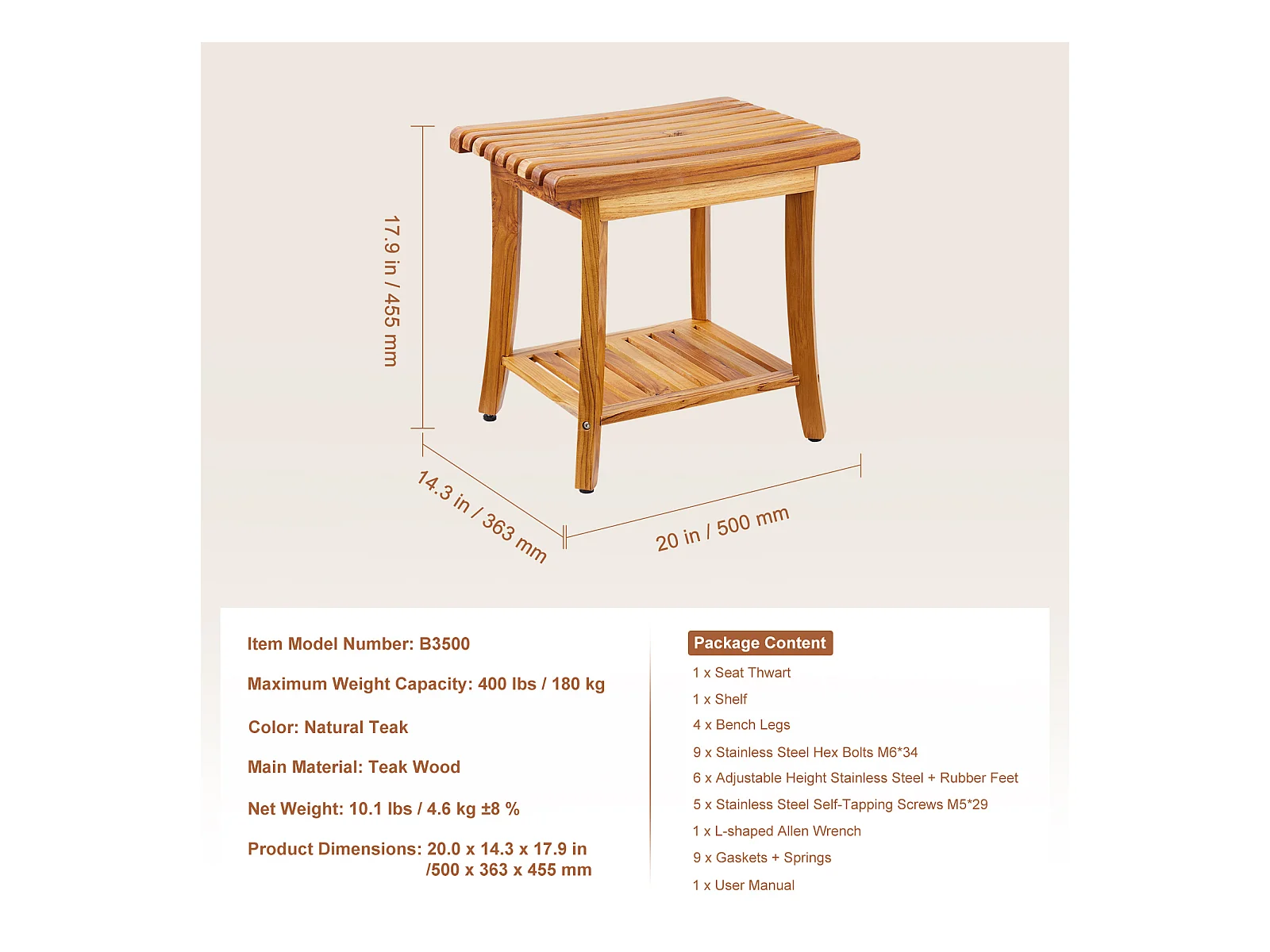 Banc de Douche d'Angle SucceBuy en Teck, 43 cm H × 30,5 cm R, Bois de Teck pour Douche Intérieure Salle de Bain