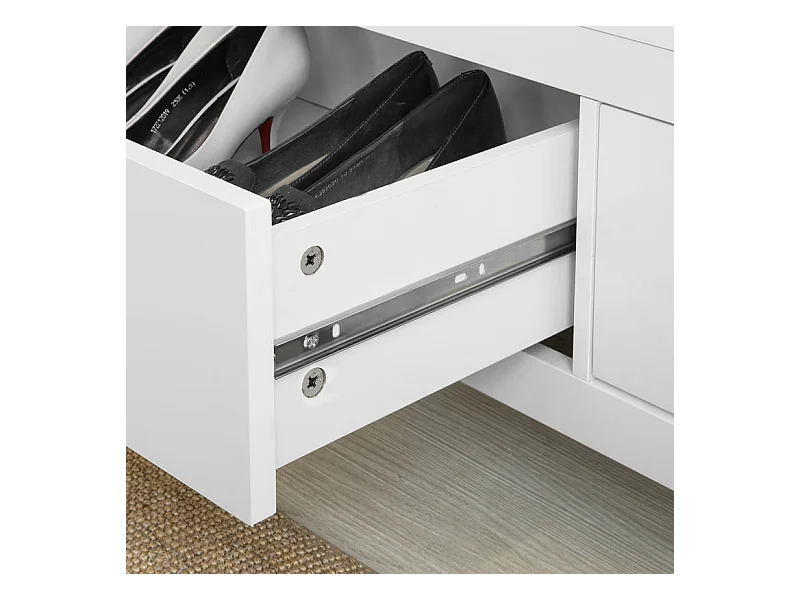 Meuble à chaussures avec banc + 1 porte + 2 tiroirs + 2 étagères ouvertes - 100 x 35 x 90 cm - aggloméré - blanc