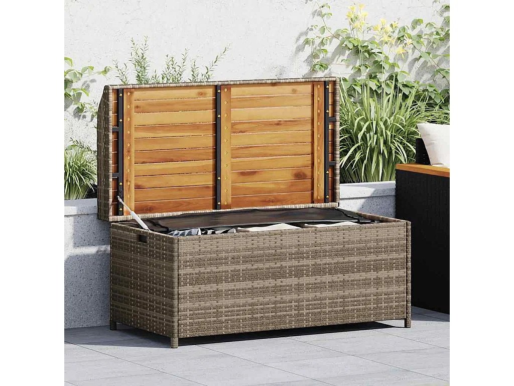 Banc de rangement gris résine tressée et bois d'acacia