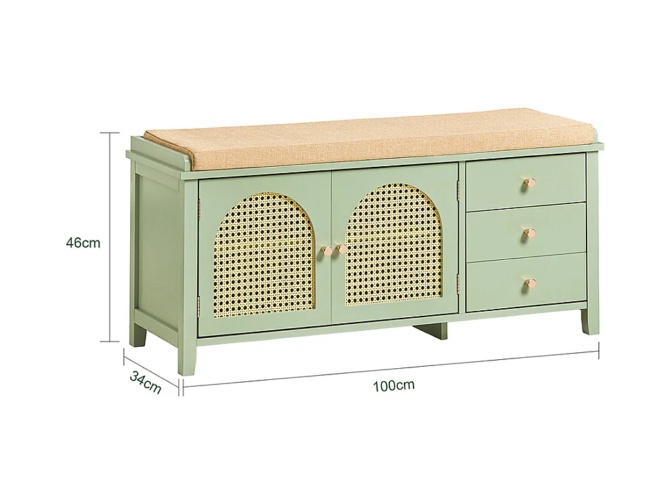 Meuble chaussures banc à chaussures 2 en 1 style bohème chic 2 portes étagère réglable - MDF vert d'eau aspect chêne clair rotin