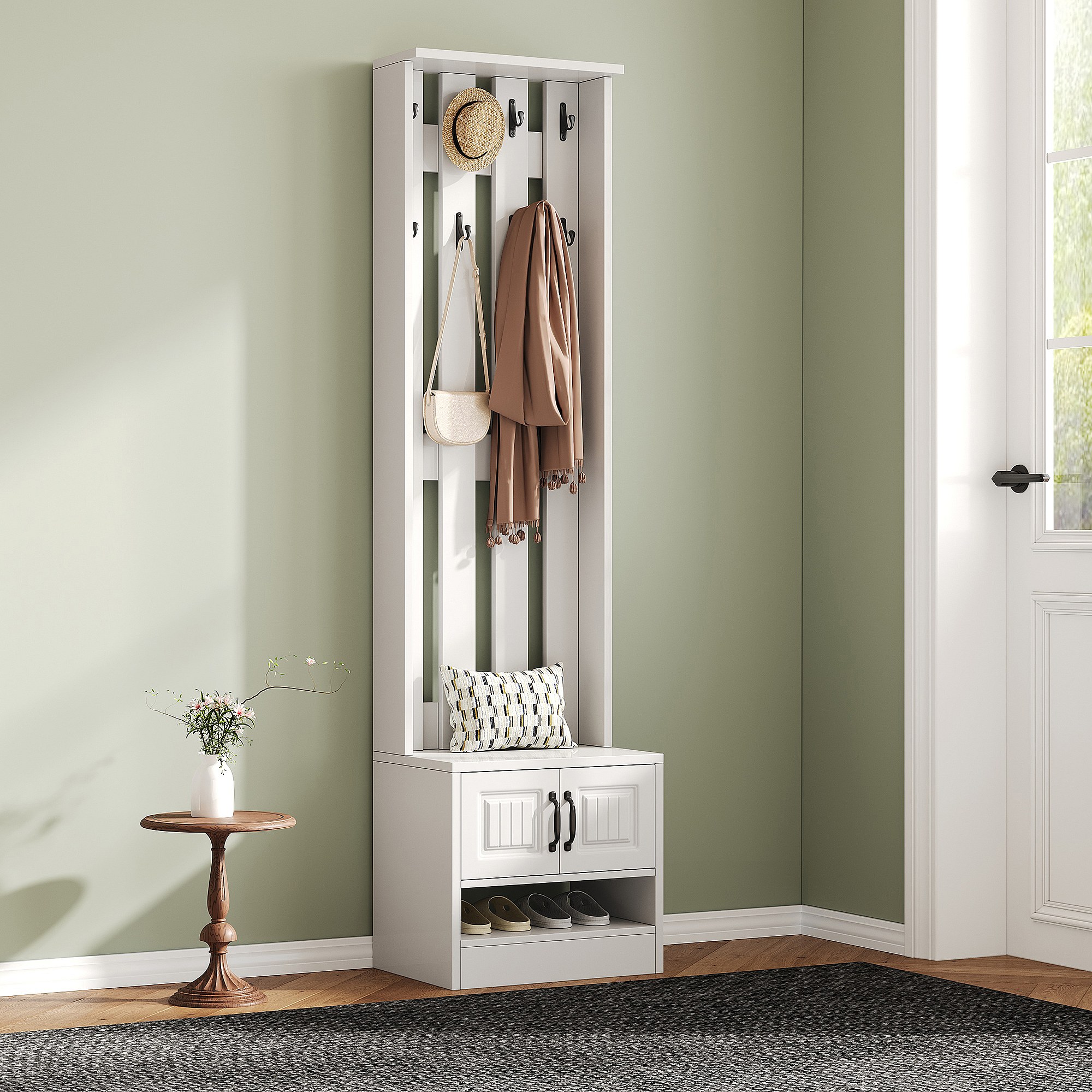 Meuble à chaussures avec banc, porte-manteau et miroir - 105 x 40 x 190.5 cm - MDF et panneau de particules - Blanc et bois