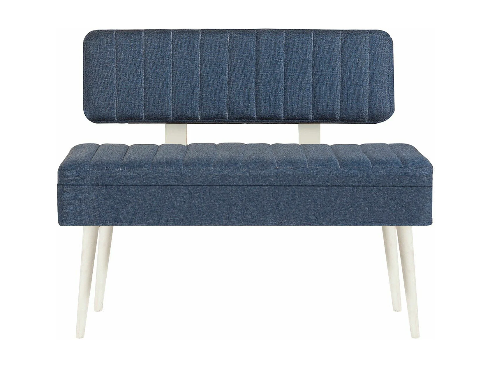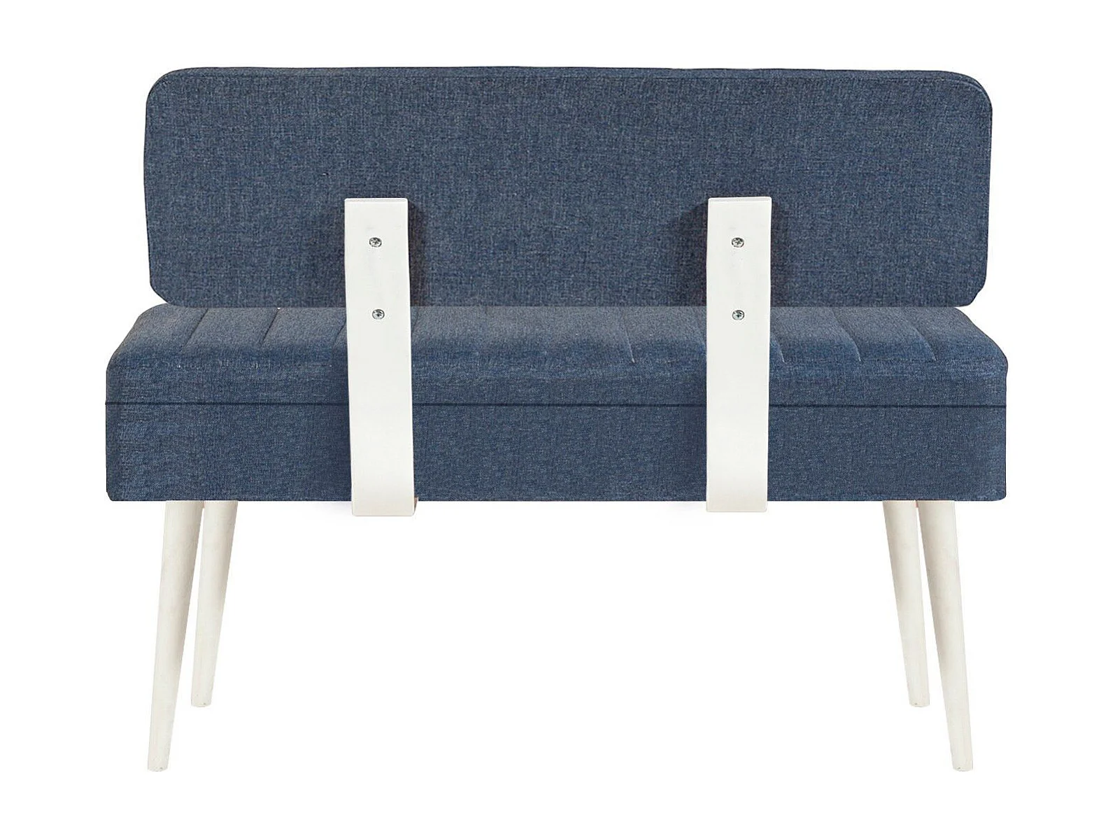 Banquette-coffre capitonnée avec dossier L105cm Molva Bois Blanc et Tissu Bleu foncé