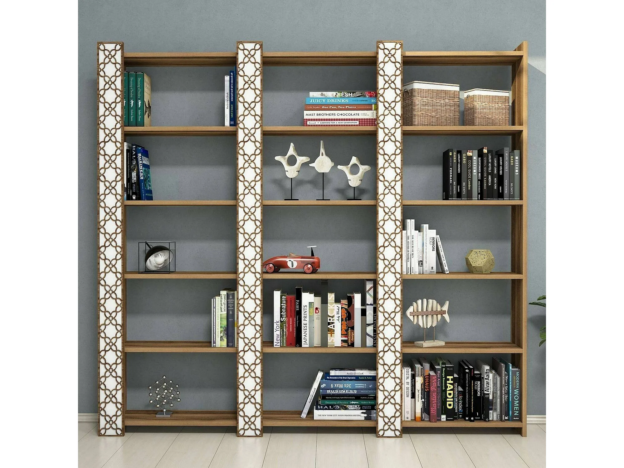 Bibliothèque Alula, Etagère de bureau, Porte-livre mobile, Librairie, 185x24h170 cm, Noyer et Blanc