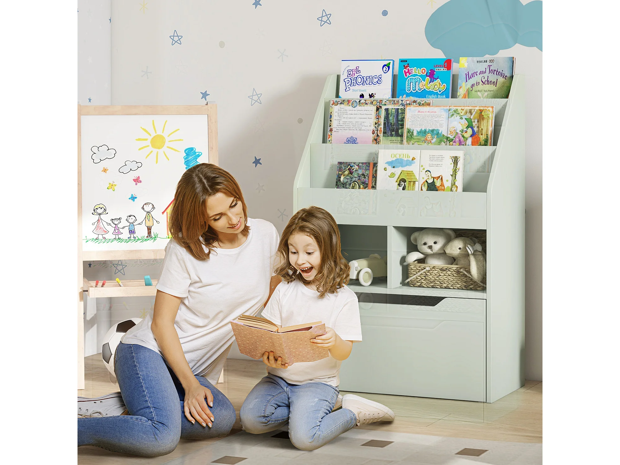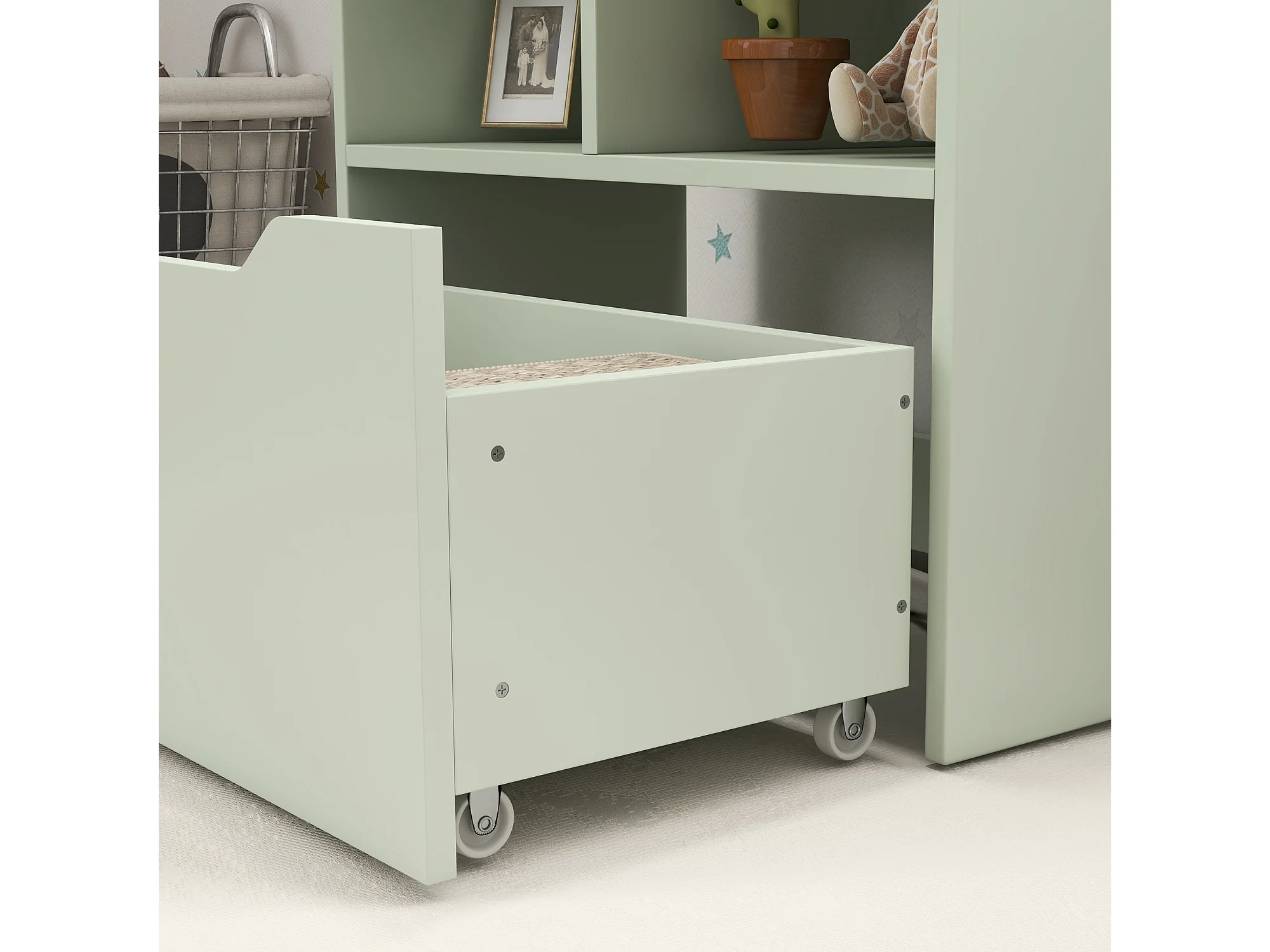 Bibliothèque étagère multi-rangement 3 étagères 2 niches grand tiroir MDF vert clair