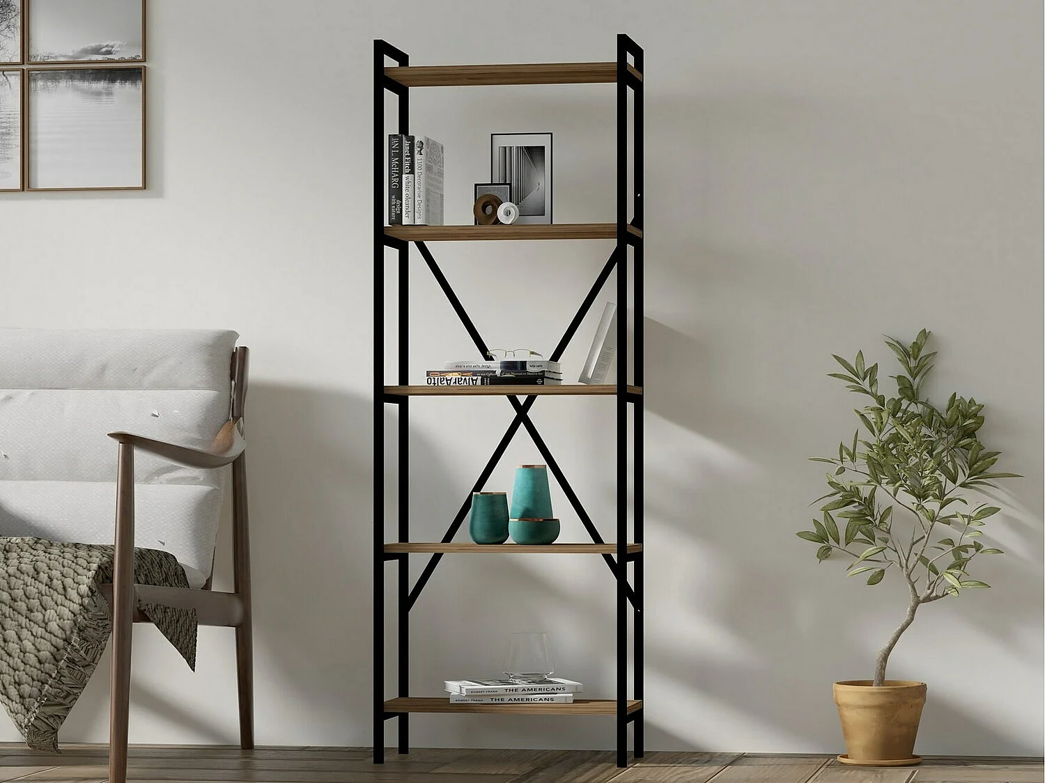 Étagère bibliothèque design Iusa L80cm Bois clair et Métal Noir