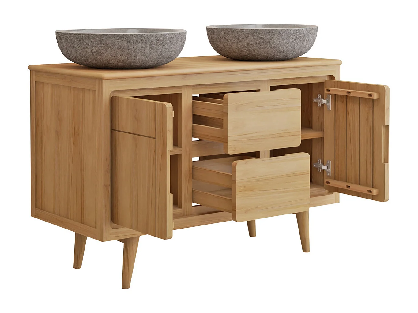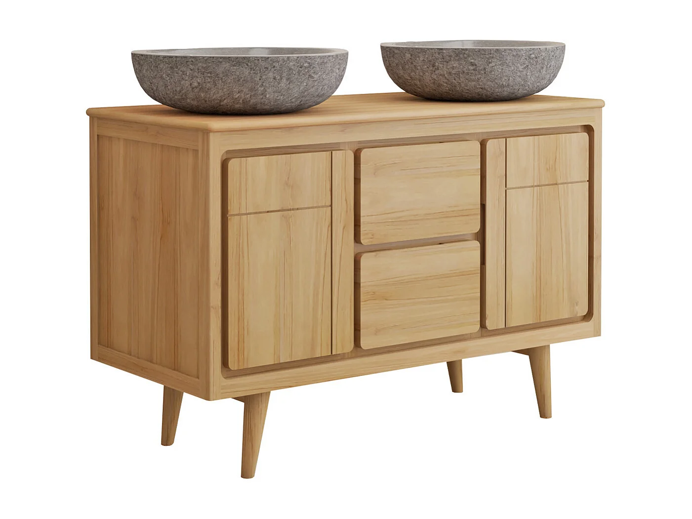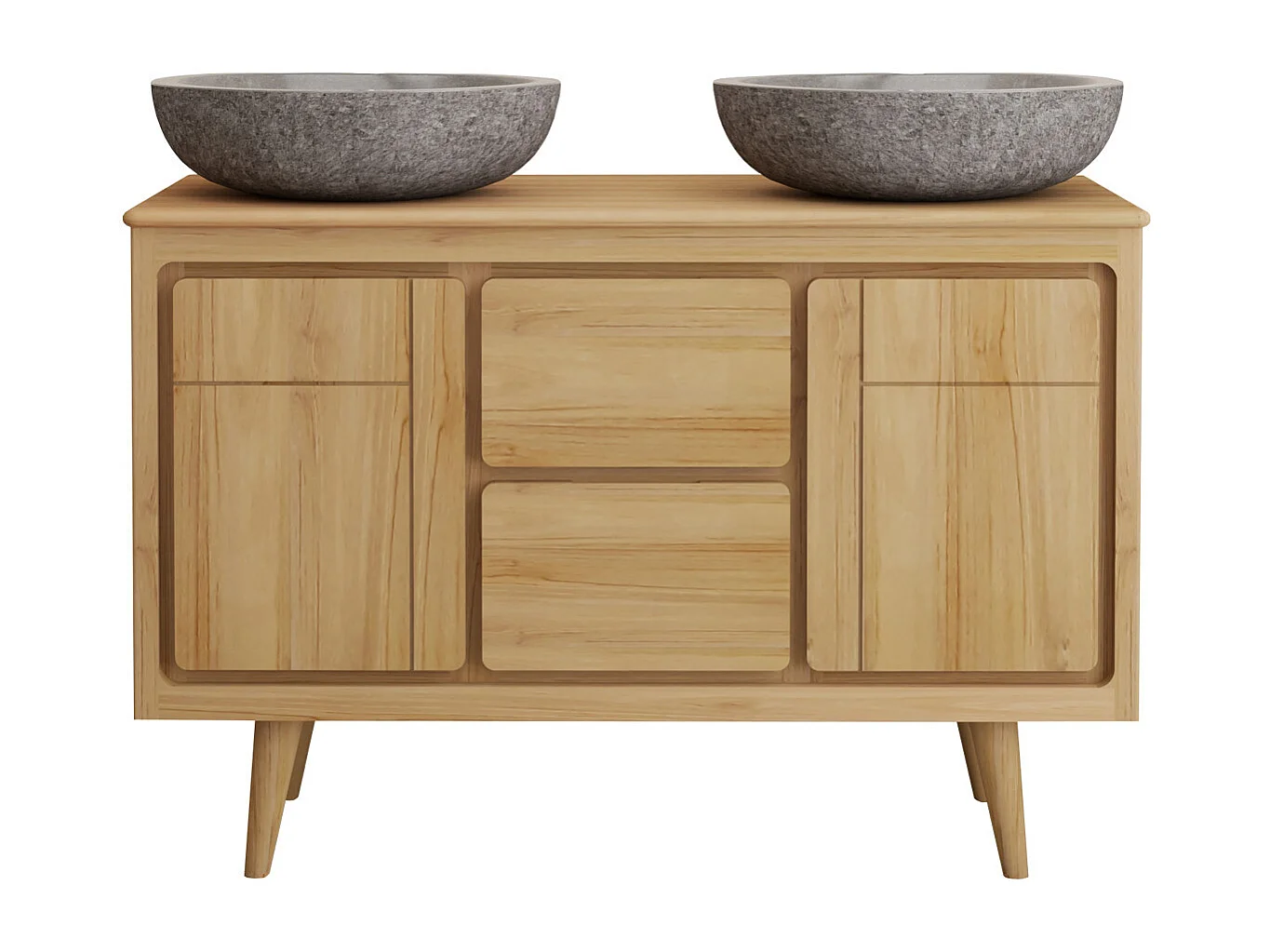 Meuble de salle de bain sur pieds en teck avec double vasque à poser grise en pierre - 120 cm - BINTUNI