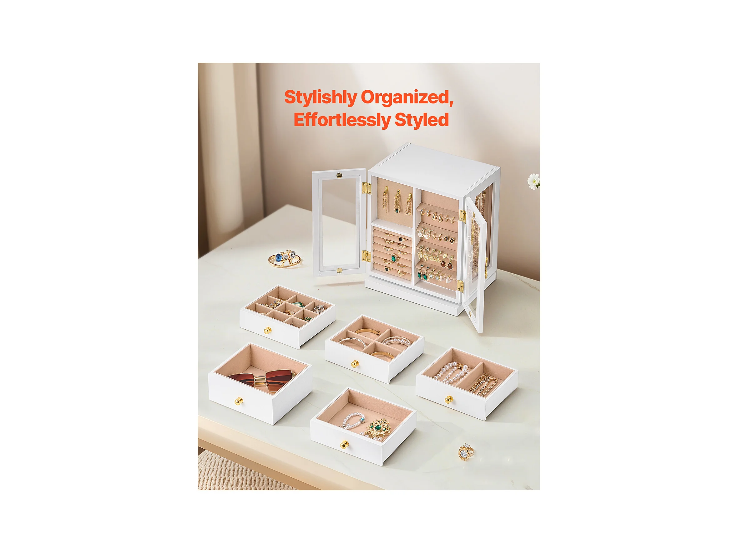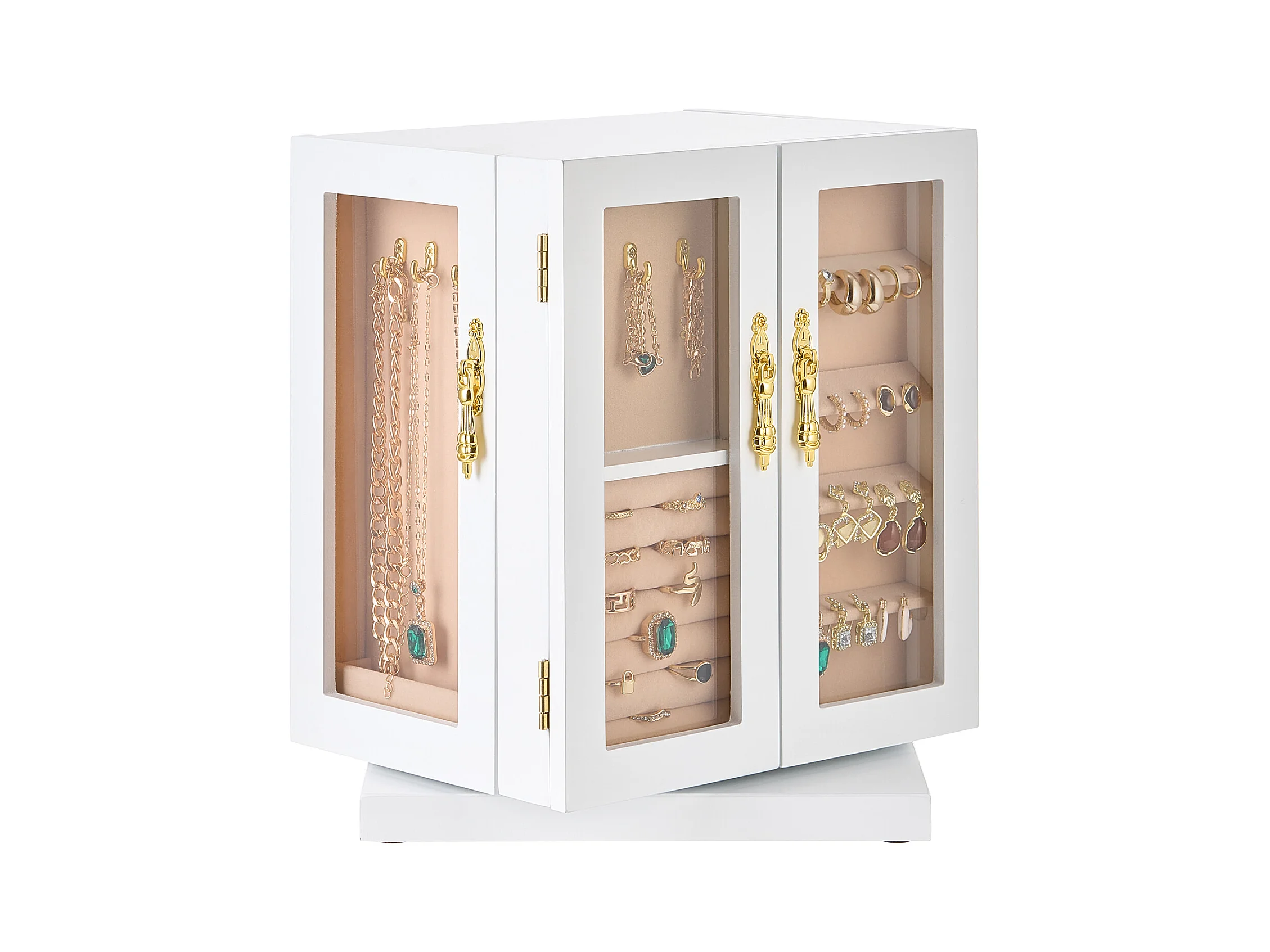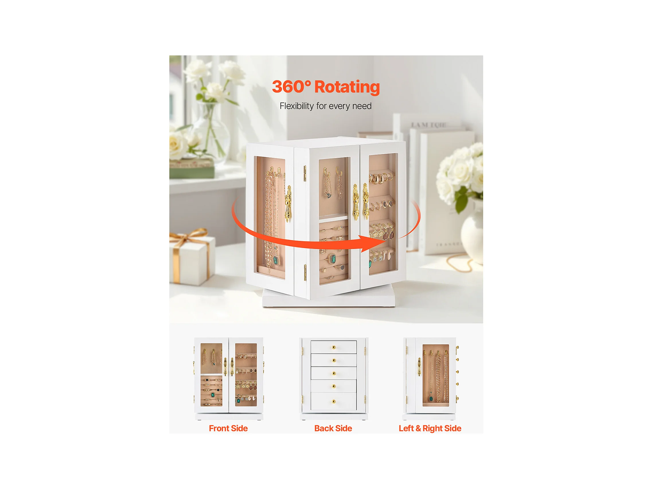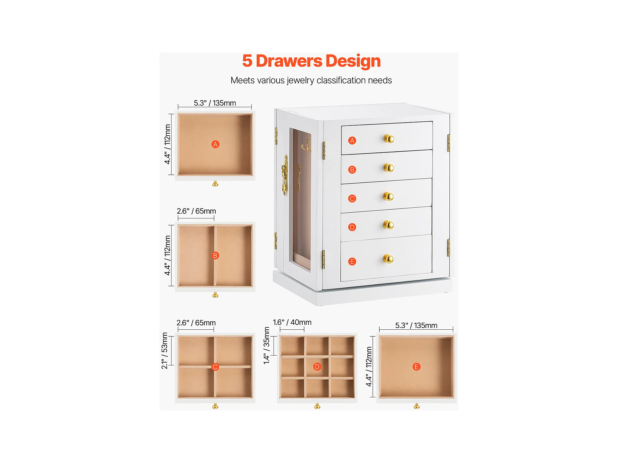 Boîte à Bijoux Rotative SucceBuy à 360°, avec 5 Tiroirs et Fenêtre en Acrylique, Grand Étui de Rangement avec Poignées en Métal, Doublure en Velours Doux, Blanc