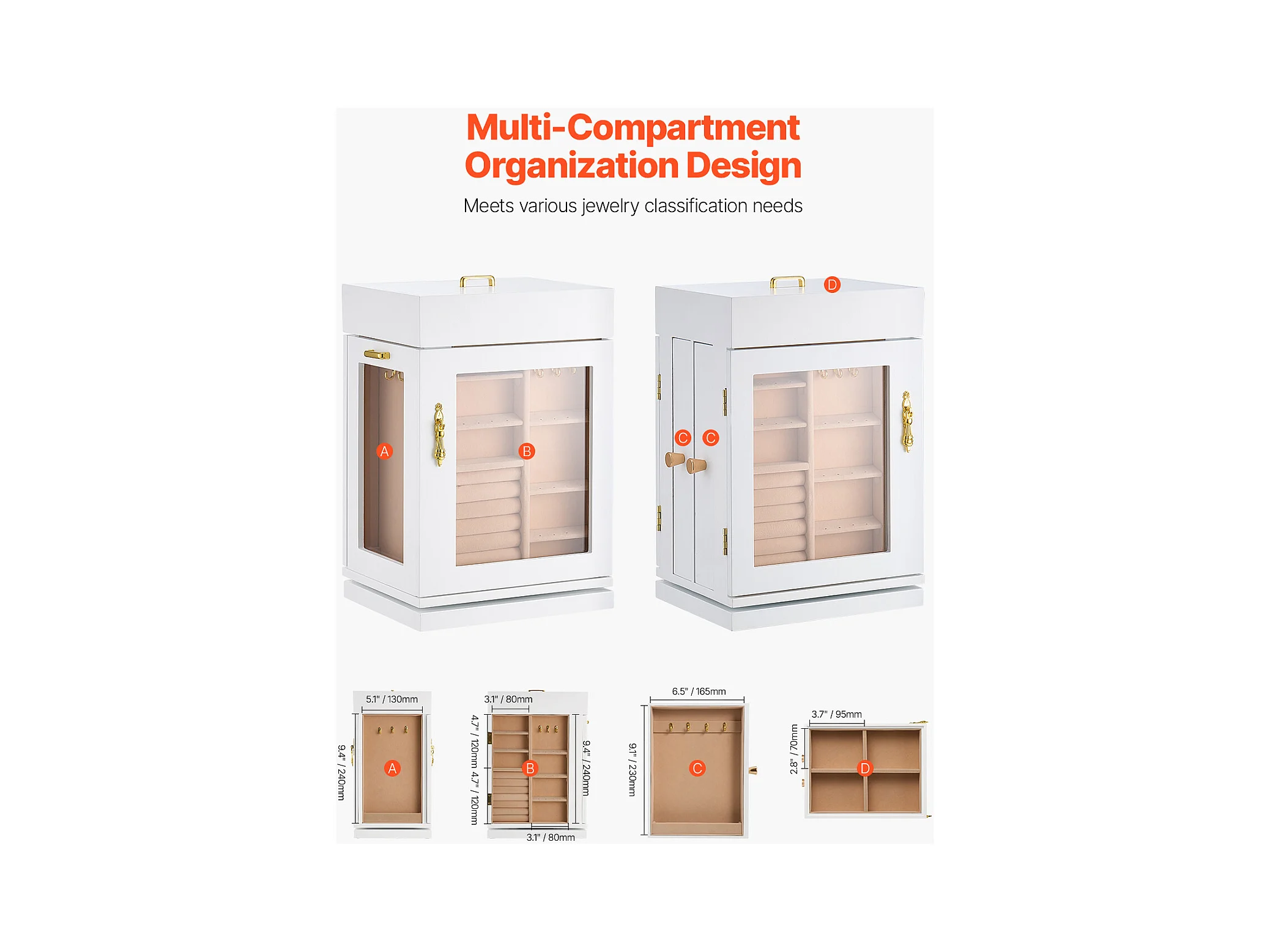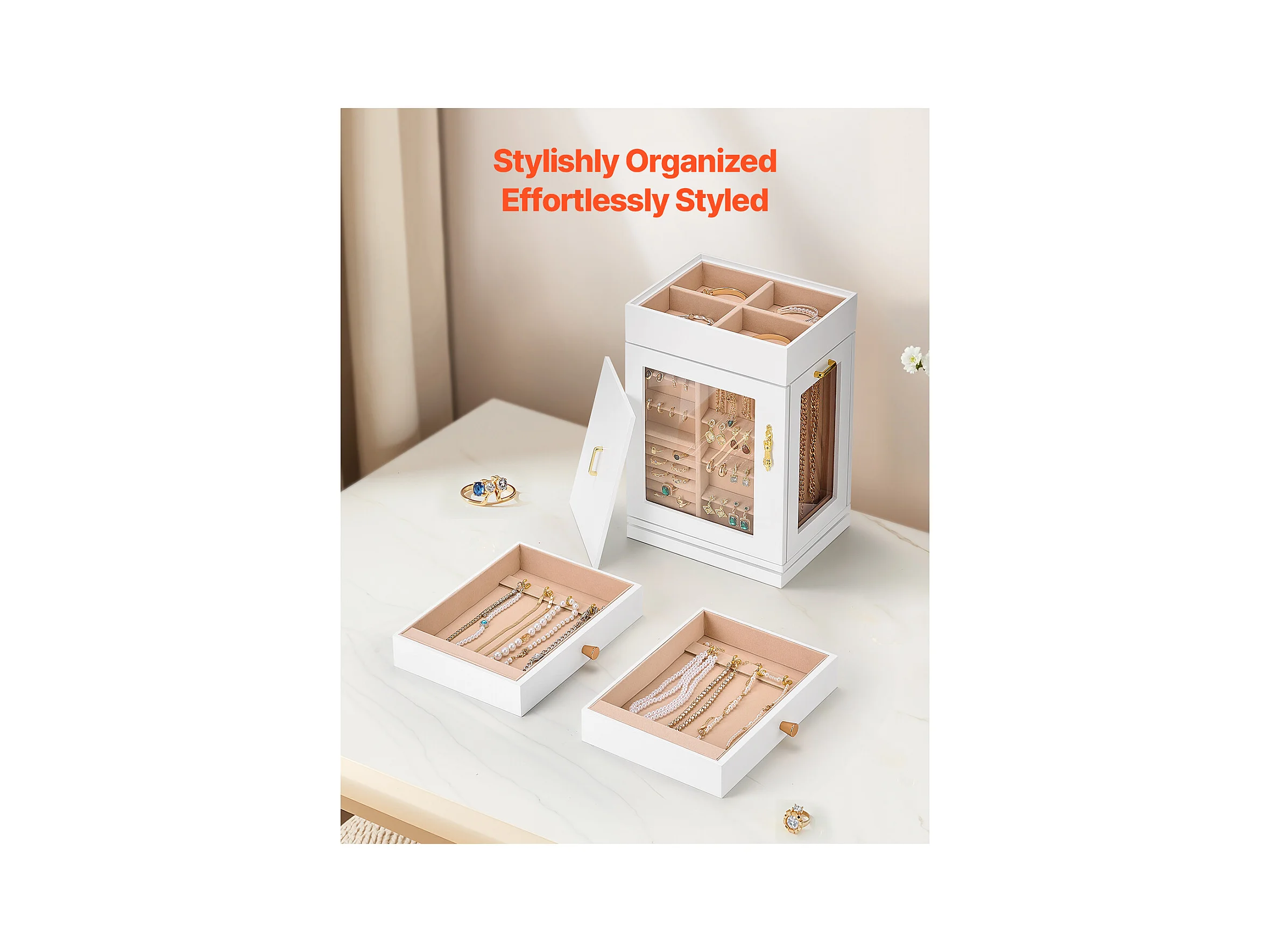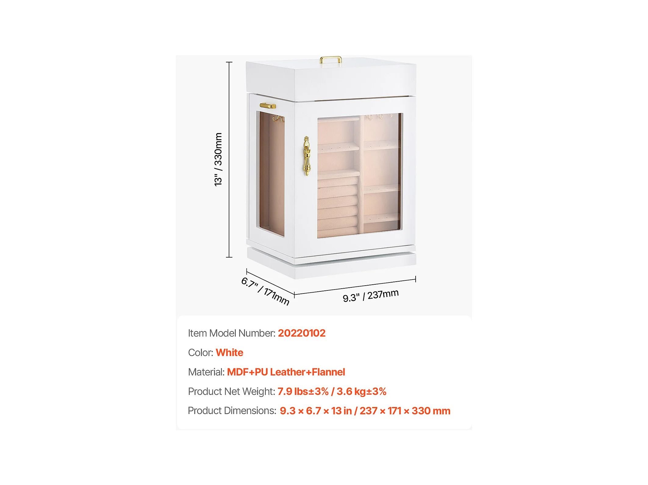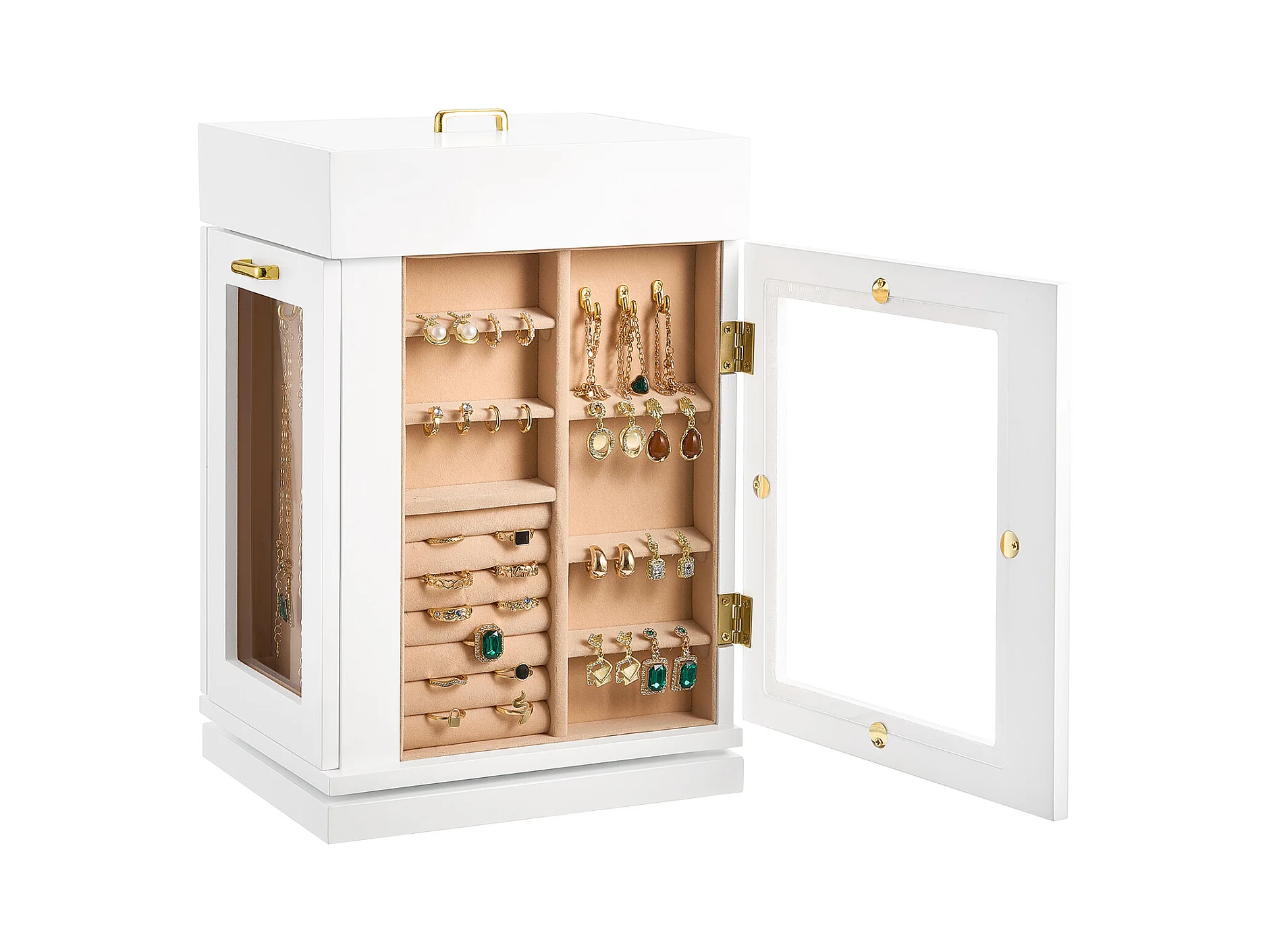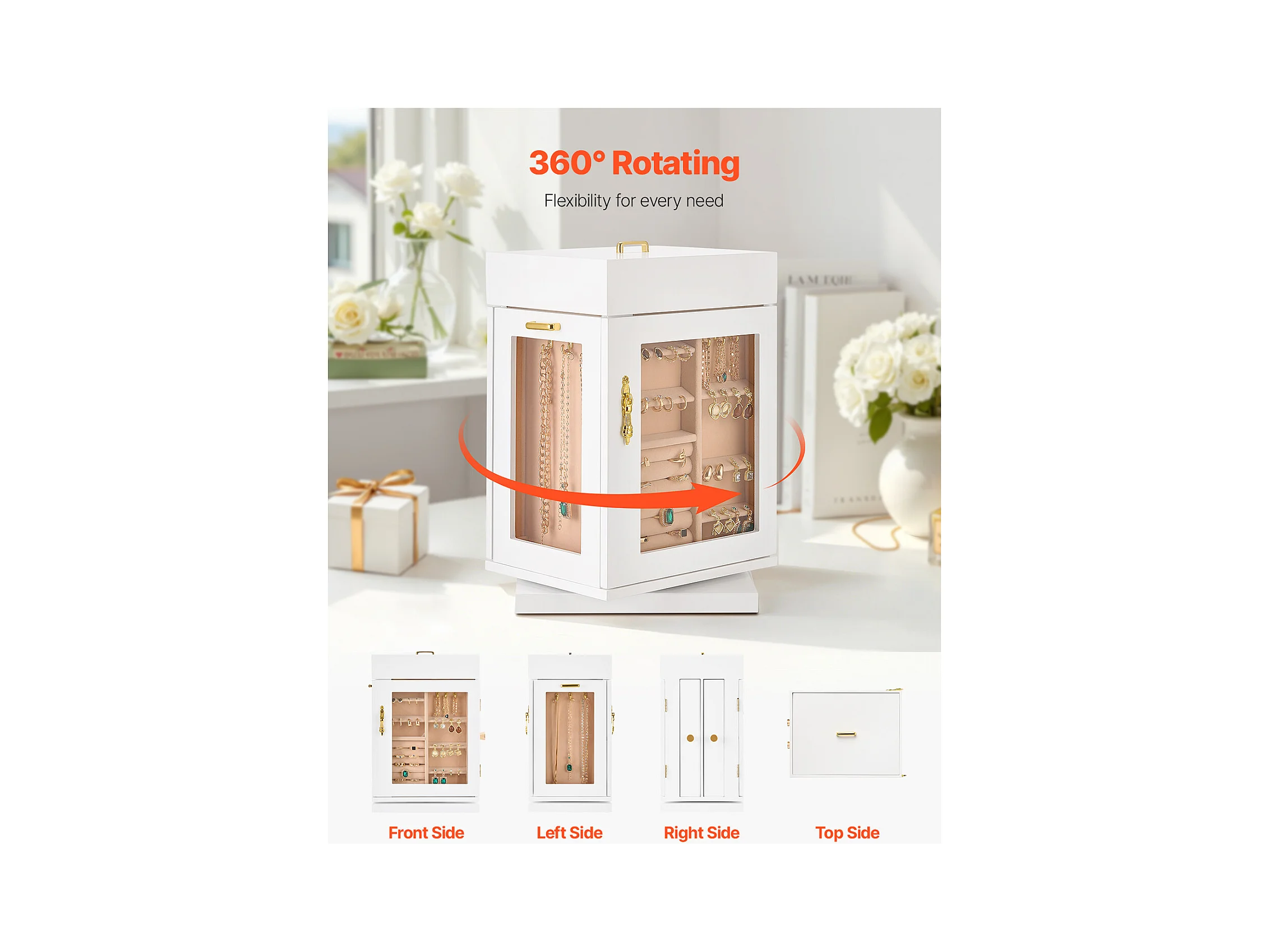 Boîte à Bijoux Rotative SucceBuy à 360°, avec Porte Magnétique, Fenêtre en Acrylique, 4 Crochets Intégrés de Colliers, Poignées Métal, Doublure en Flanelle Douce