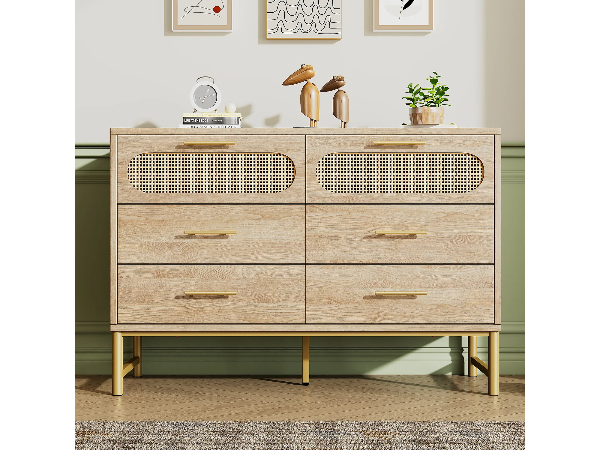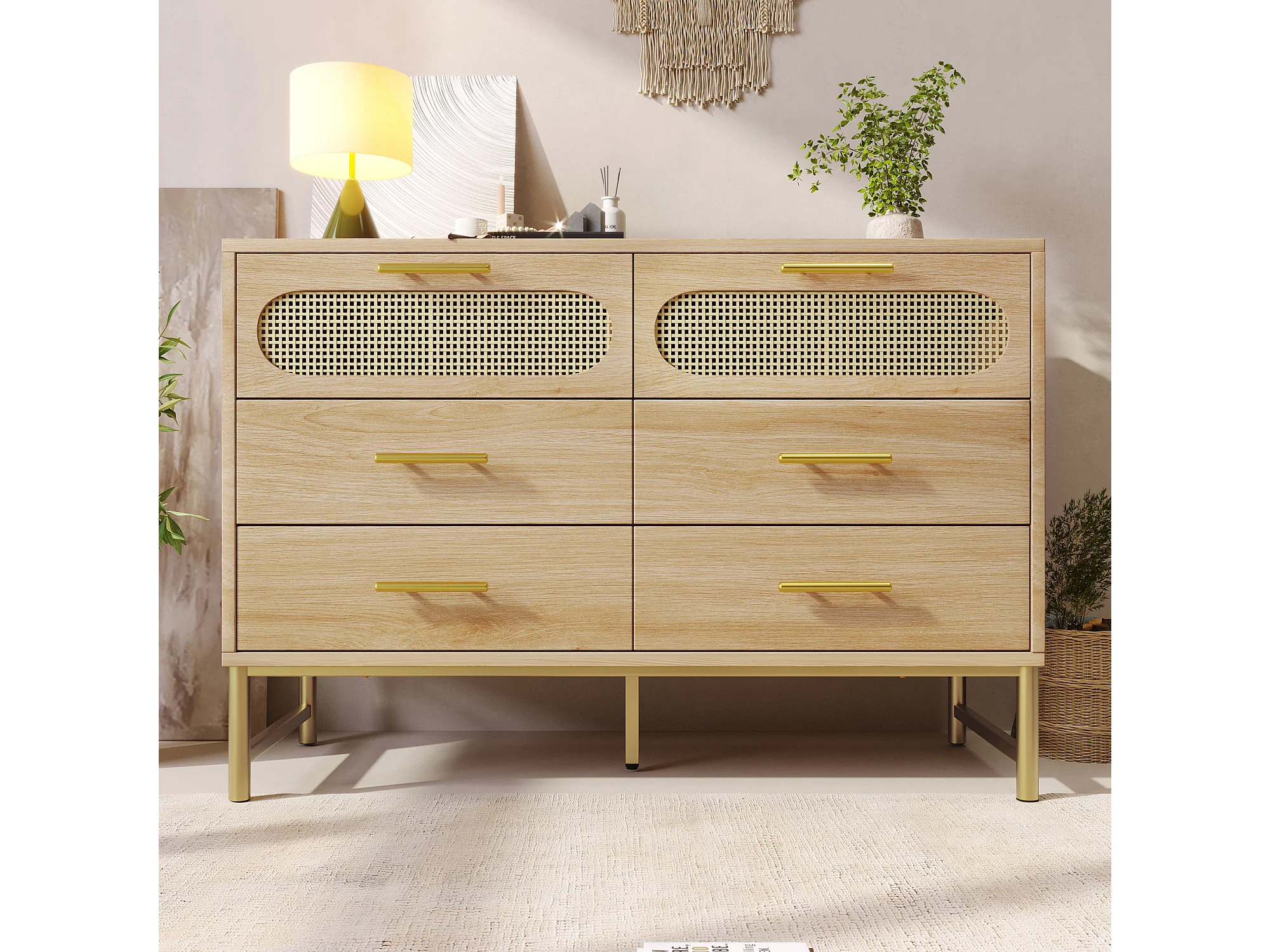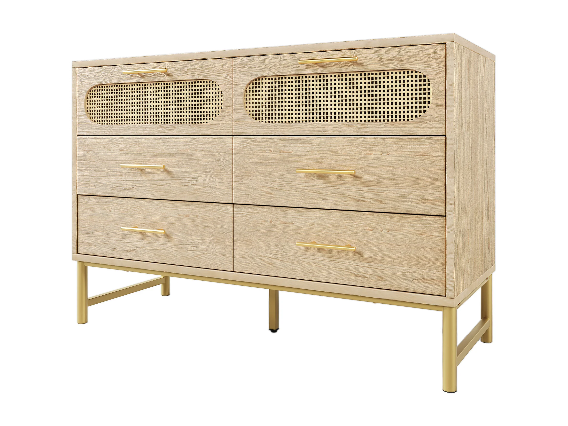 Buffet 120x40x74 cm avec 6 tiroirs - meuble de rangement en bois design rotin - poignées métalliques - chêne
