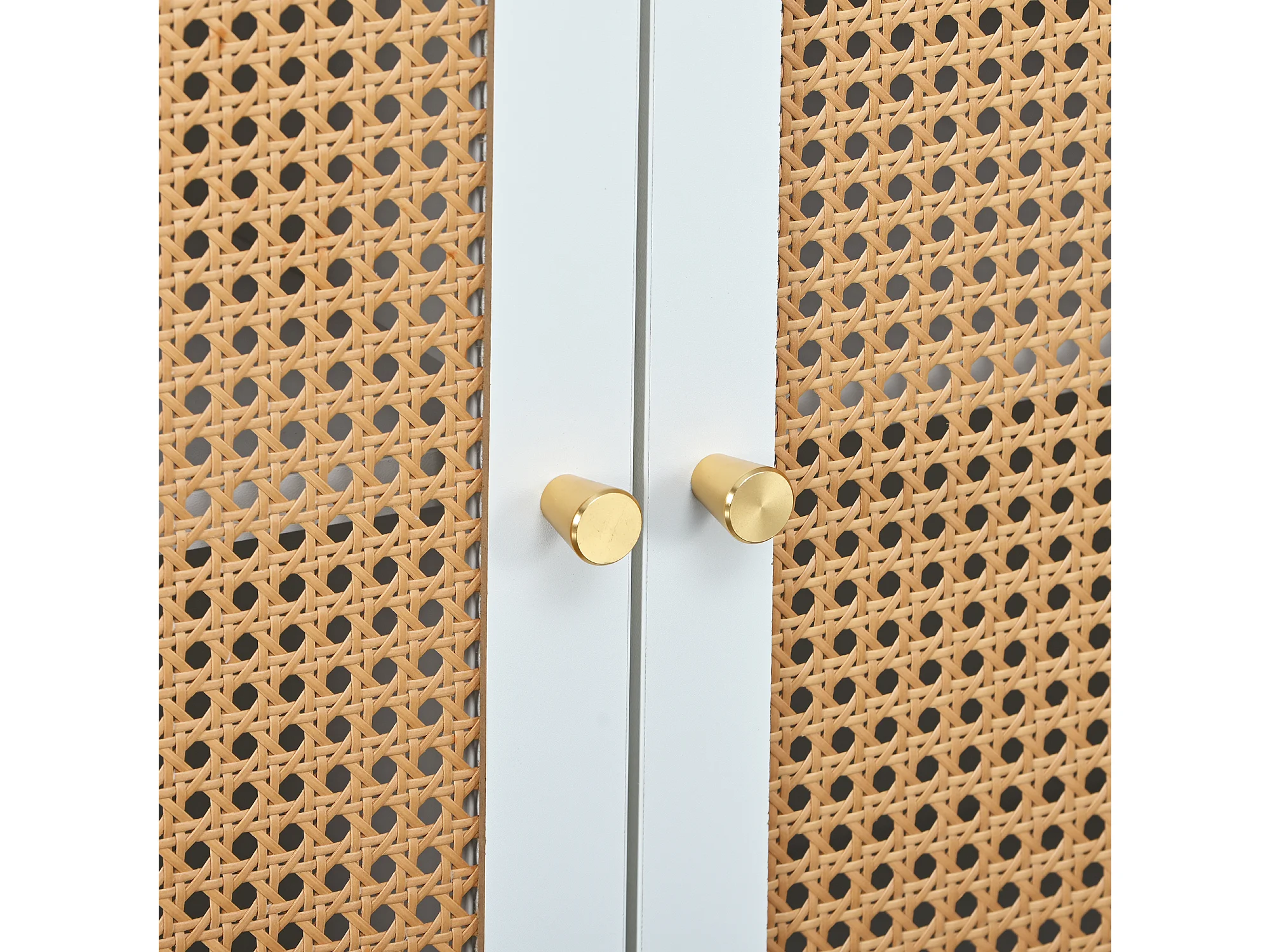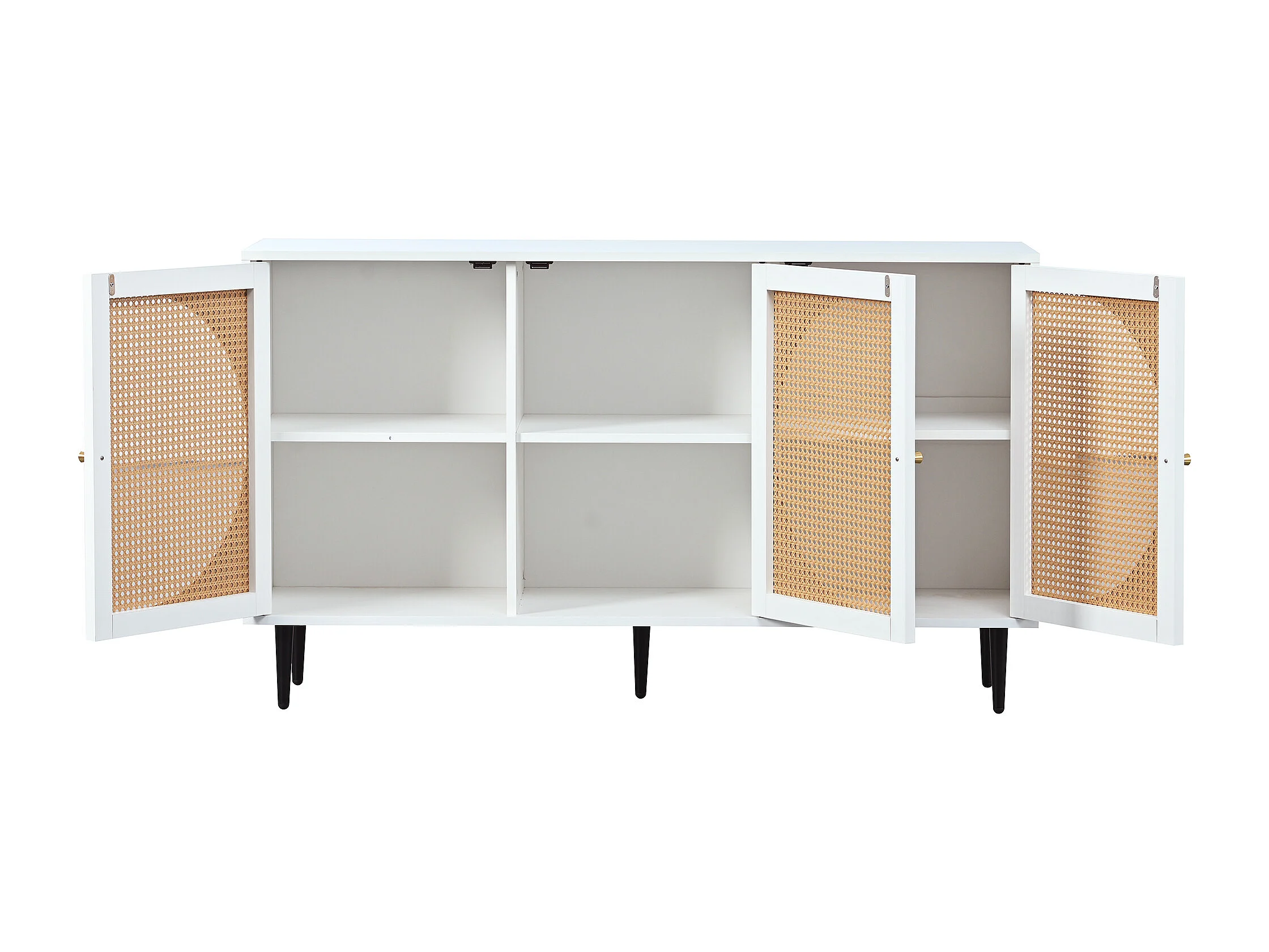 Buffet 129.8x40x76cm avec 3 portes en rotin, corps blanc et pieds noir