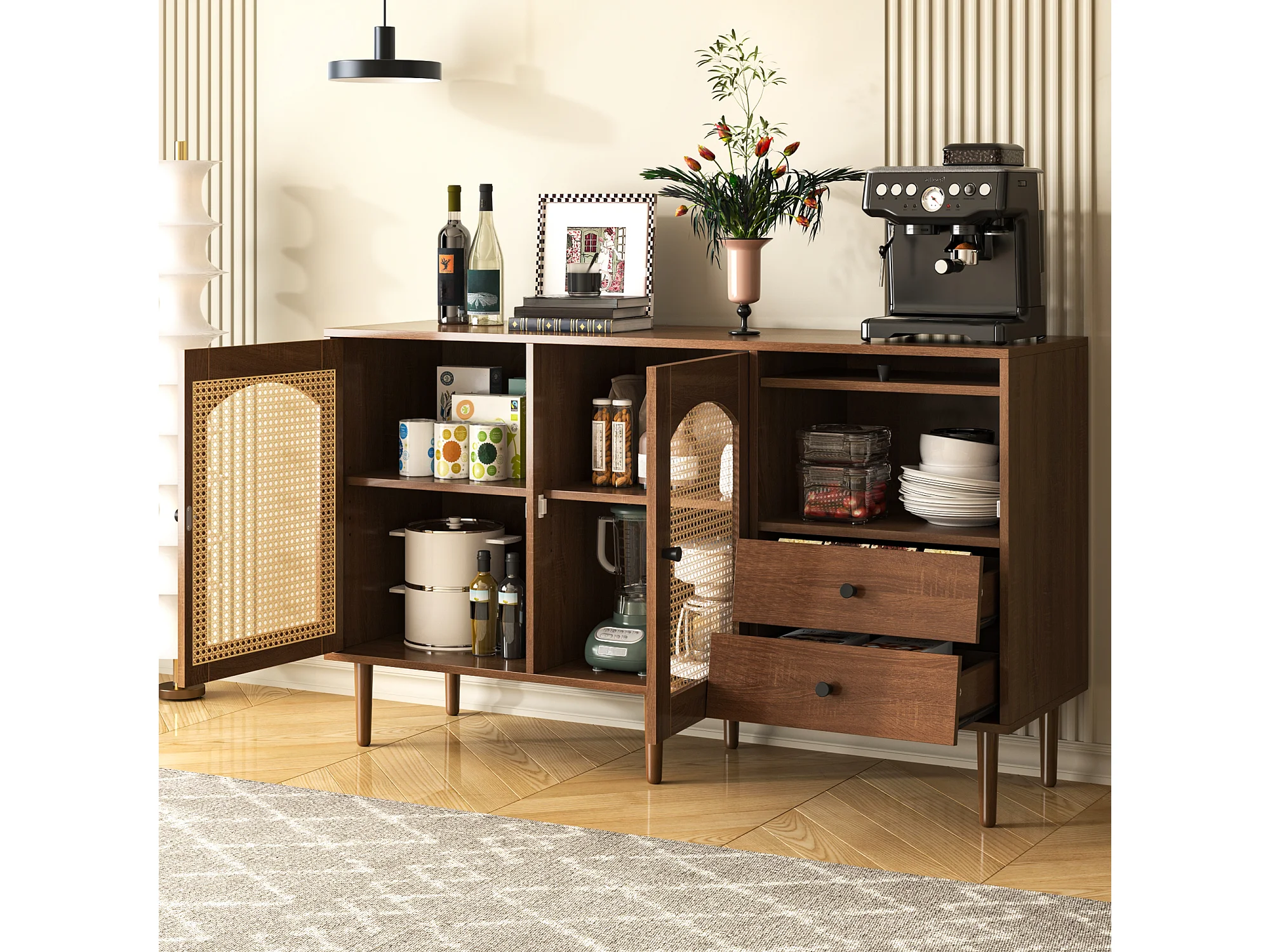 Buffet 130x40x75.5 cm, portes en rotin, étagères réglables, fermeture magnétique, panneau de particules, coloris bois