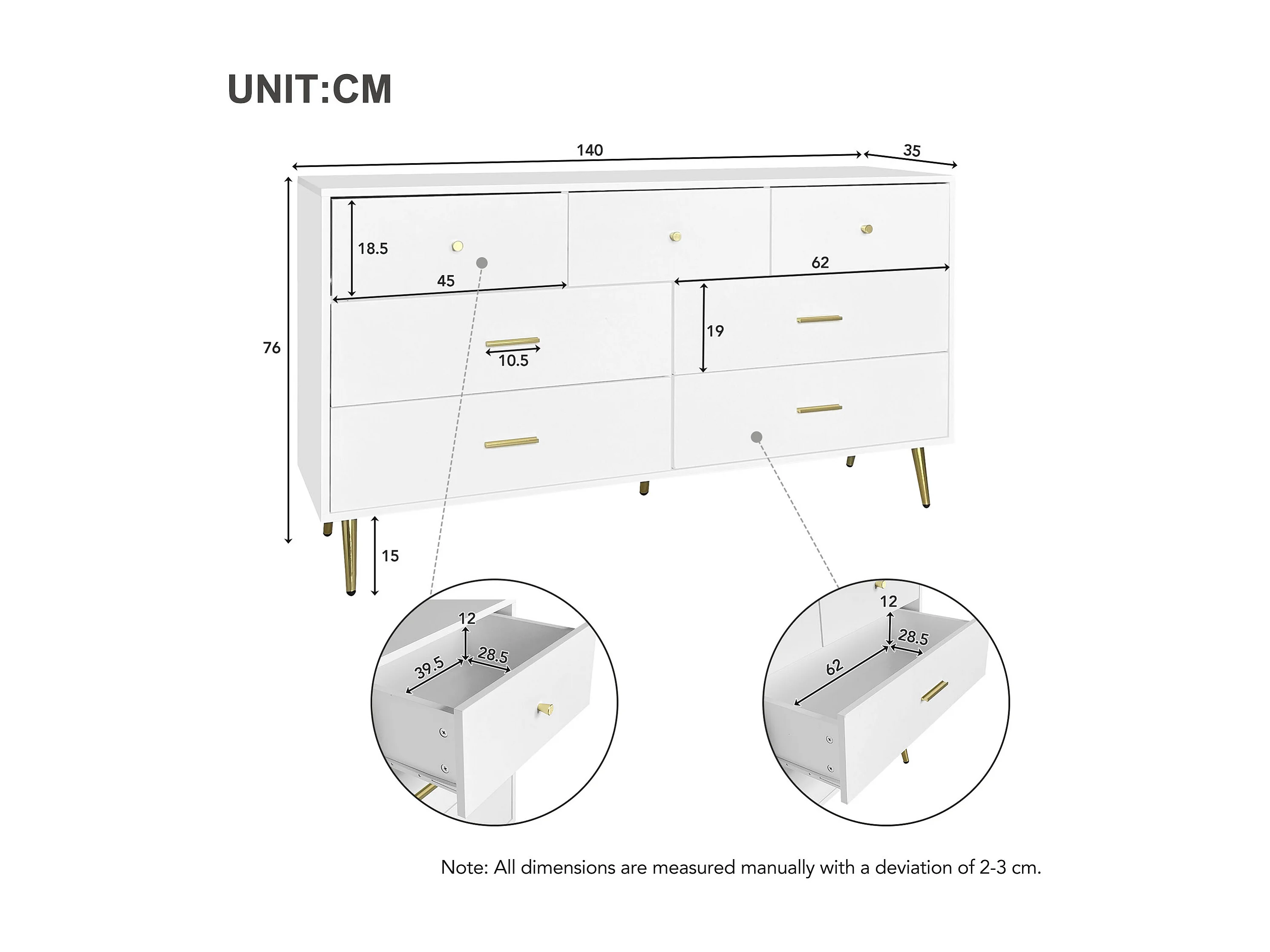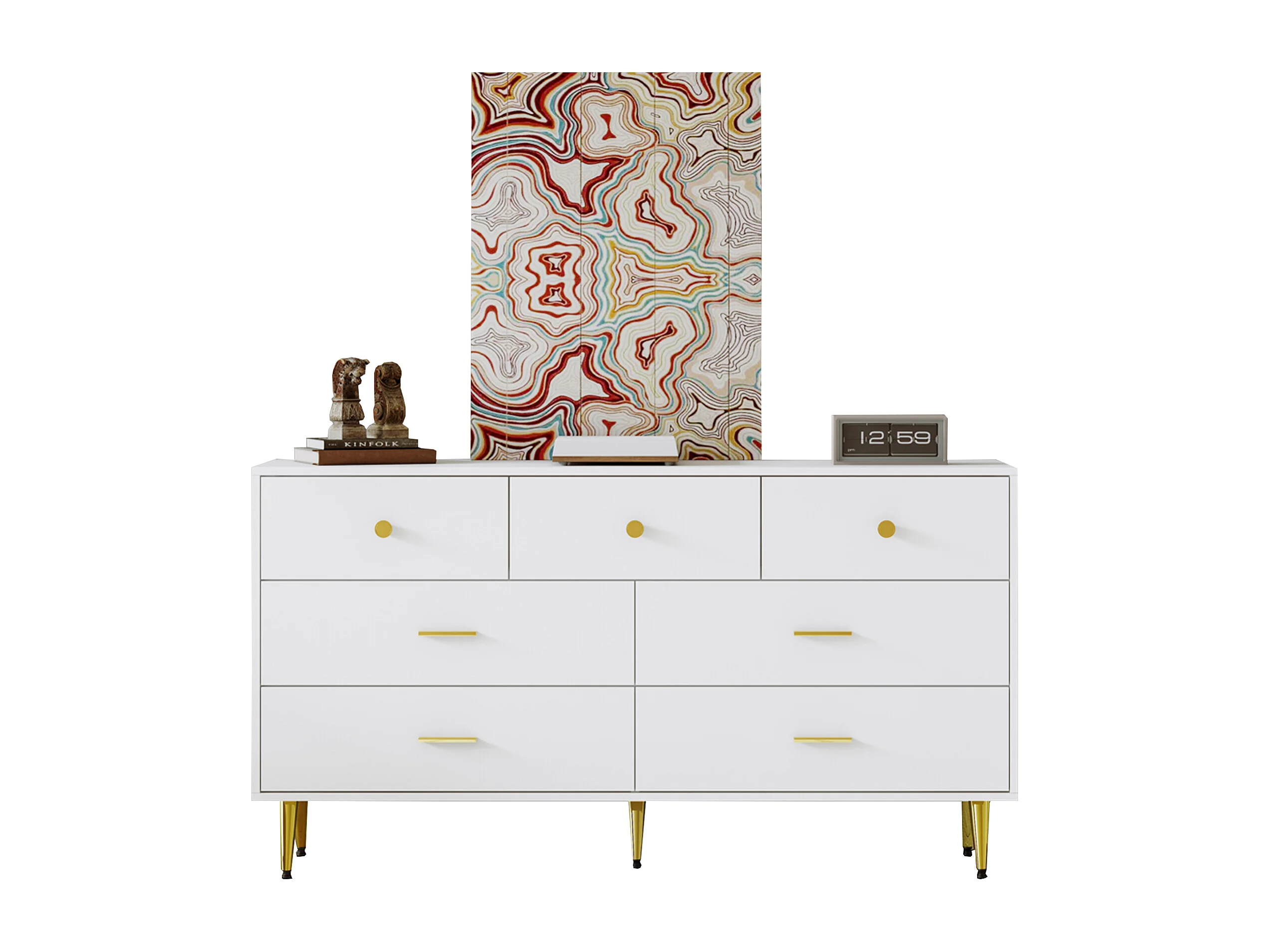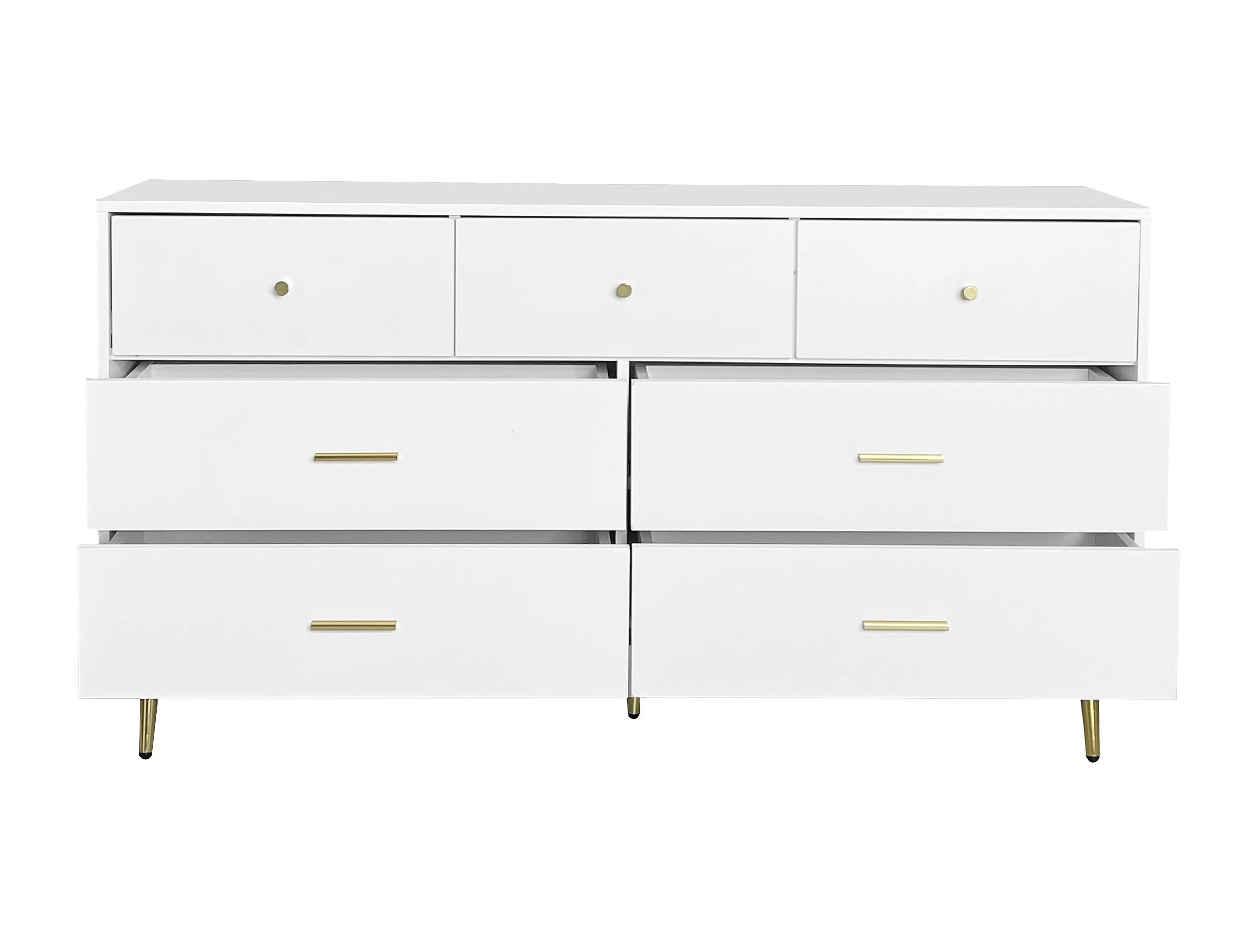 Buffet 140x35x76 cm, 7 tiroirs à glissières fluides, poignées et pieds dorés, panneaux de particules blanc
