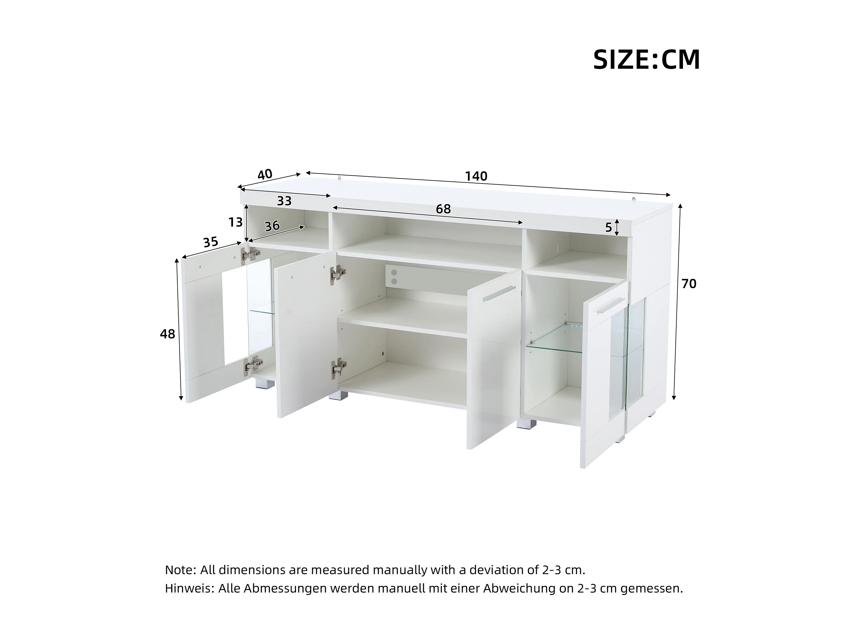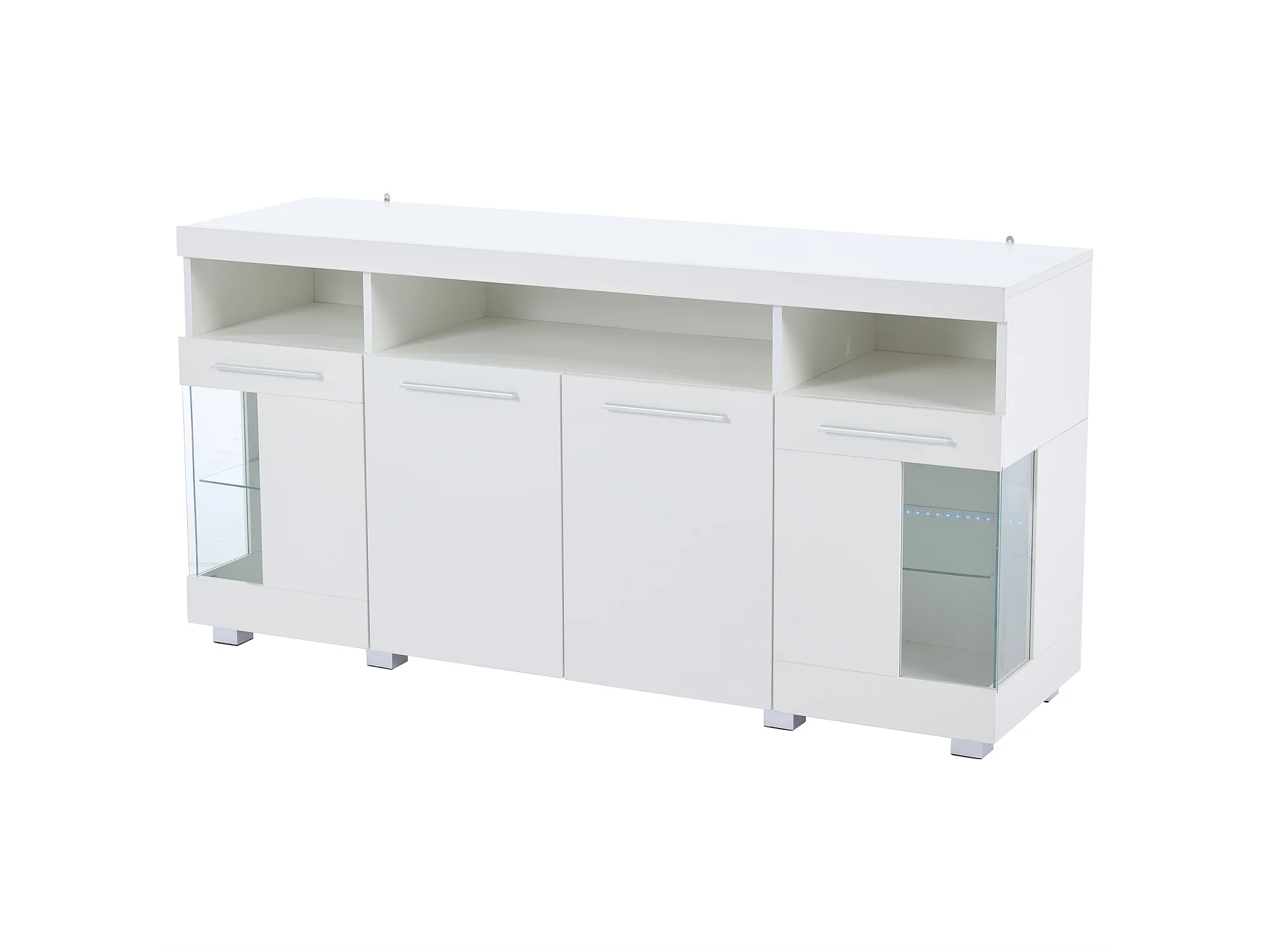 Buffet 140x40x70 cm avec LED en 4 portes et verre décoratif - meuble de rangement - bois - blanc
