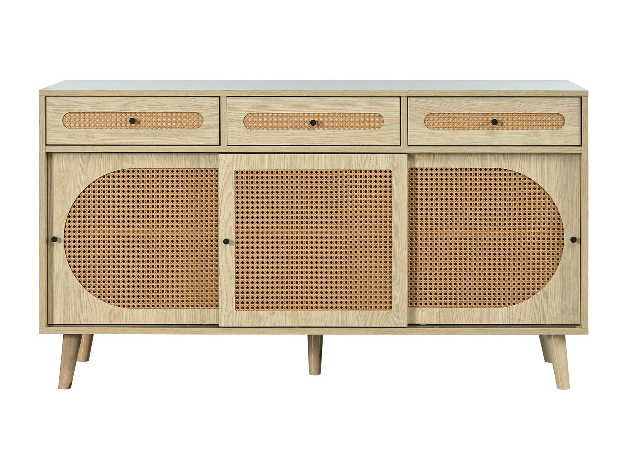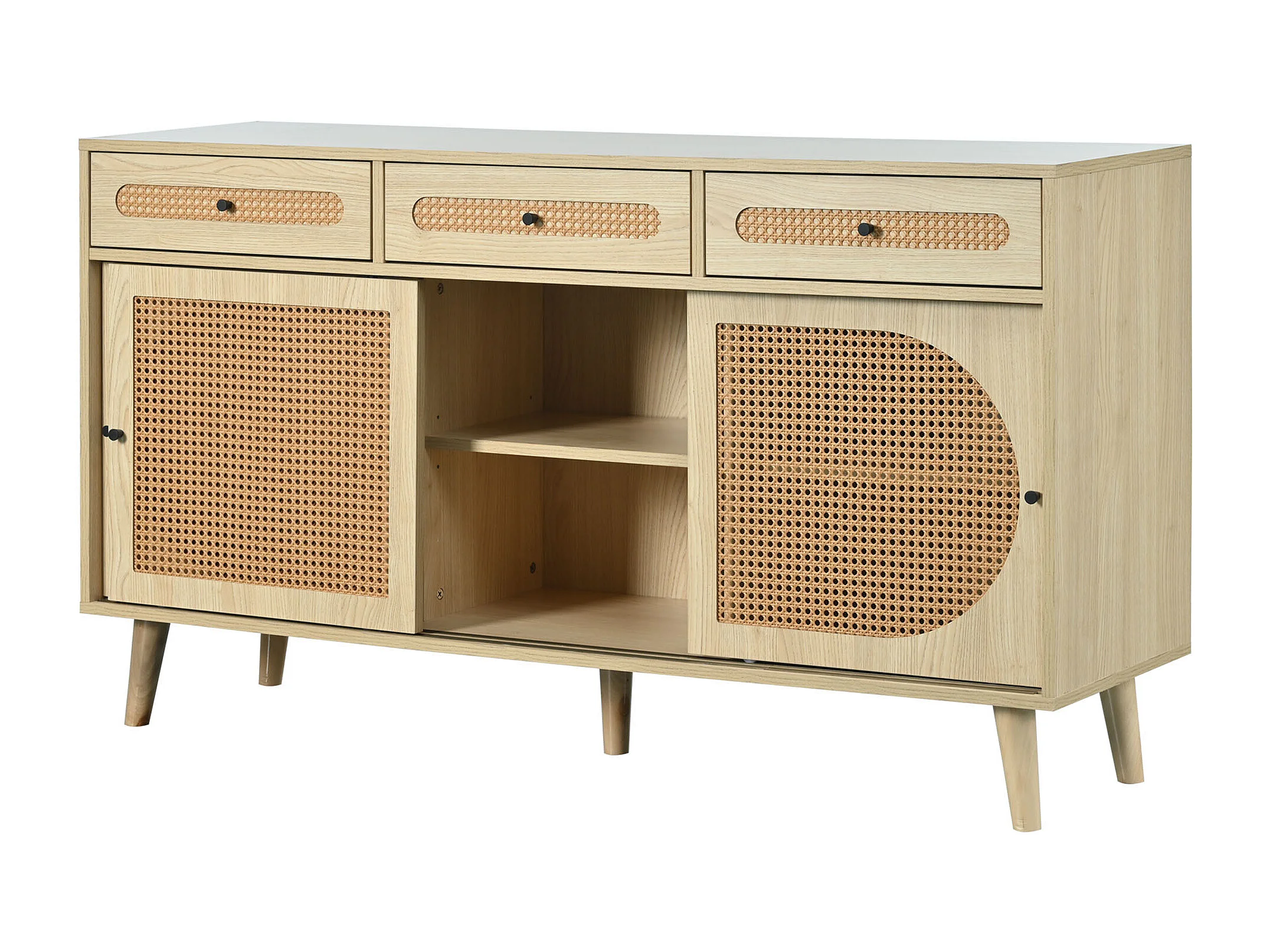 Buffet 140x40x78 cm 3 portes coulissantes en rotin 3 tiroirs - meuble de rangement en bois - chêne